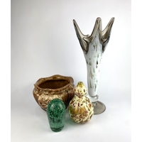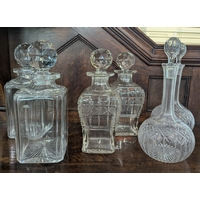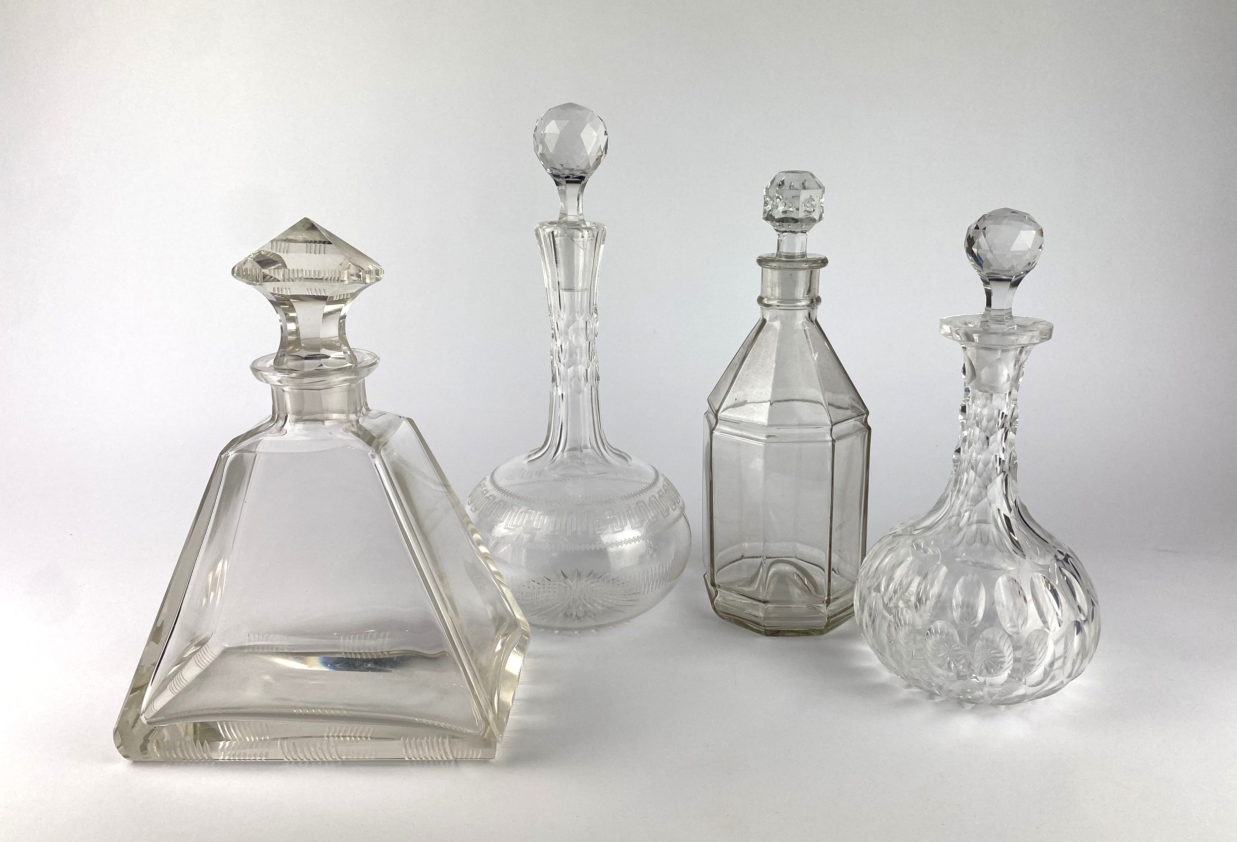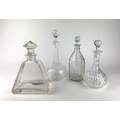 Two Victorian / Edwardian cut glass decanters of shaft and globe form tallest 30cm, and two Art Deco style glass decanters including one of pyramid form 24.5cm high