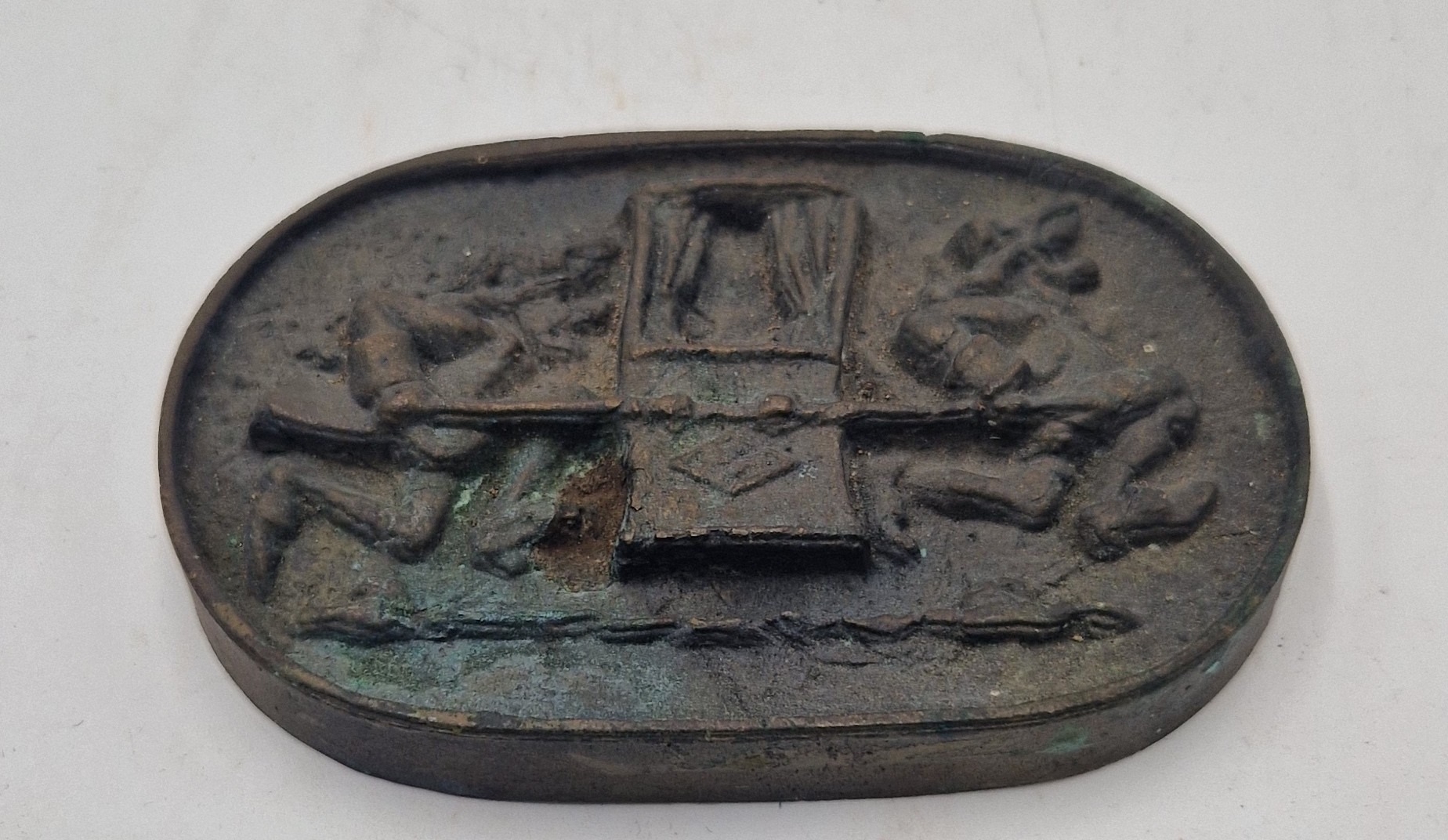 BRONZE 10cm PLAQUE DEPICTING WHAT APPEARS TO BE A CARRIAGE BEING CARRIED AWAY BY TWO THIEVES