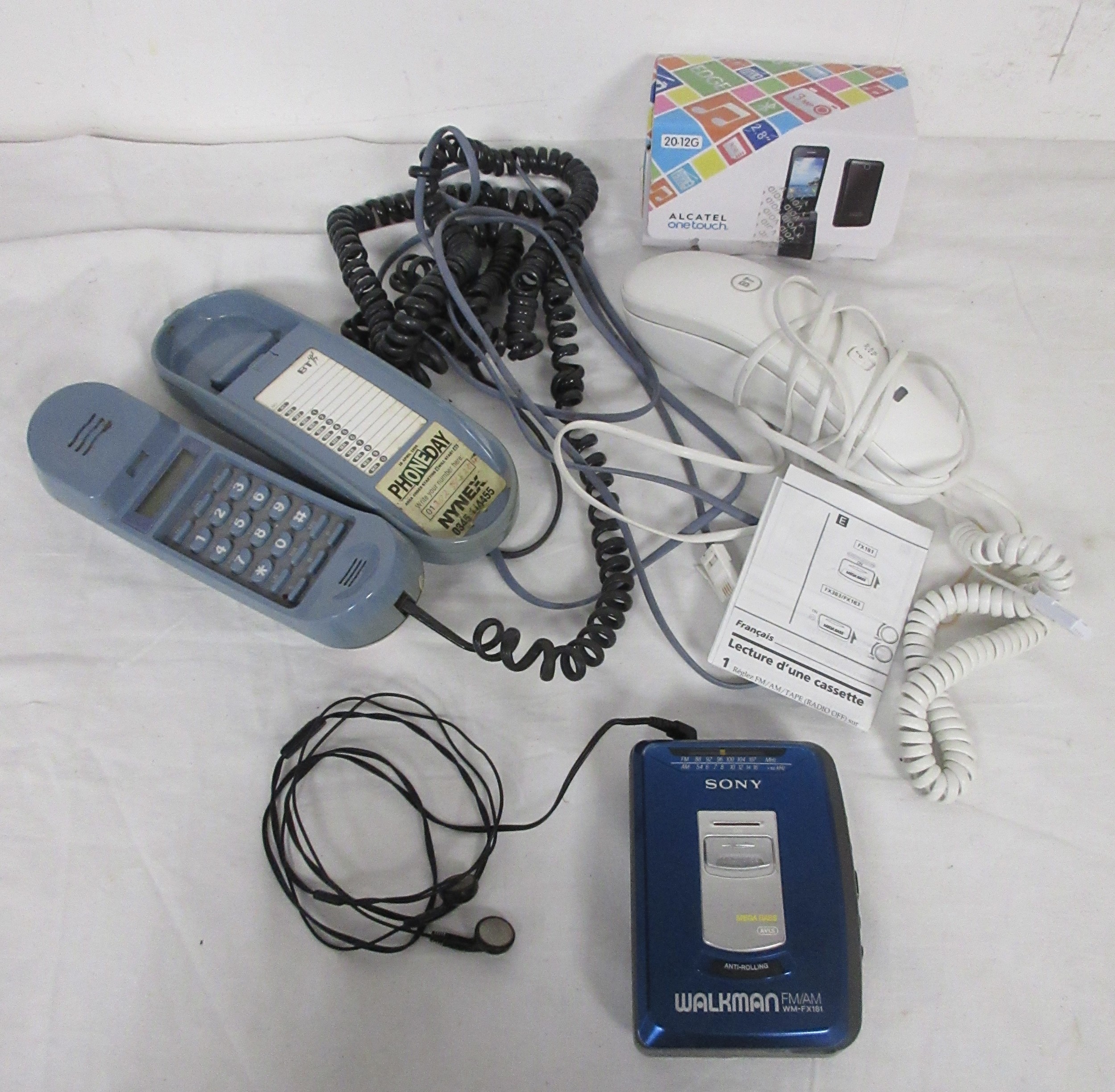 A Sony Walkman model WM-FX181 with headphones, a pair of vintage BT telephone and a boxed mobile phone