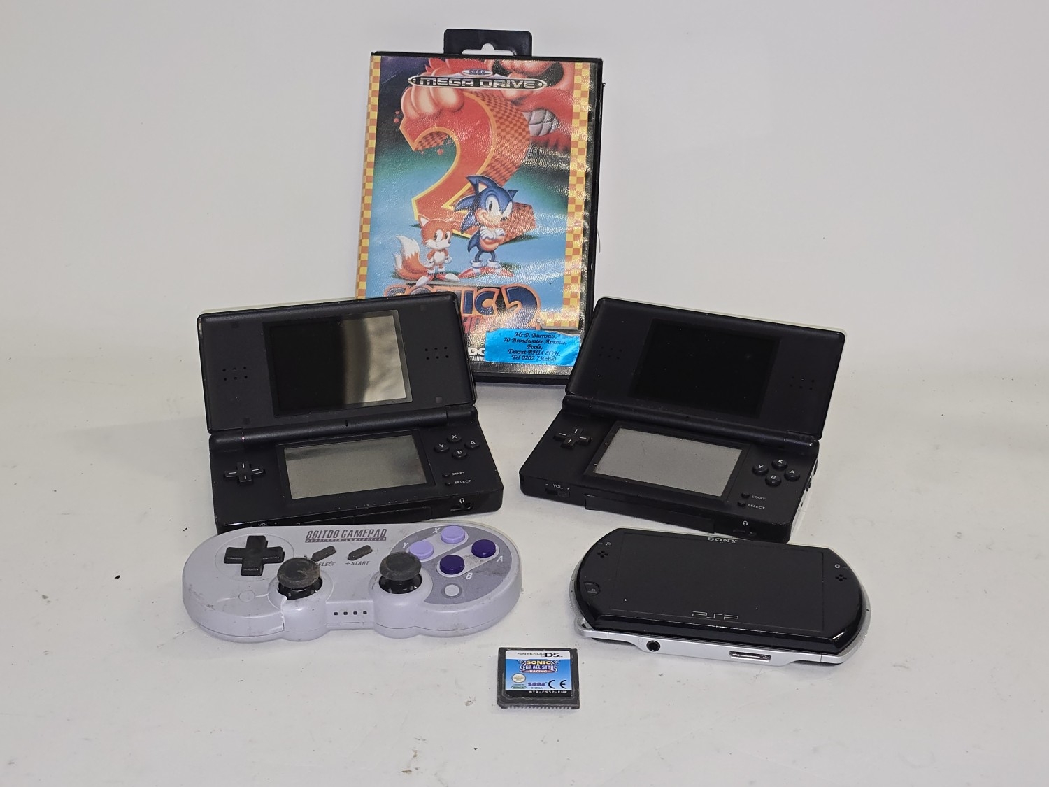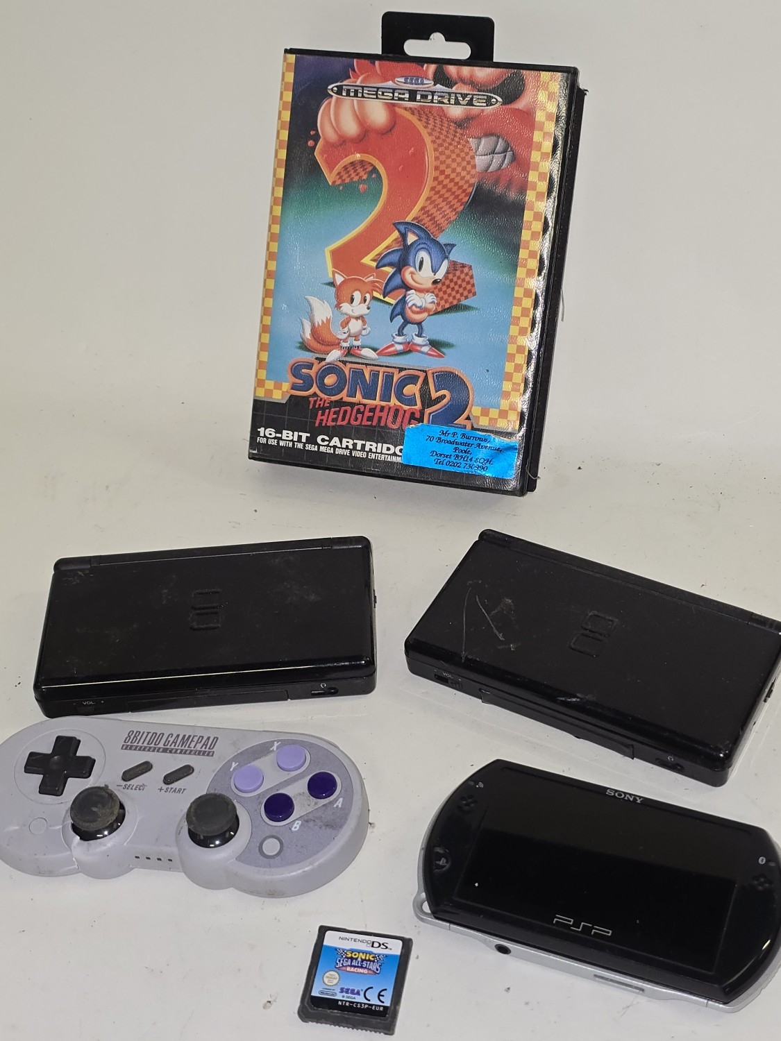 Vintage gaming to include 2 x Nintendo DS Lite consoles, Sega Mega Drive Sonic the Hedgehog 2 cartridge, Sony PSP console and Sonic & Sega All-Stars Racing DS Cartridge.