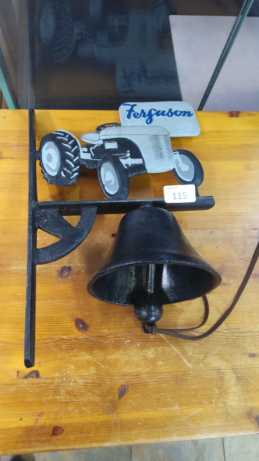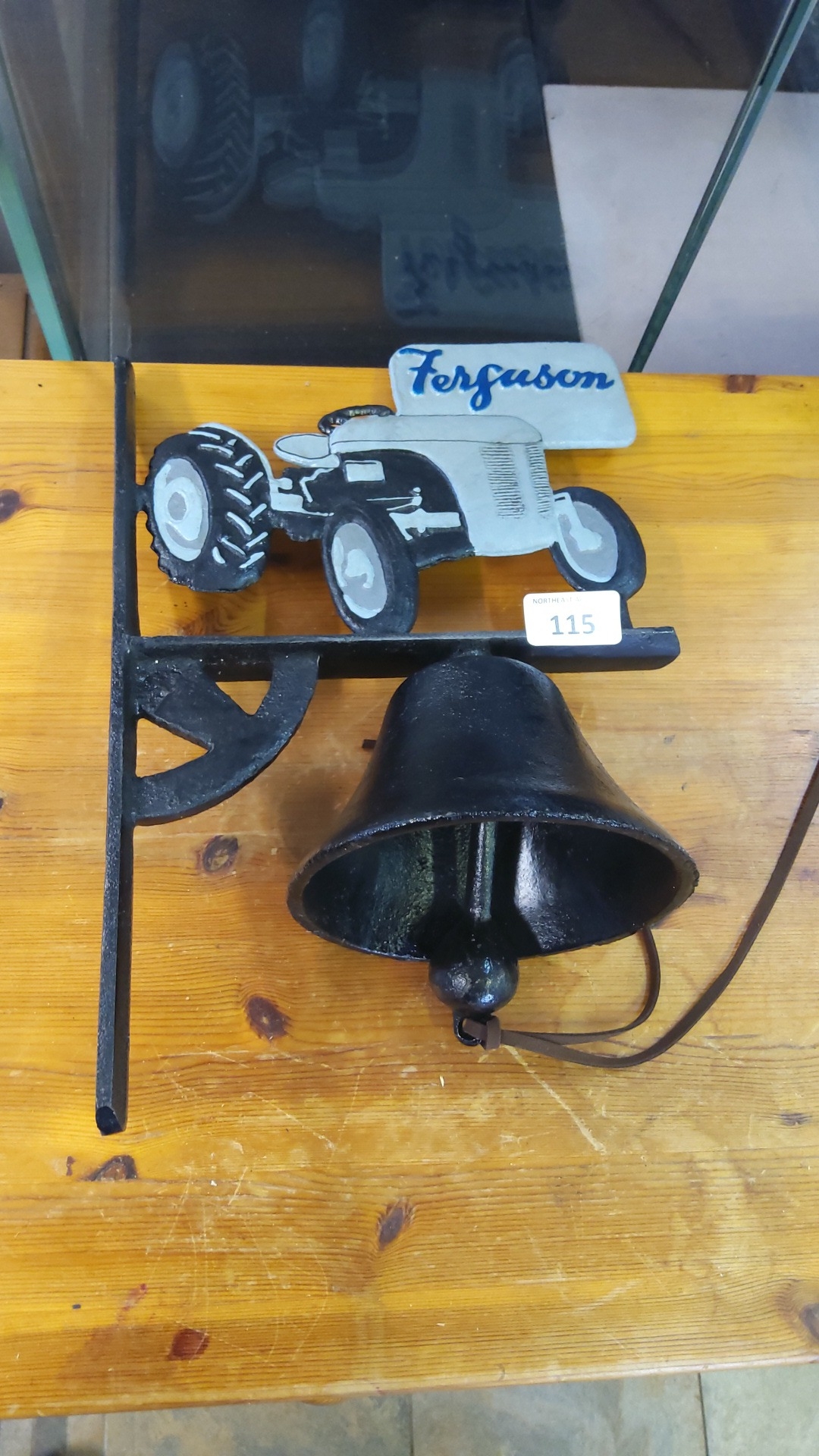 Cast iron wall-mounted bell, the bracket surmounted by a painted silhouette of a Ferguson tractor with script cartouche, complete with clapper and pull.
