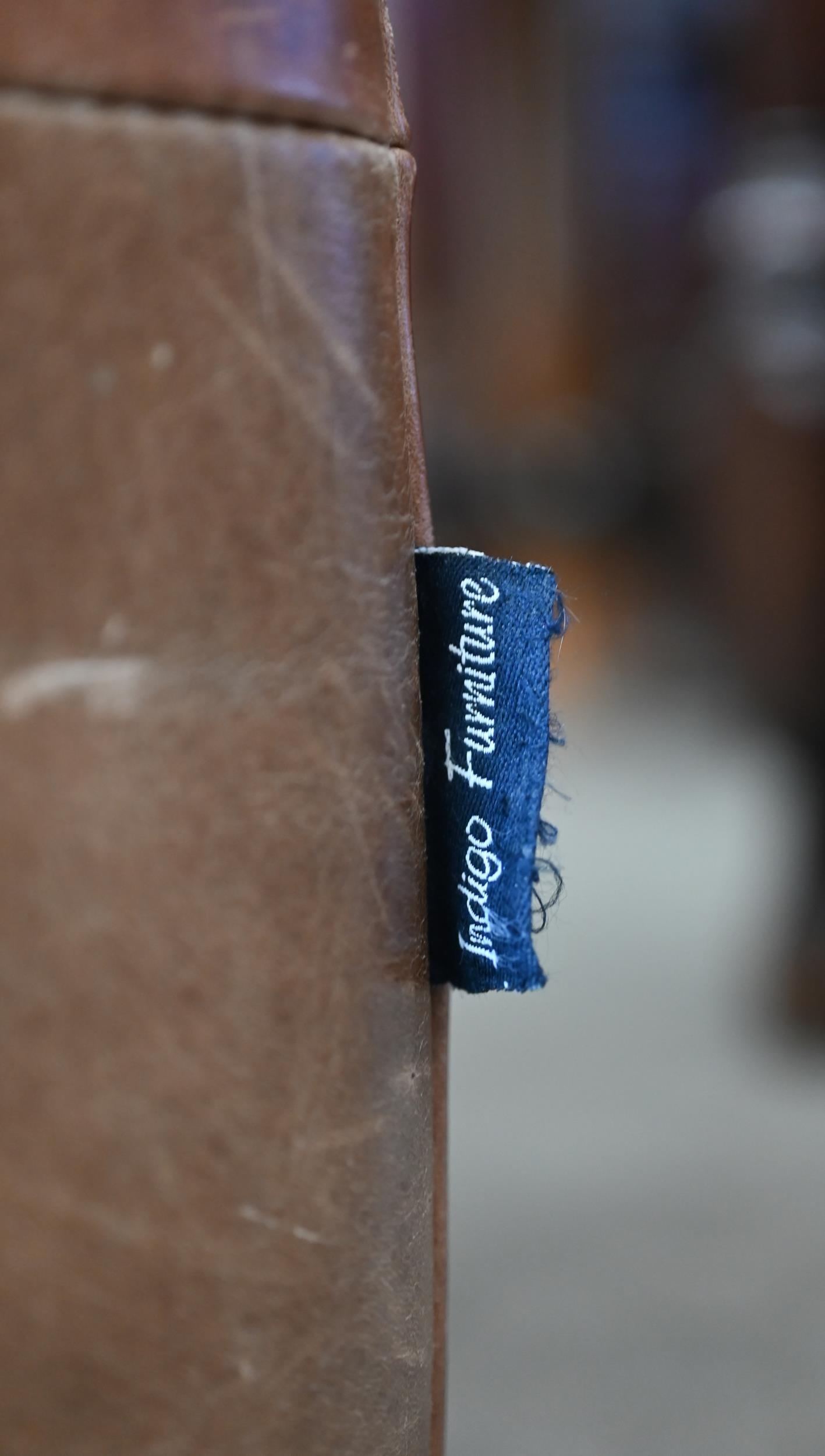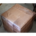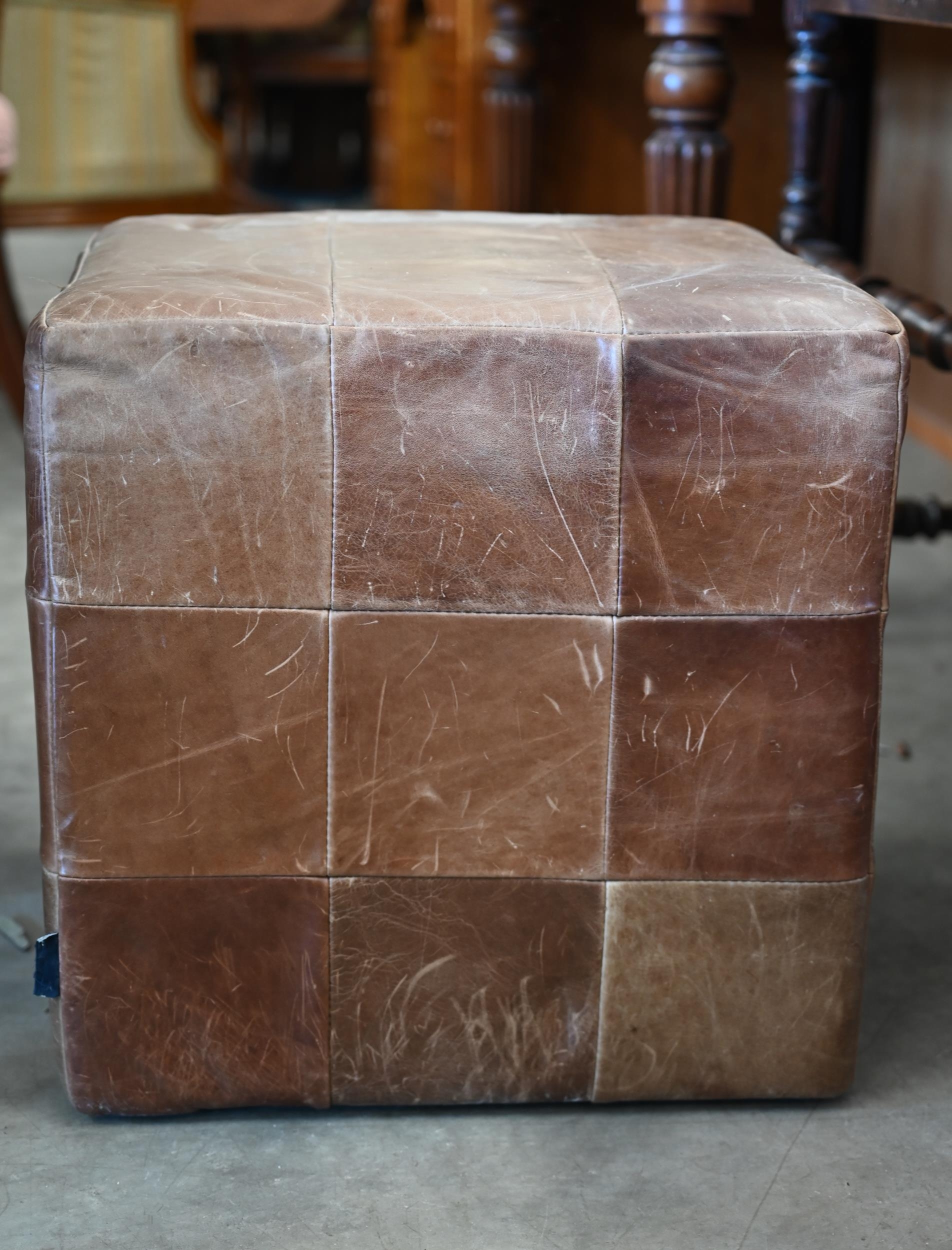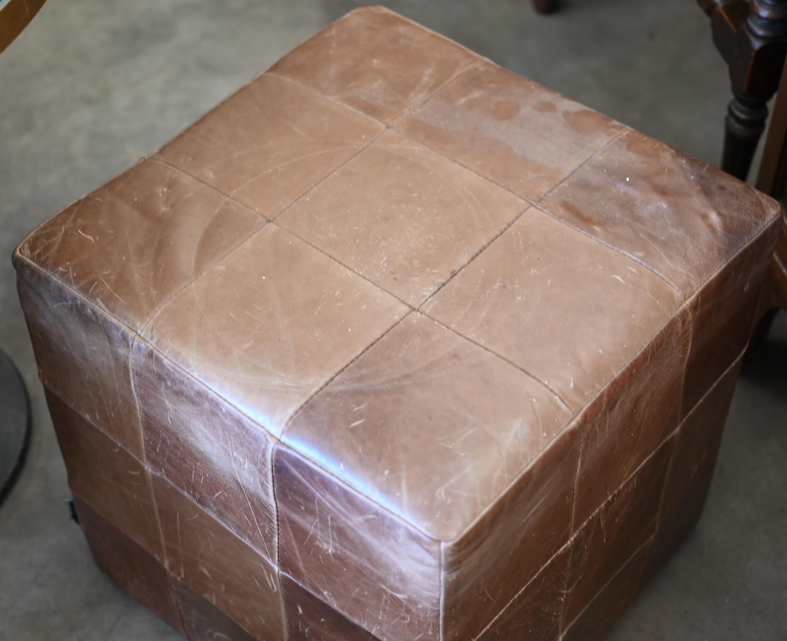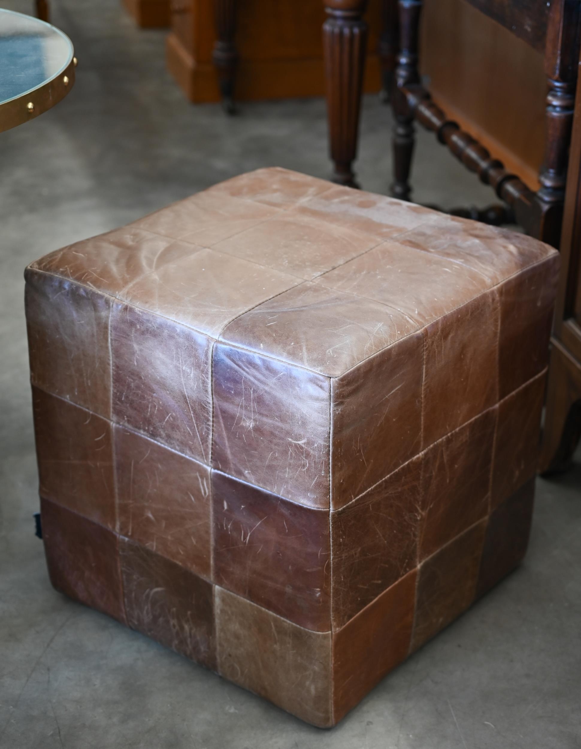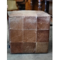 An Indigo furniture patchwork stitched tan leather cube footstool, 45 cm³