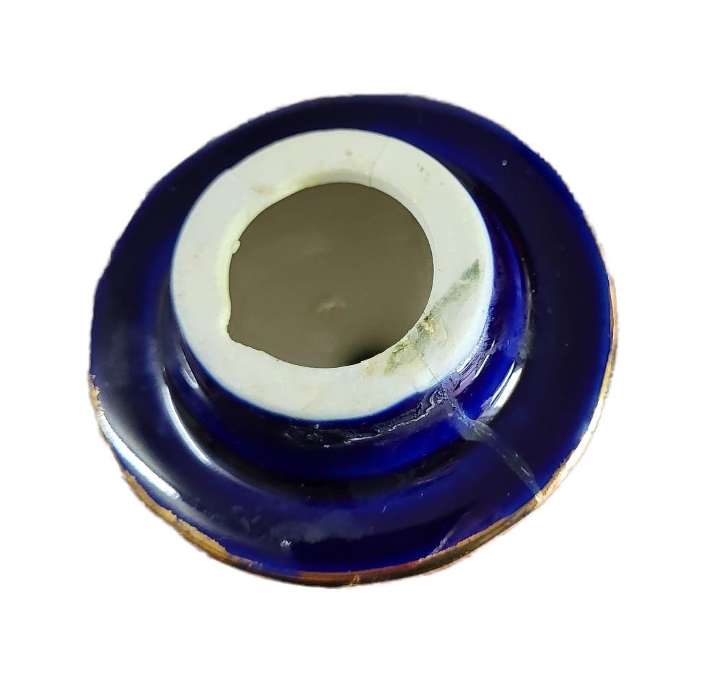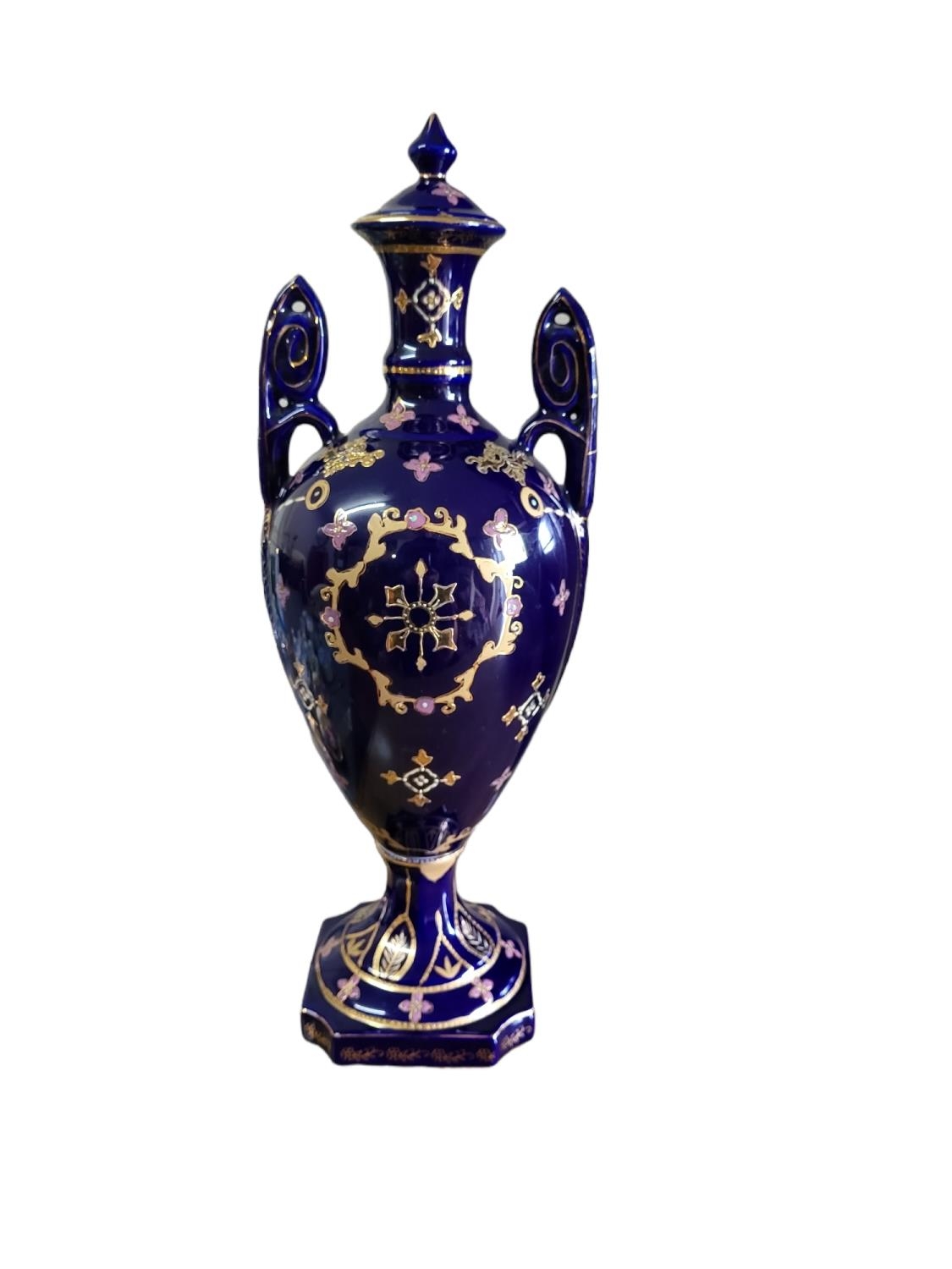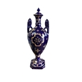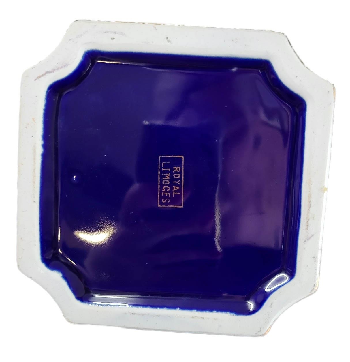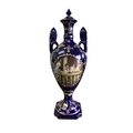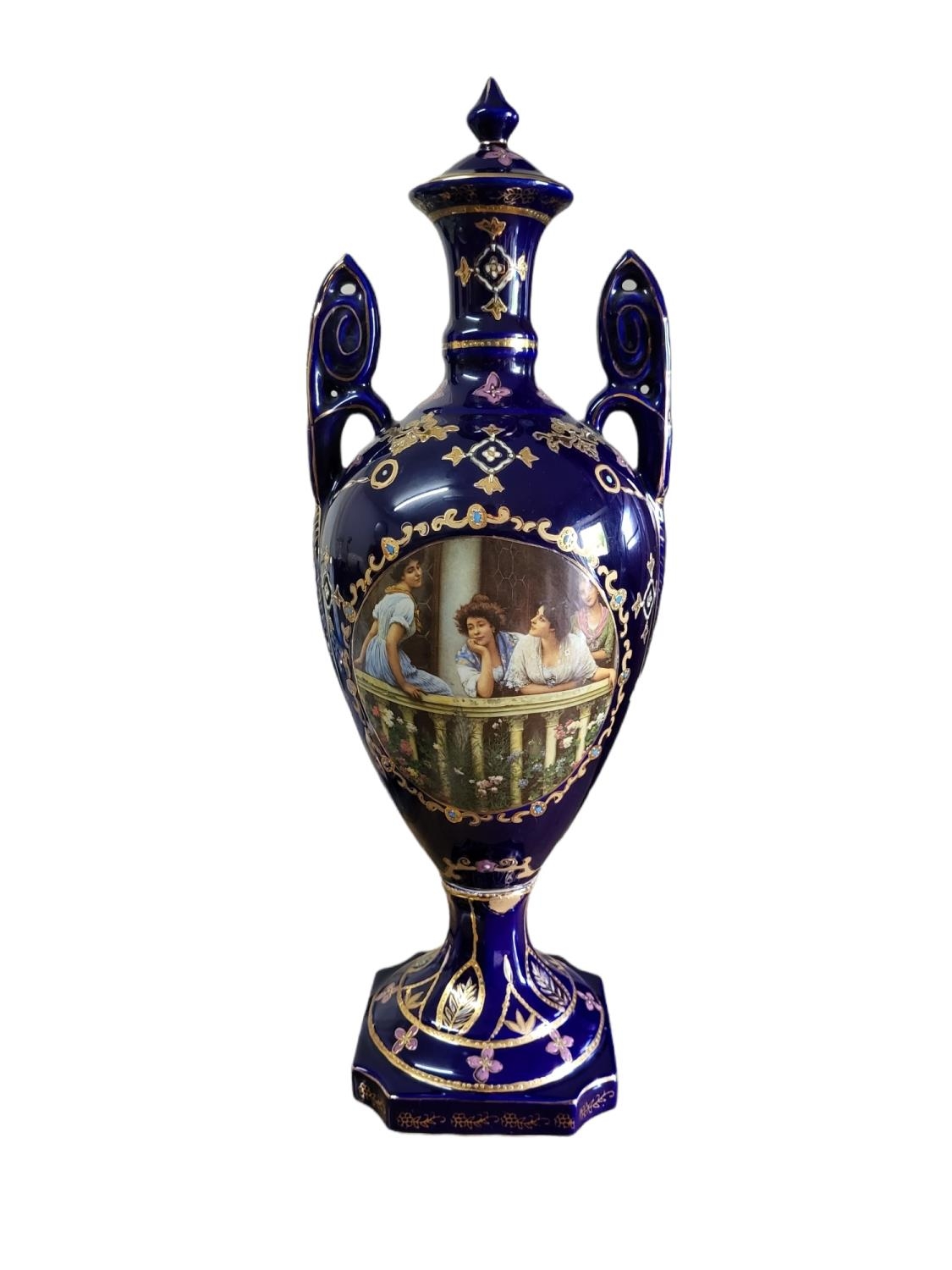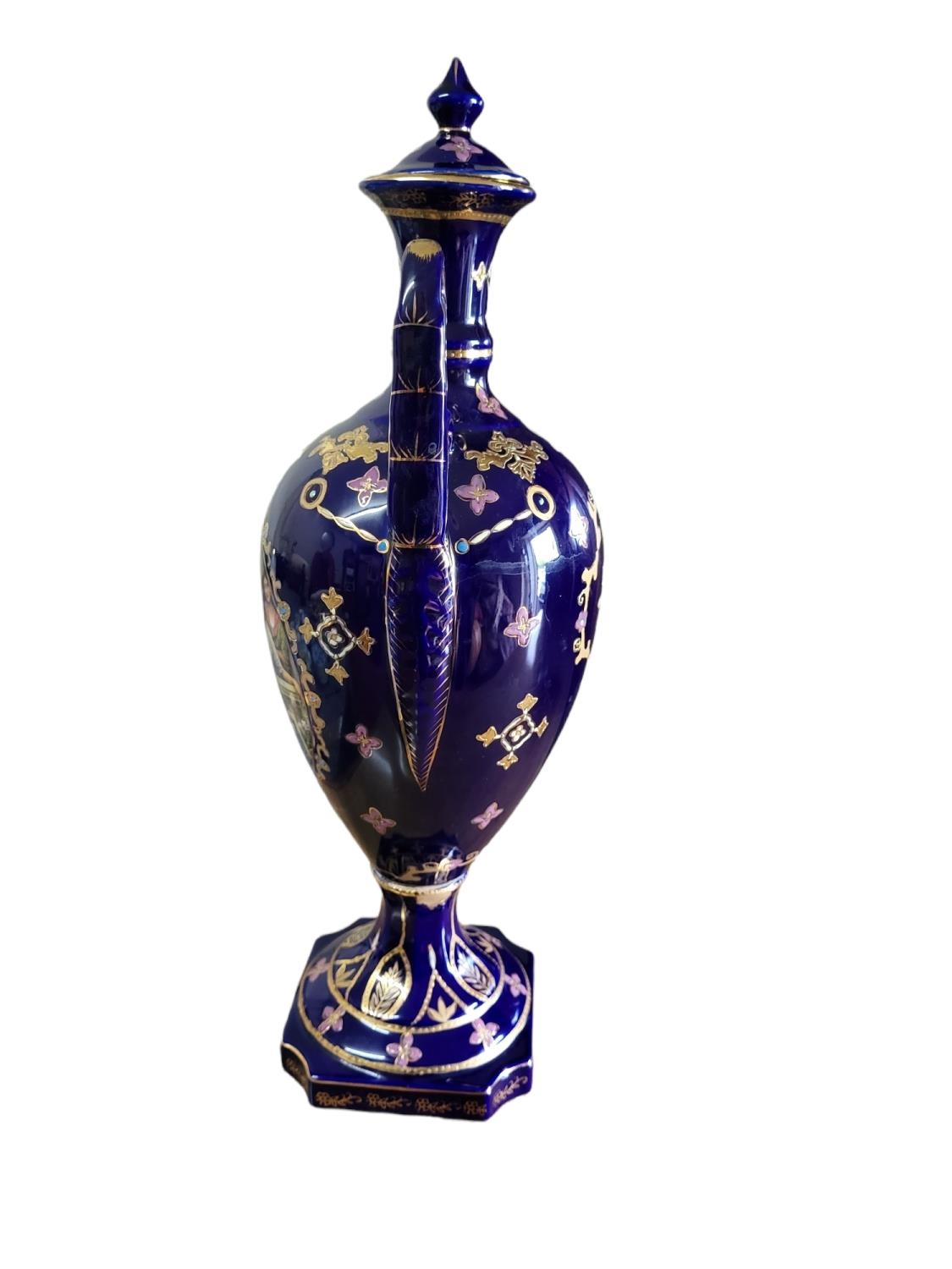 Twin handled, with transfer printed figural cartouche on a Royal blue and gilt ground, marked to base 'Royal Limoges'.