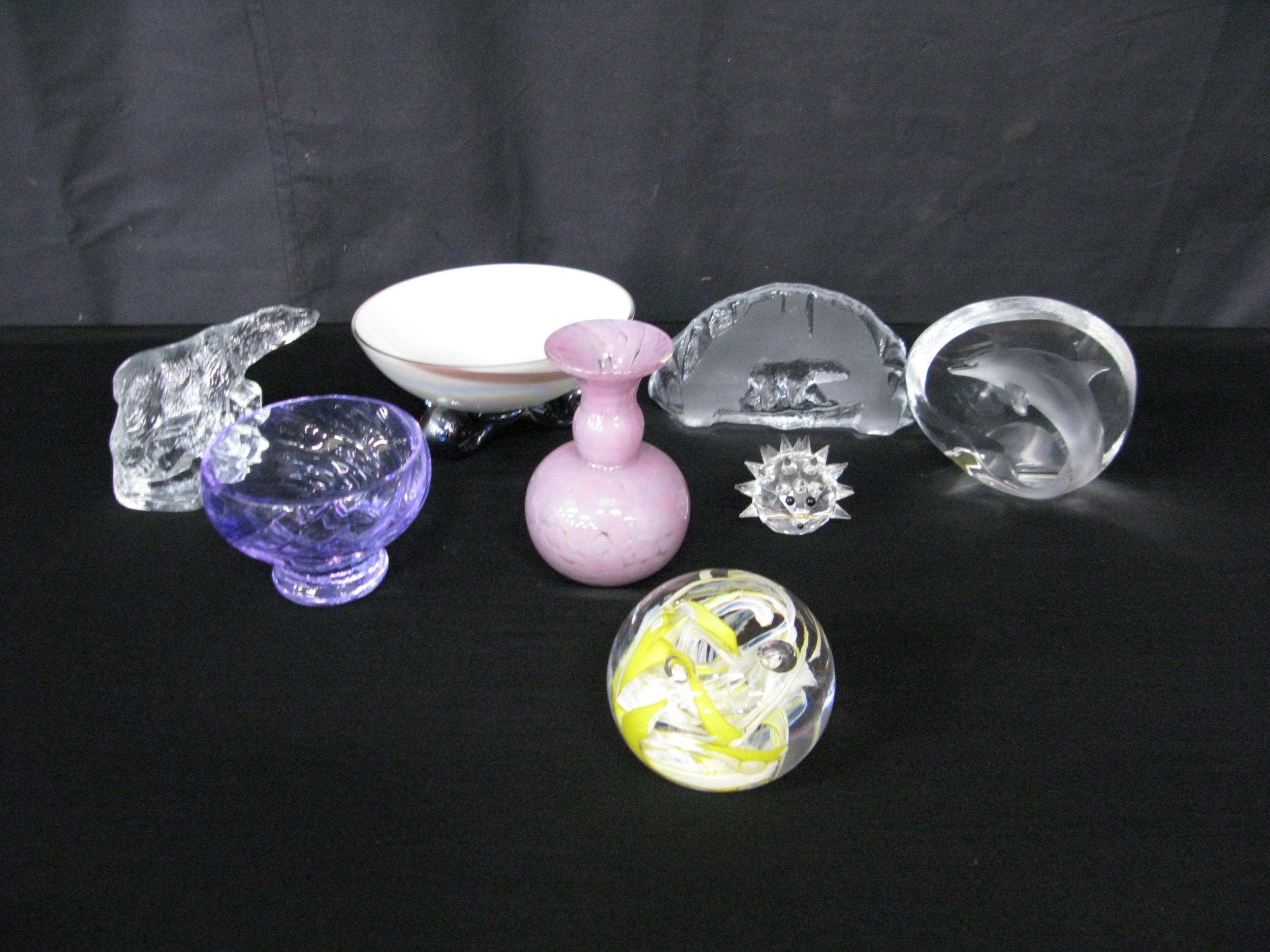 Eight items of glassware to include: Mats Jonasson dolphin paperweight number 7529, two polar bear paperweights together with a Caithness glass bowl - 9.5cm dia x 7cm tall and a Swarovski hedgehog etc