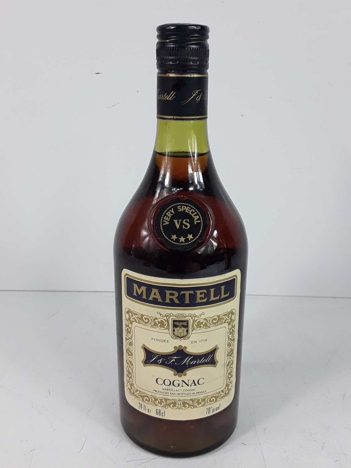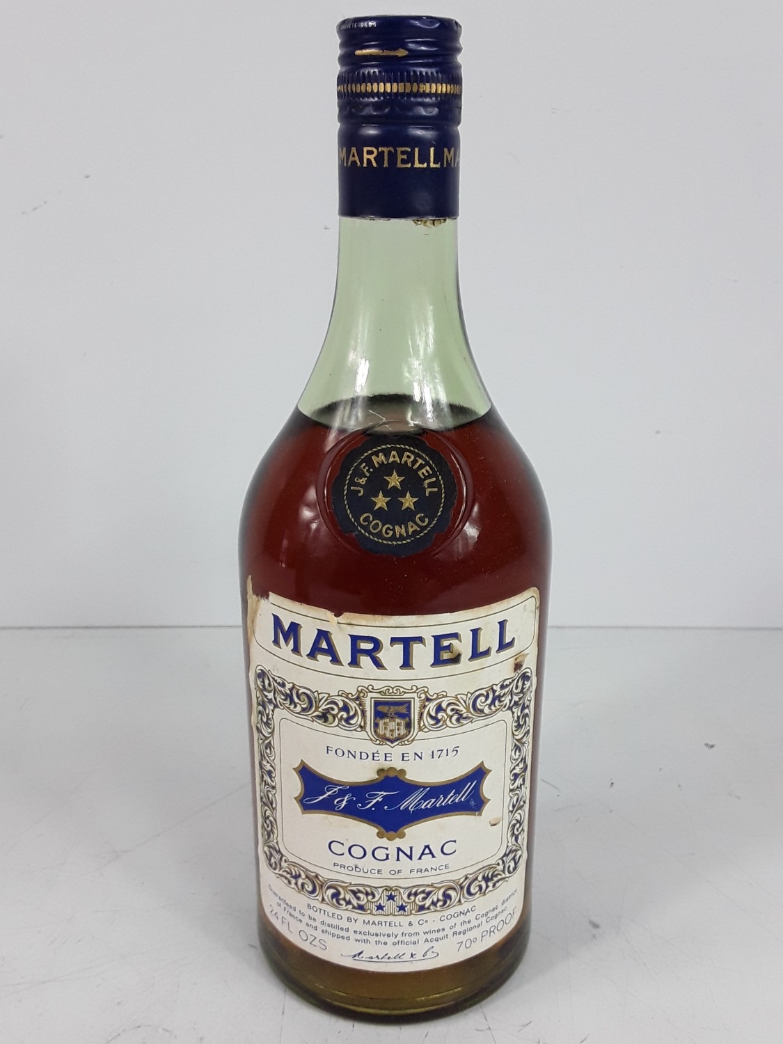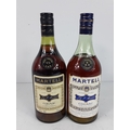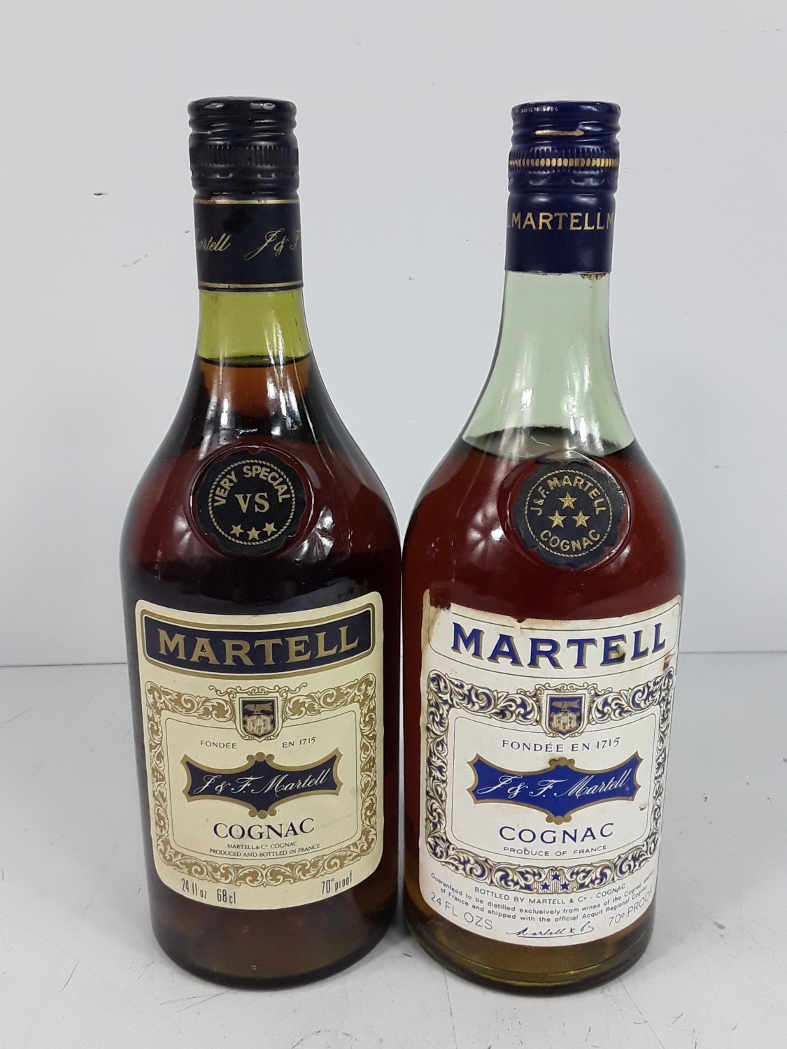Two bottles of Martell Three Stars Cognac, 24 fl.ozs, 70% proof, 1970's