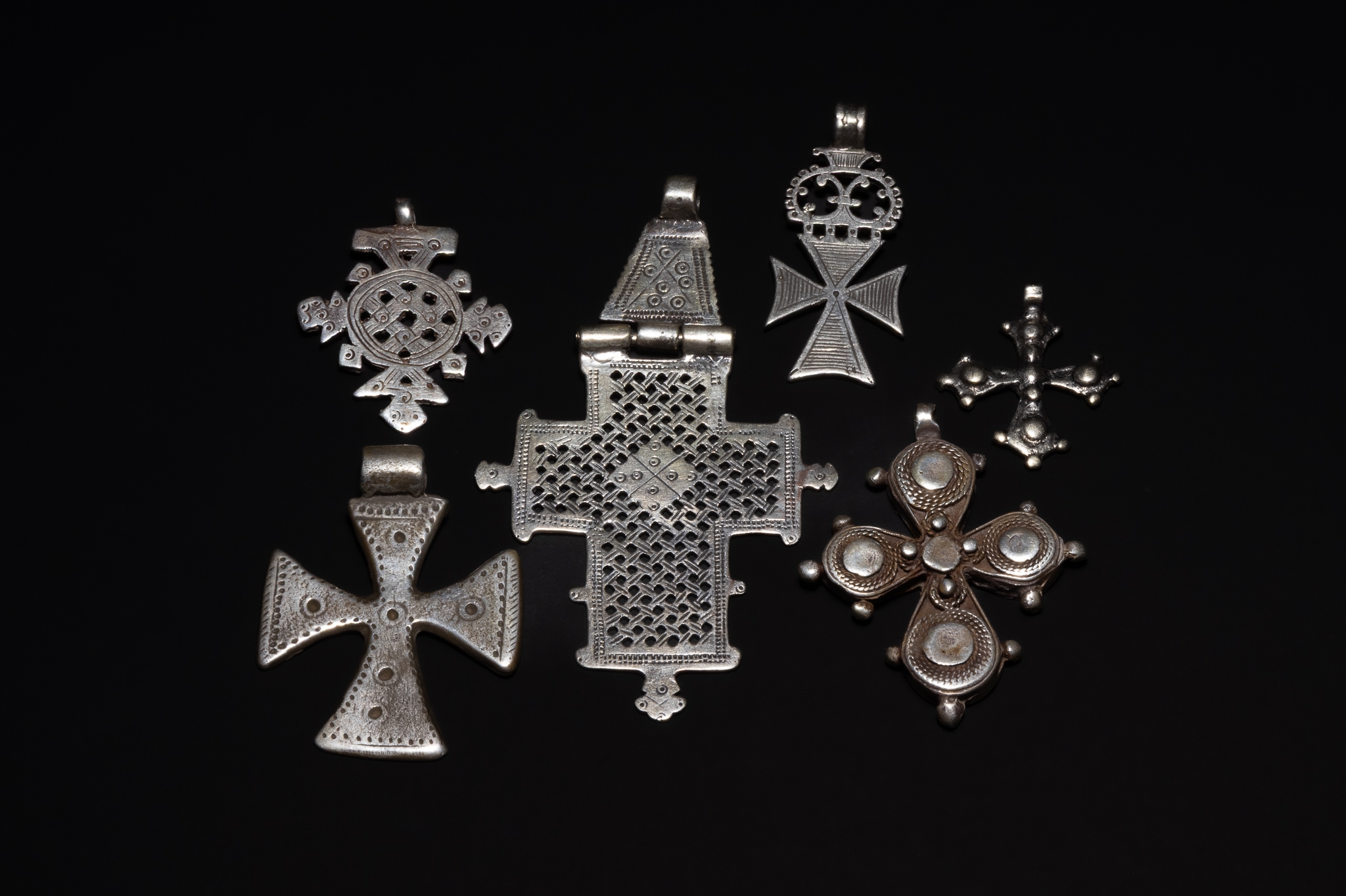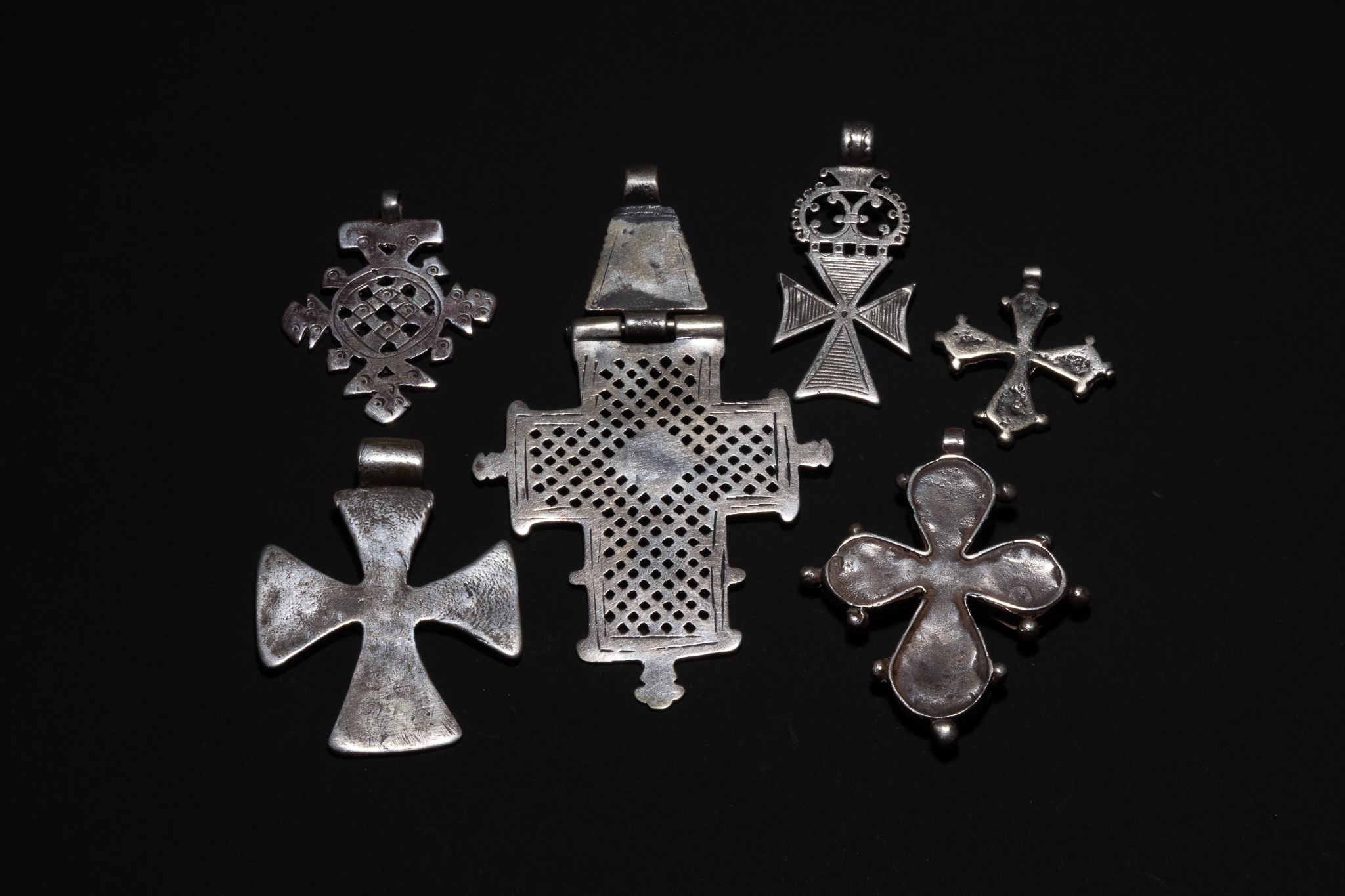 A group of Ethiopian Coptic cross pendants, each worked in silver and presenting a variety of traditional cross forms. The collection includes openwork lattice crosses, pierced circular and geometric examples, hinged pendant forms, and solid crosses with punched, incised, and repoussé decoration. The surfaces display a range of textures, from finely perforated grids to raised bosses and engraved linear motifs, with varied proportions and silhouettes across the group.