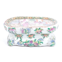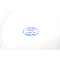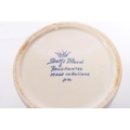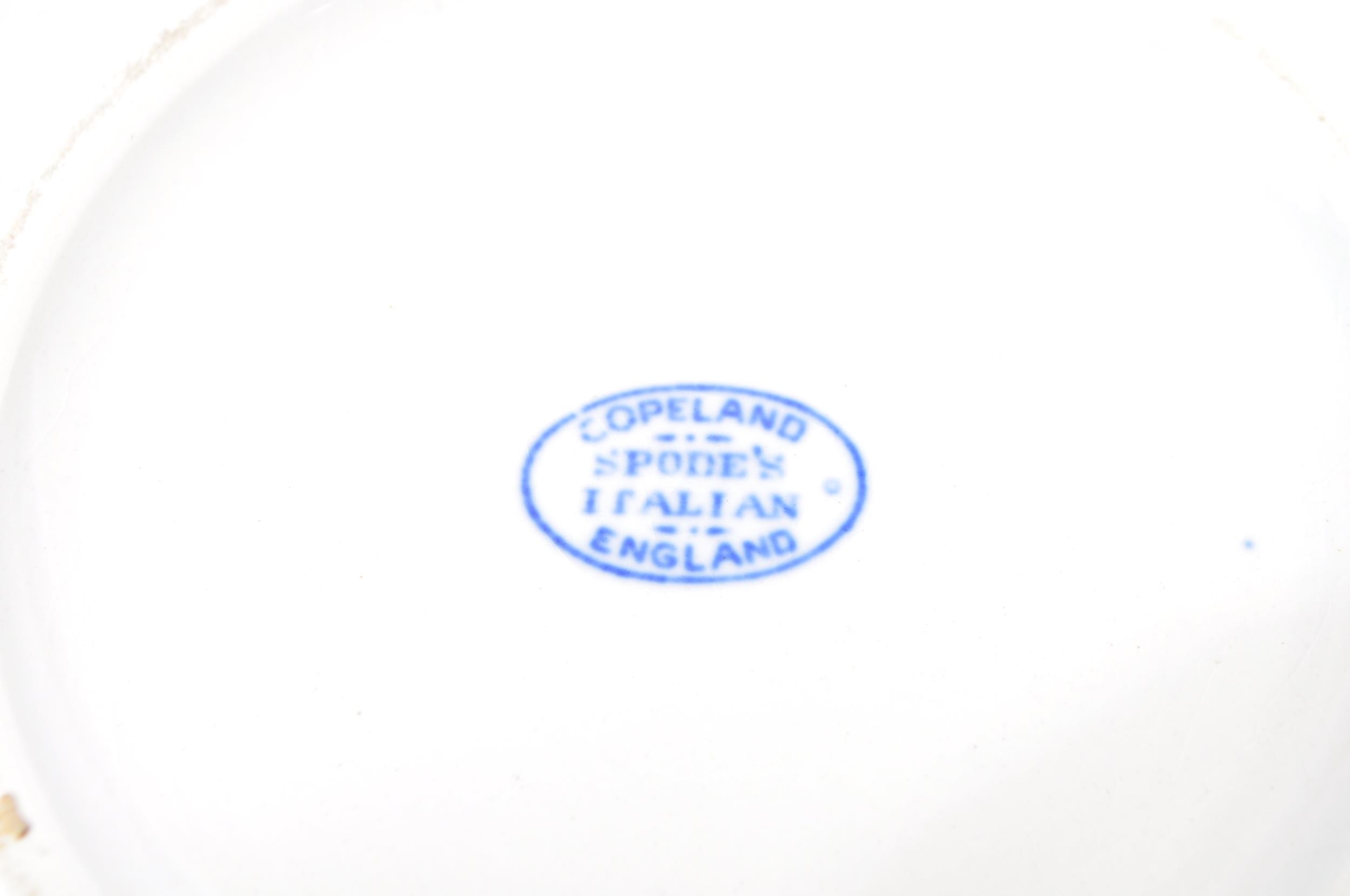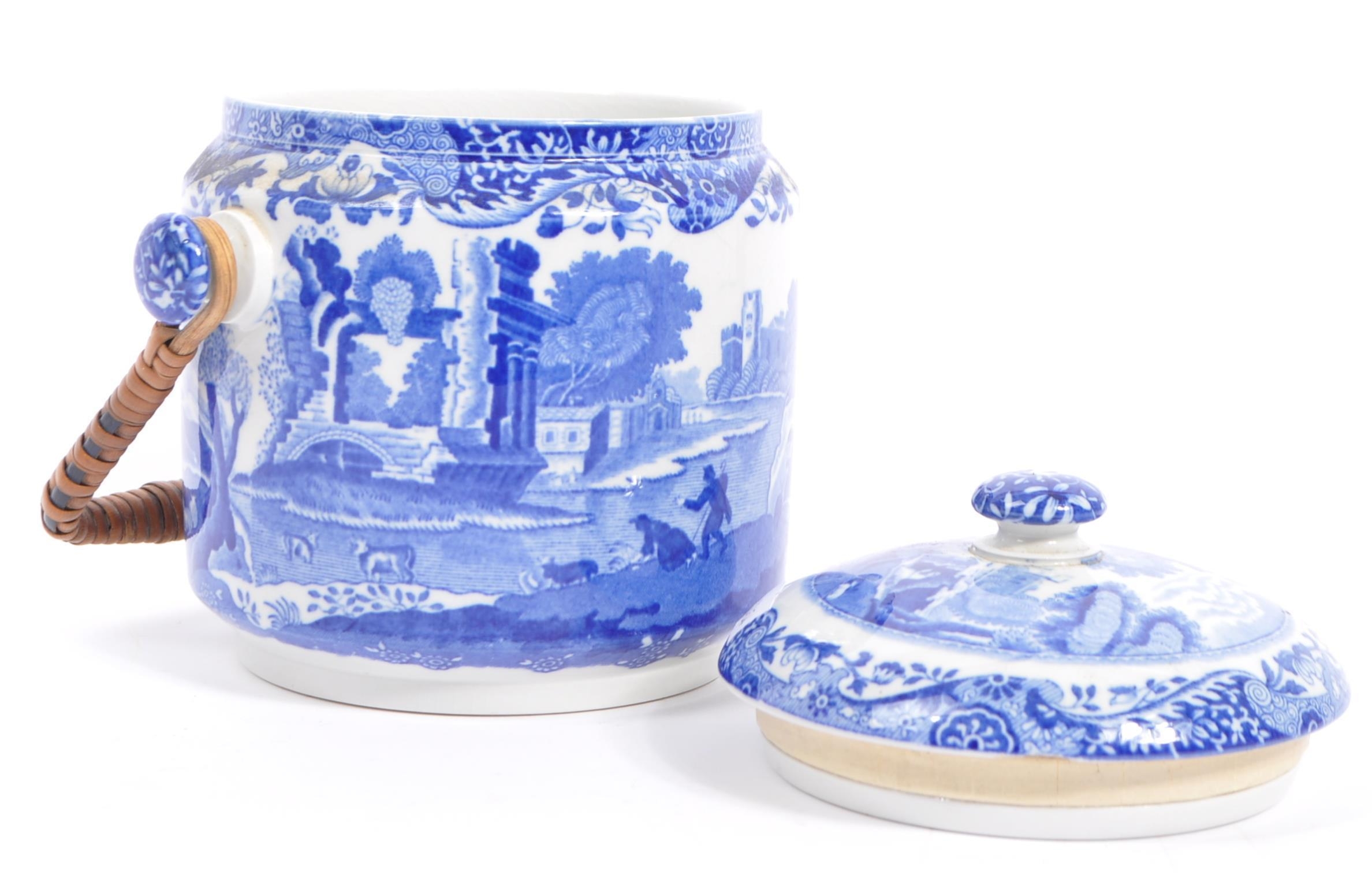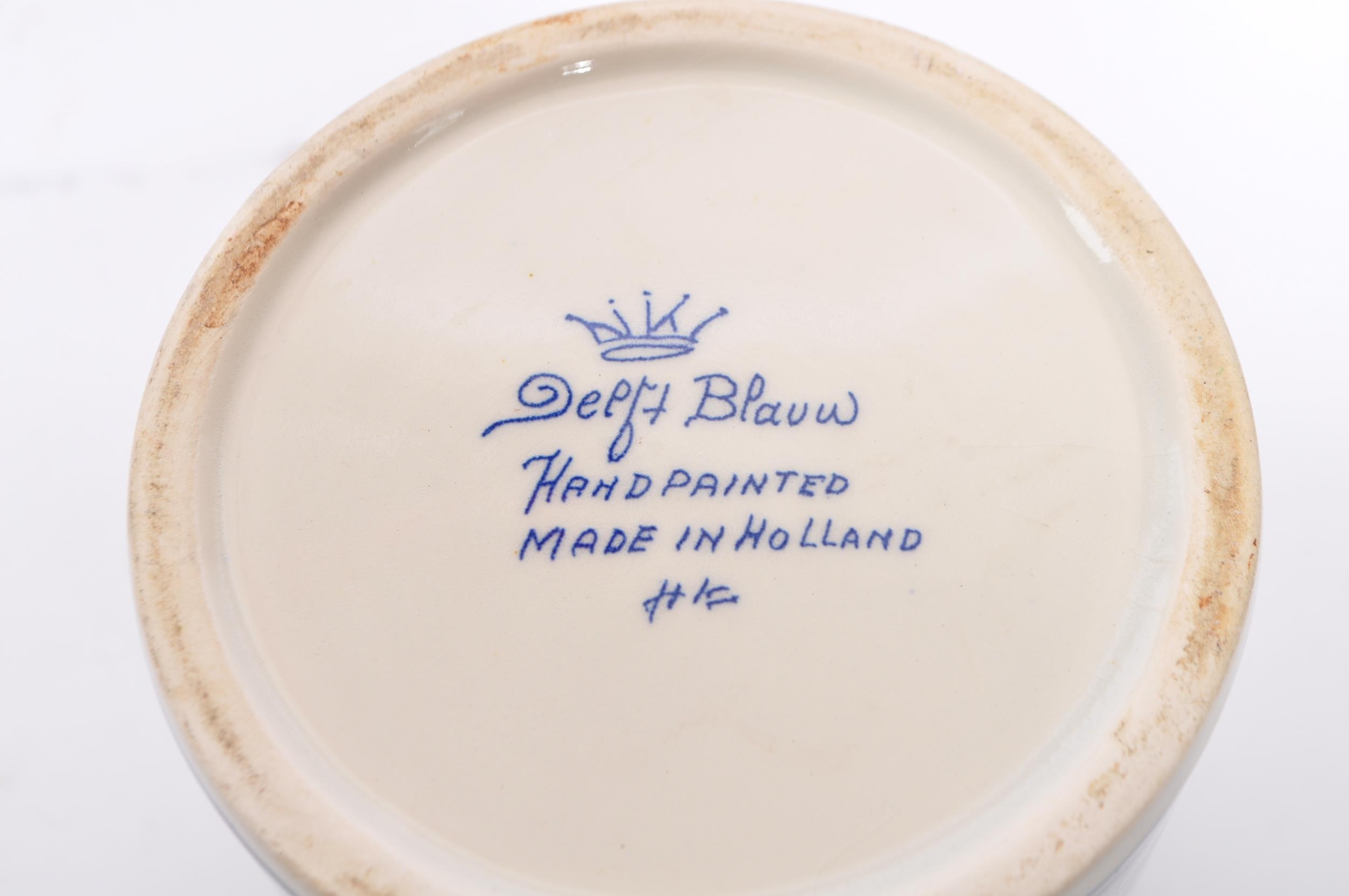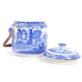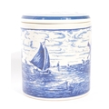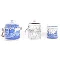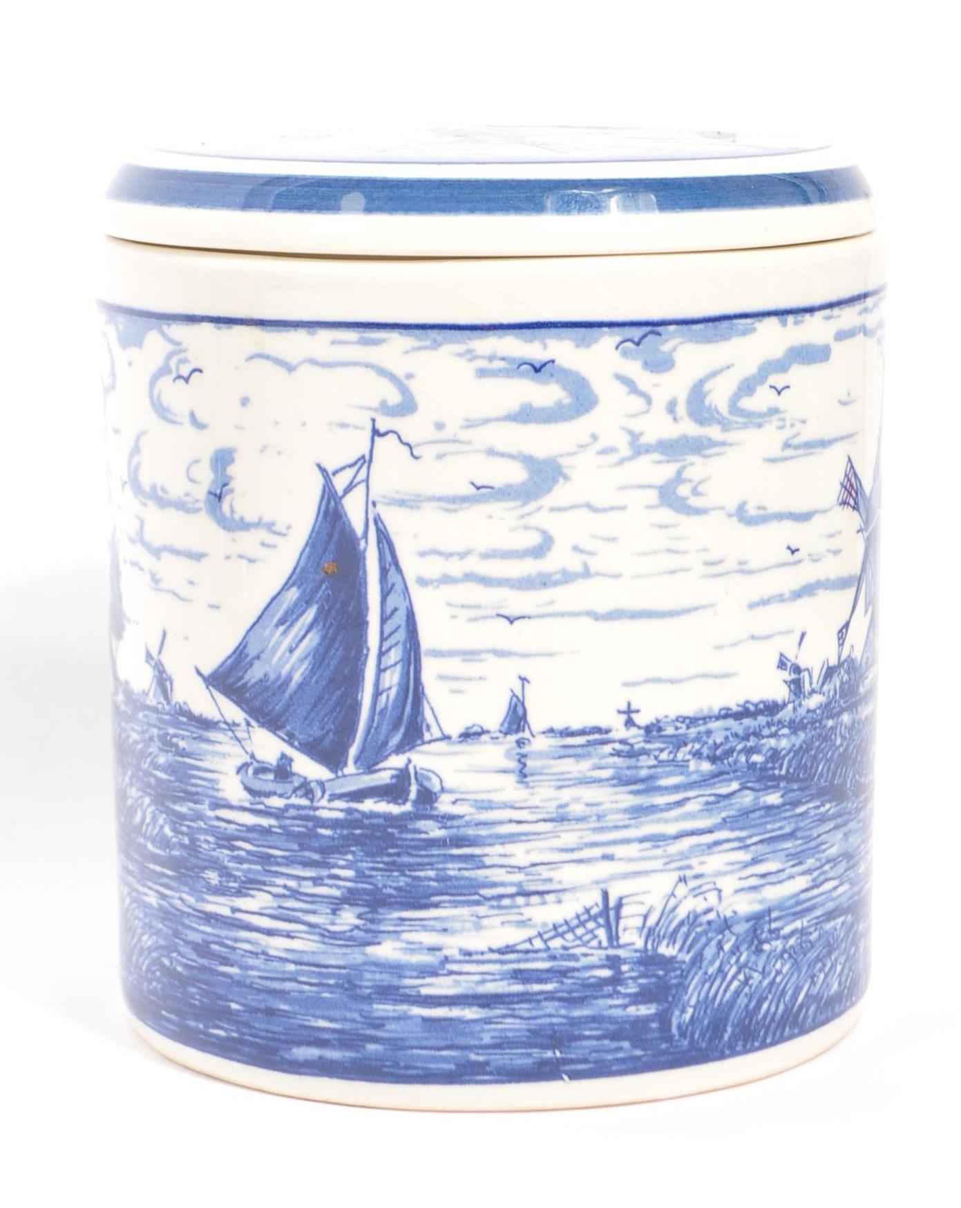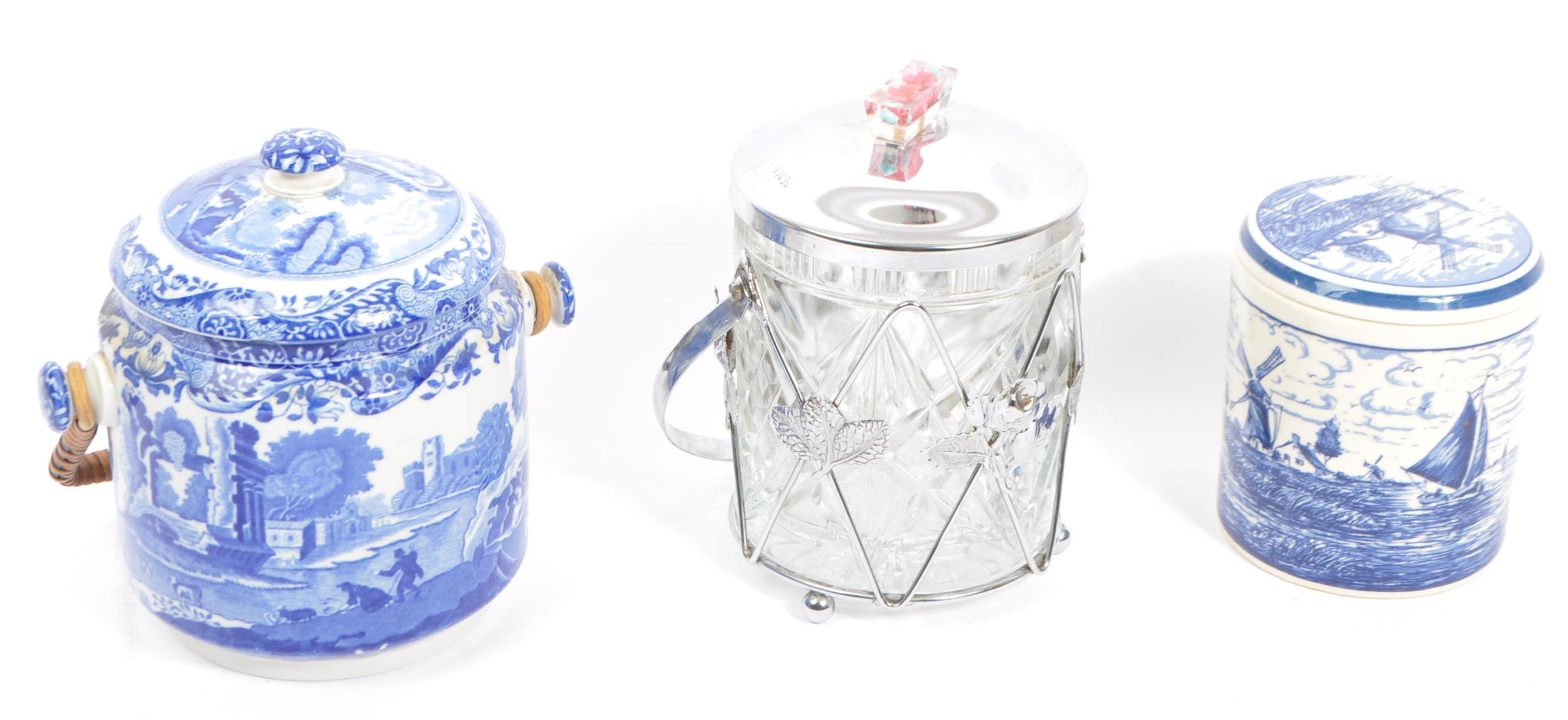 Three mid century biscuit barrels and a lidded sugar pot. Comprising of a Copeland Spodes, England Italian style lidded biscuit barrel with wicker handle depicting a river scene, along with another cut glass and lidded stainless steel biscuit barrel with floral resin handle. Also includes a Dutch delft blau hand painted lidded sugar jar. Largest measures