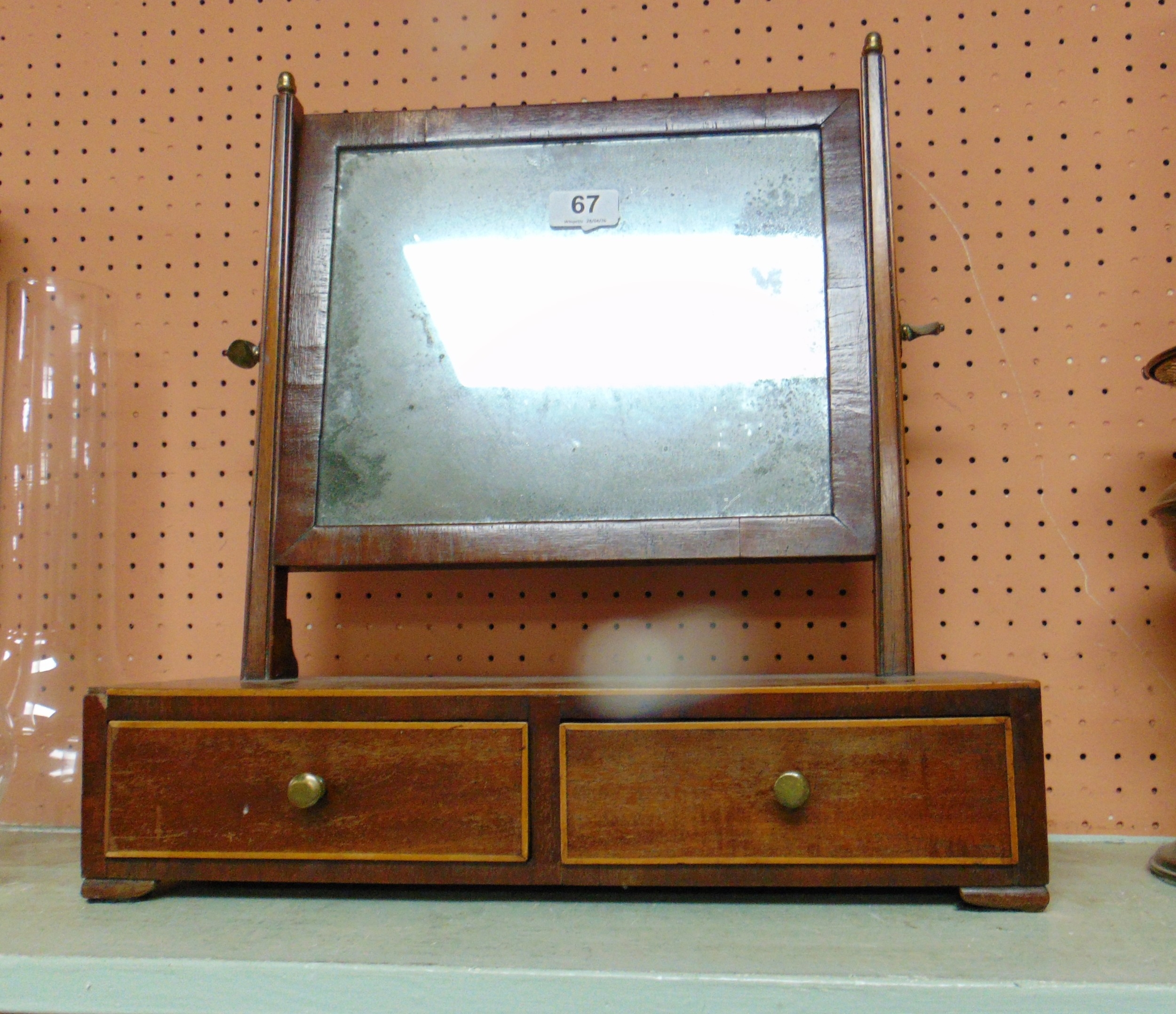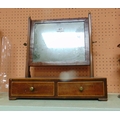 Antique inlaid mahogany toilet mirror, having rectangular plate glass back, pair of short drawers with brass knob handles and on bracket feet, 17 x 17 x 7" deep.