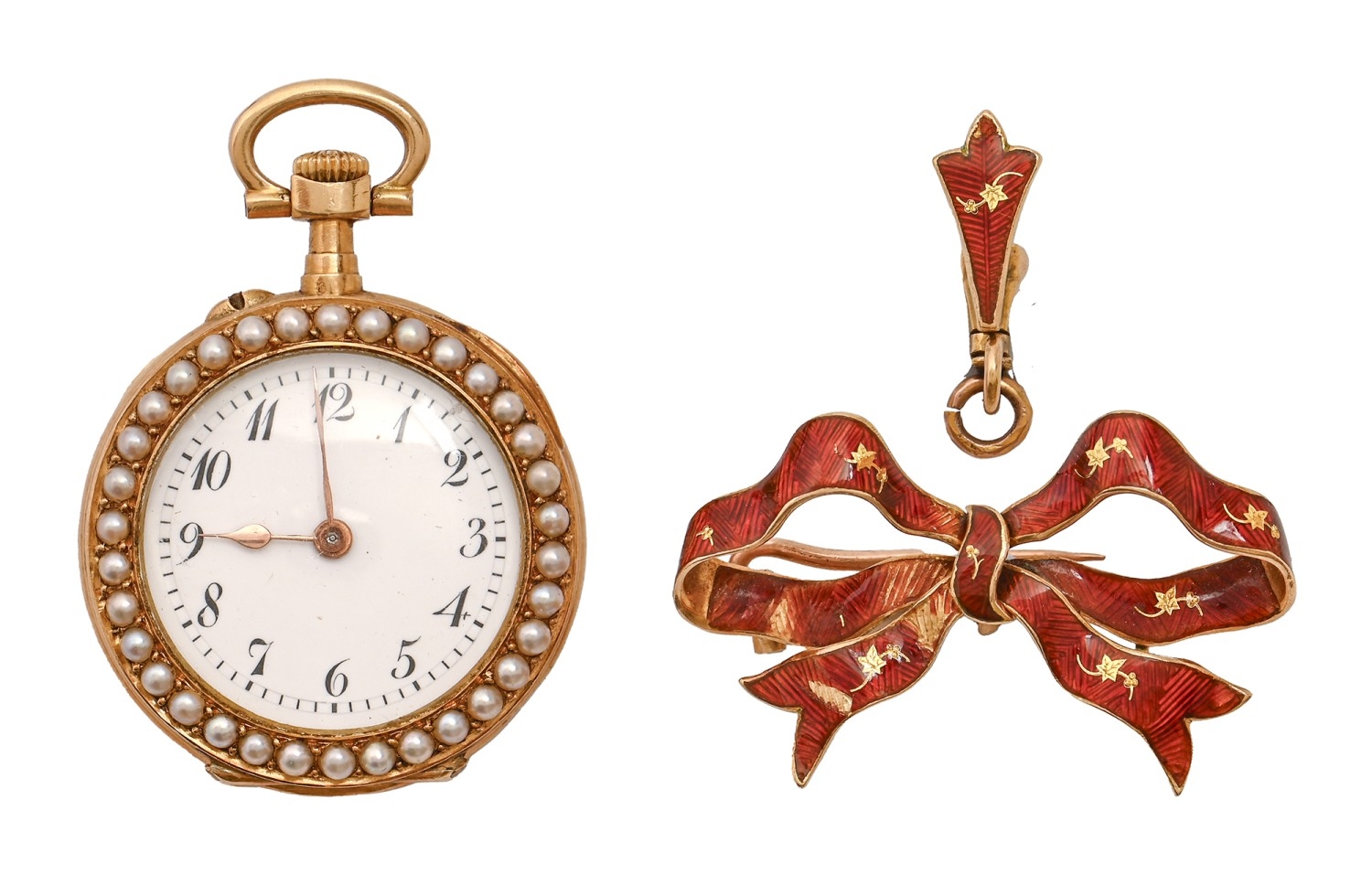 A Swiss diamond, split pearl, gold and cherry red guilloche enamel keyless lever lady's watch and bow brooch, c1900, gold bow and cuvette, 25mm diam, marked 18K, 23g