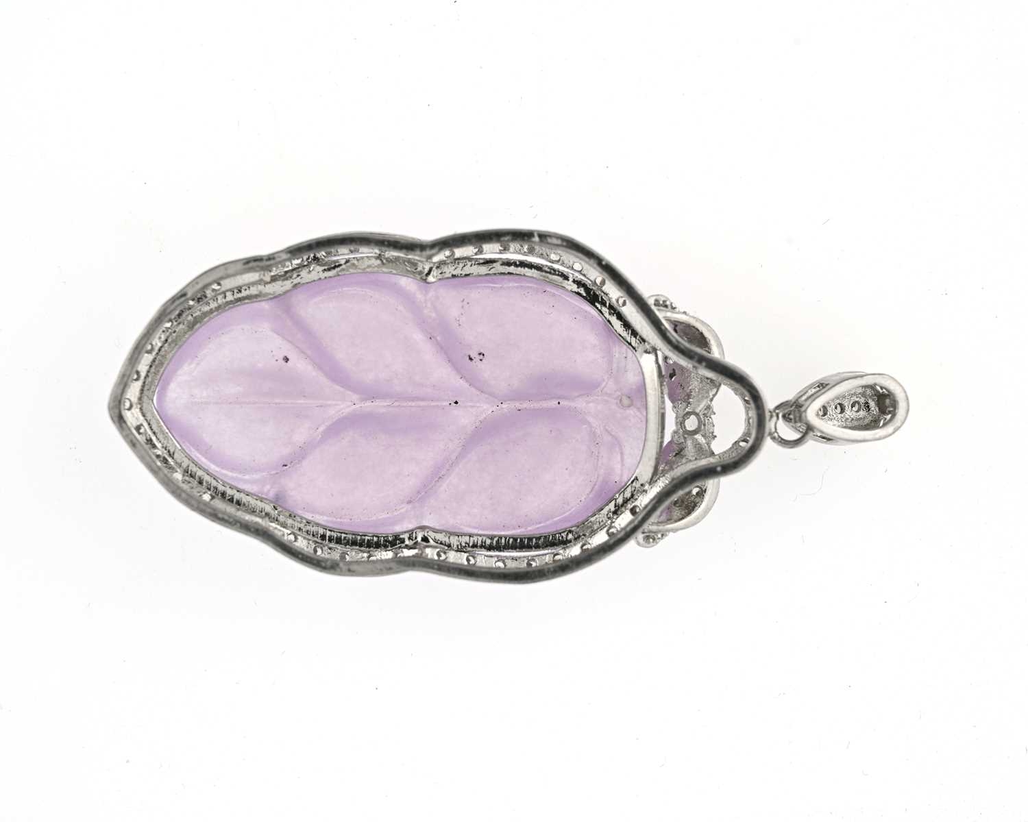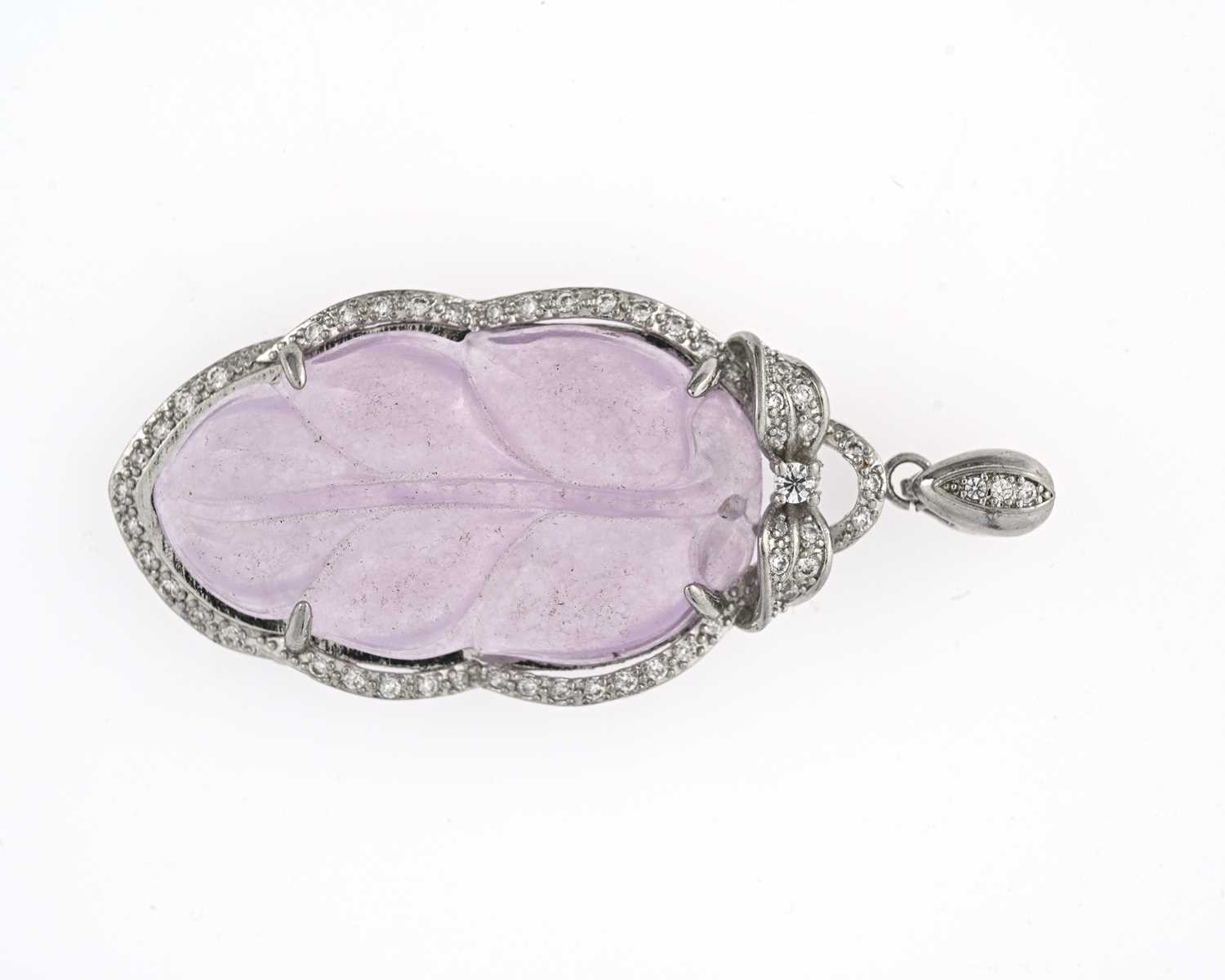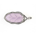 A Chinese lavender jade and white stone pendant, mounted in silver coloured metal, carved leaf form, suspended on a link, 7cm long