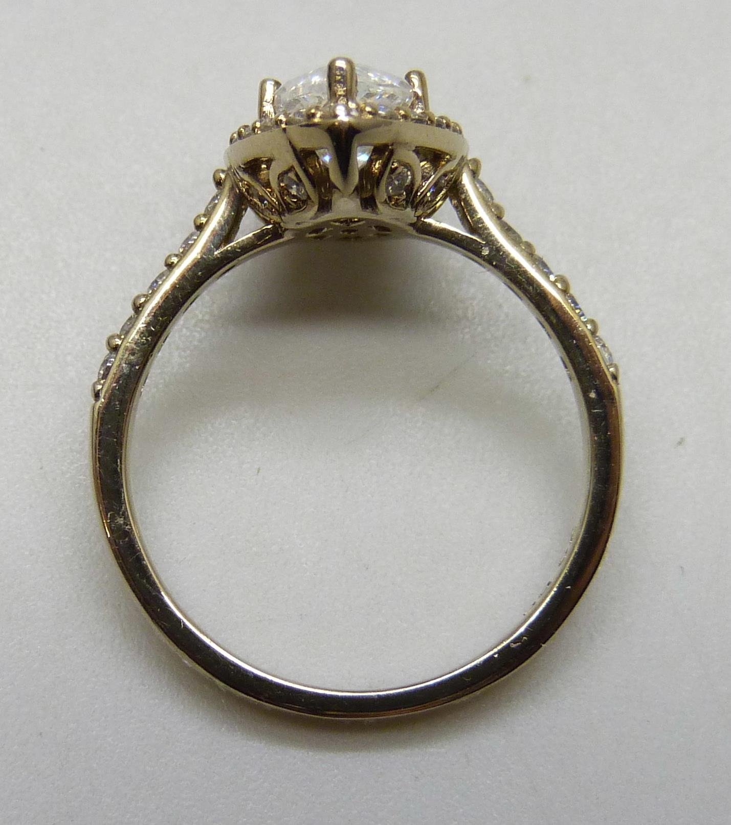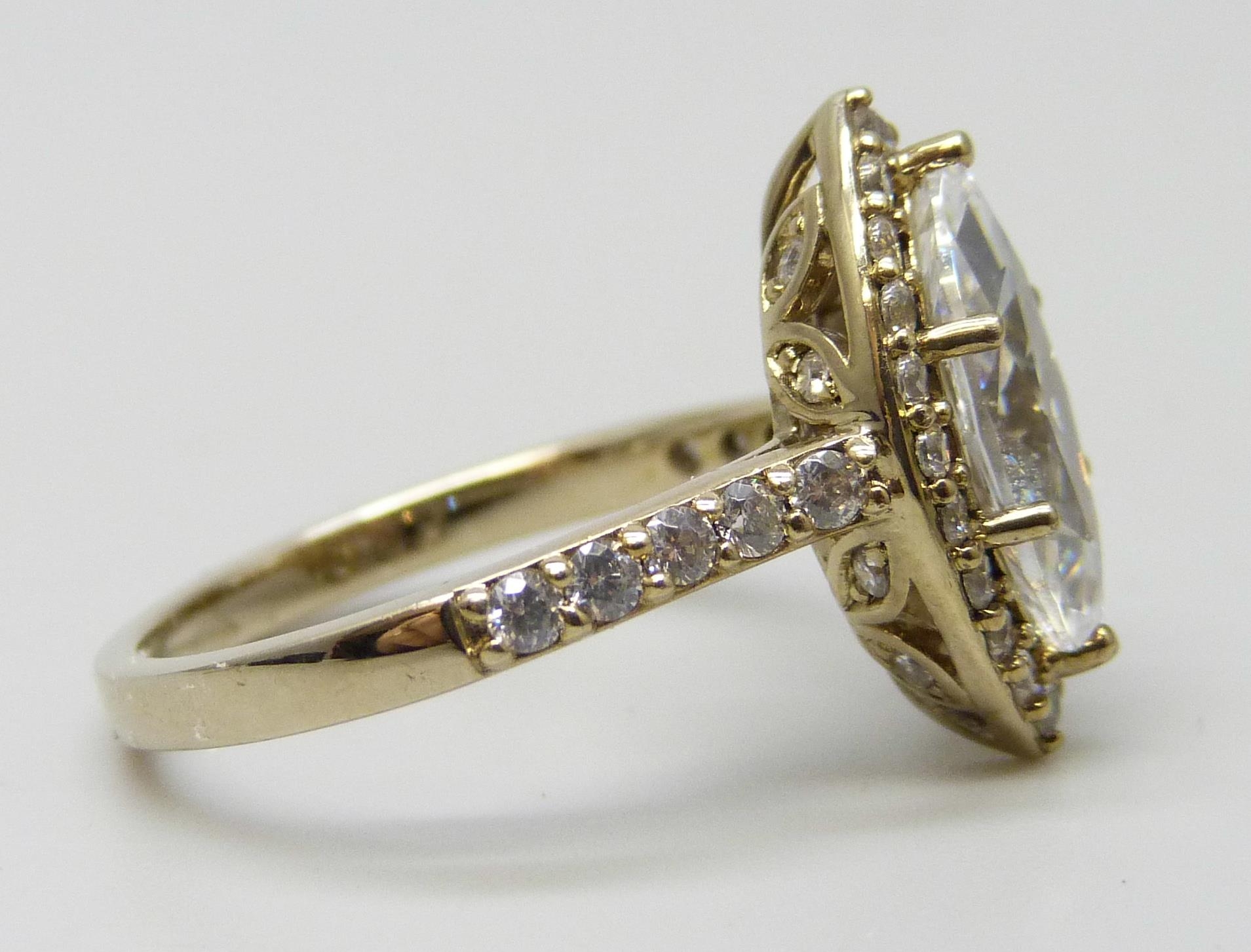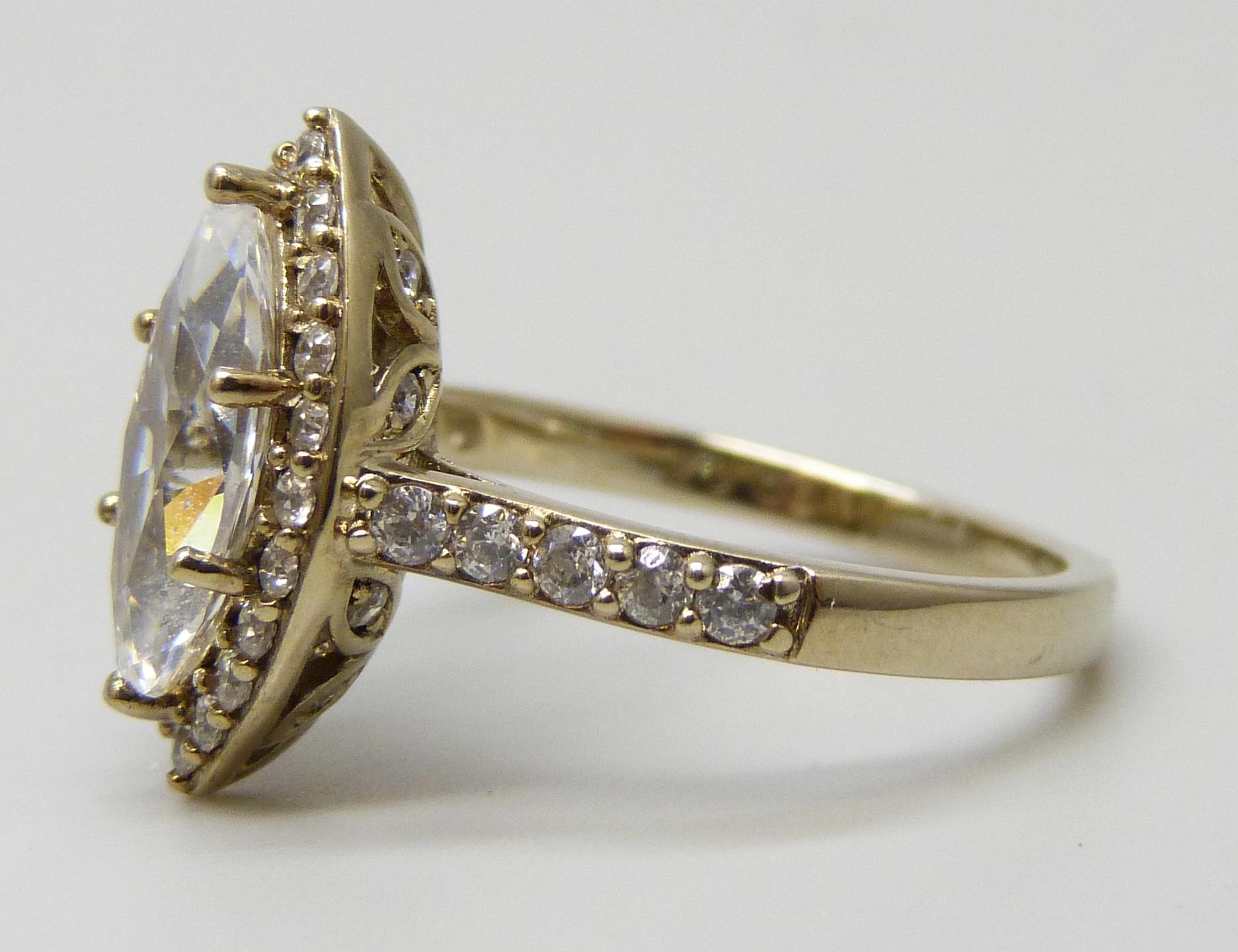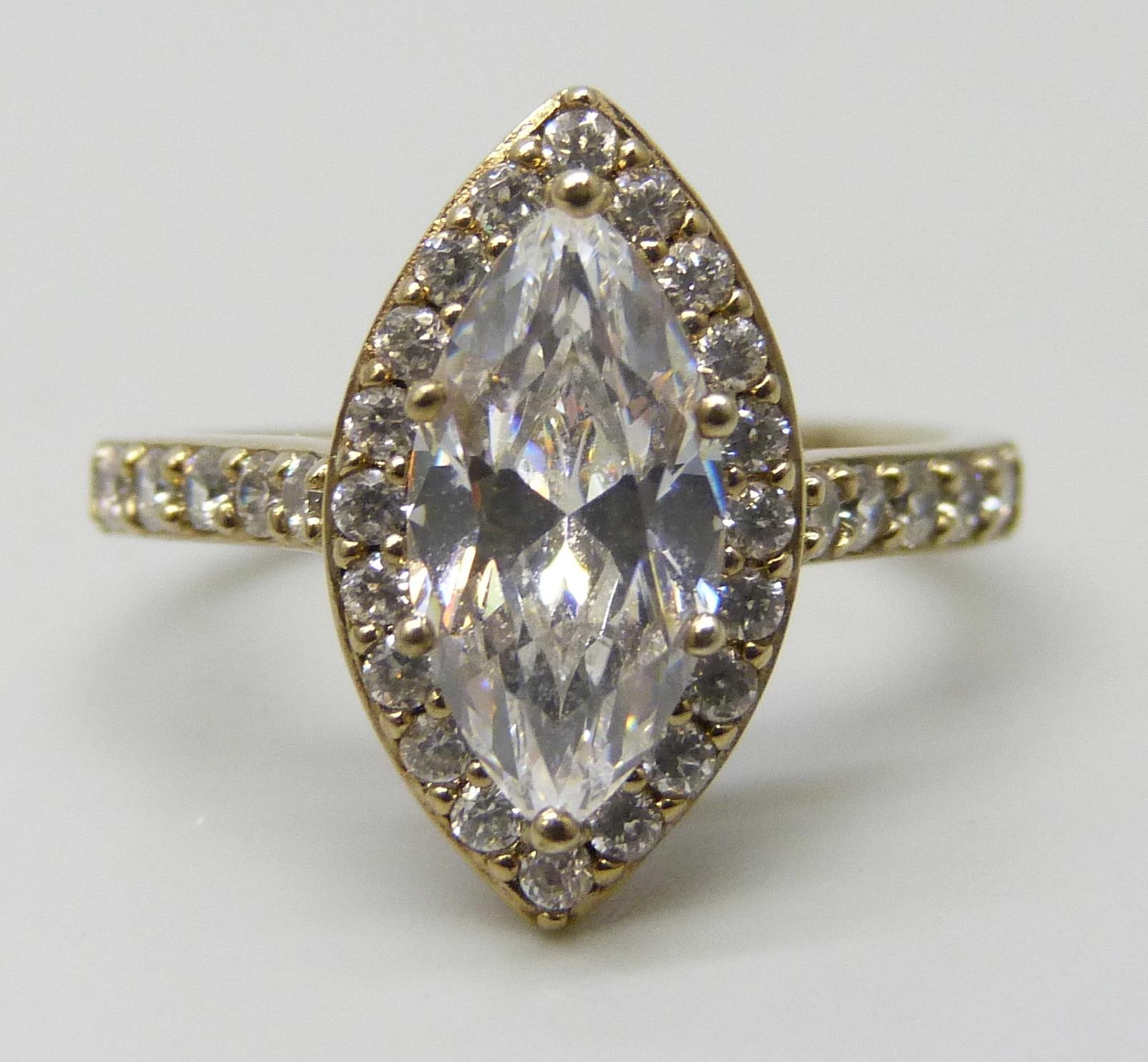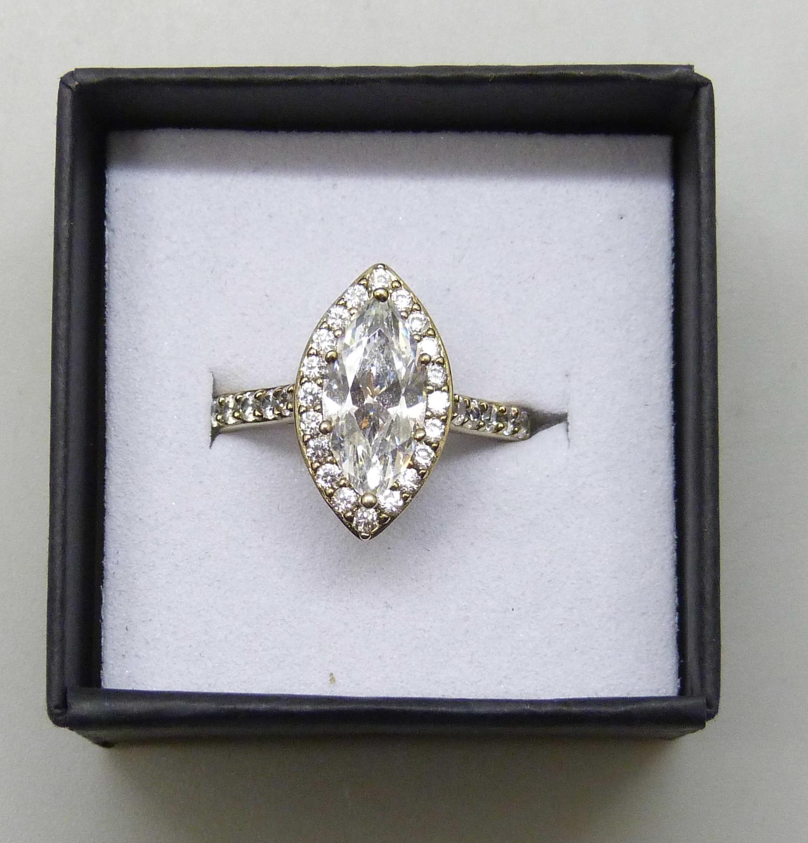 A silver gilt DQCZ marquise cut cubic zirconia ring, N