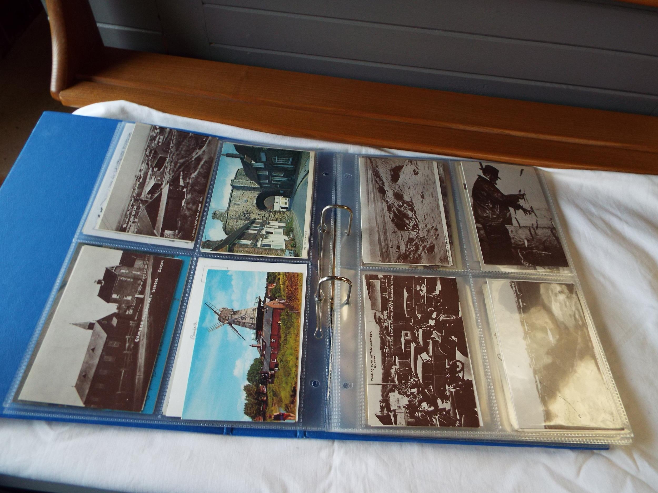 An album housing a selection of Rye postcards by Perugini's of Rye to include Market Street, Watchbell Street, The Old Hospital etc