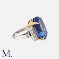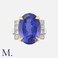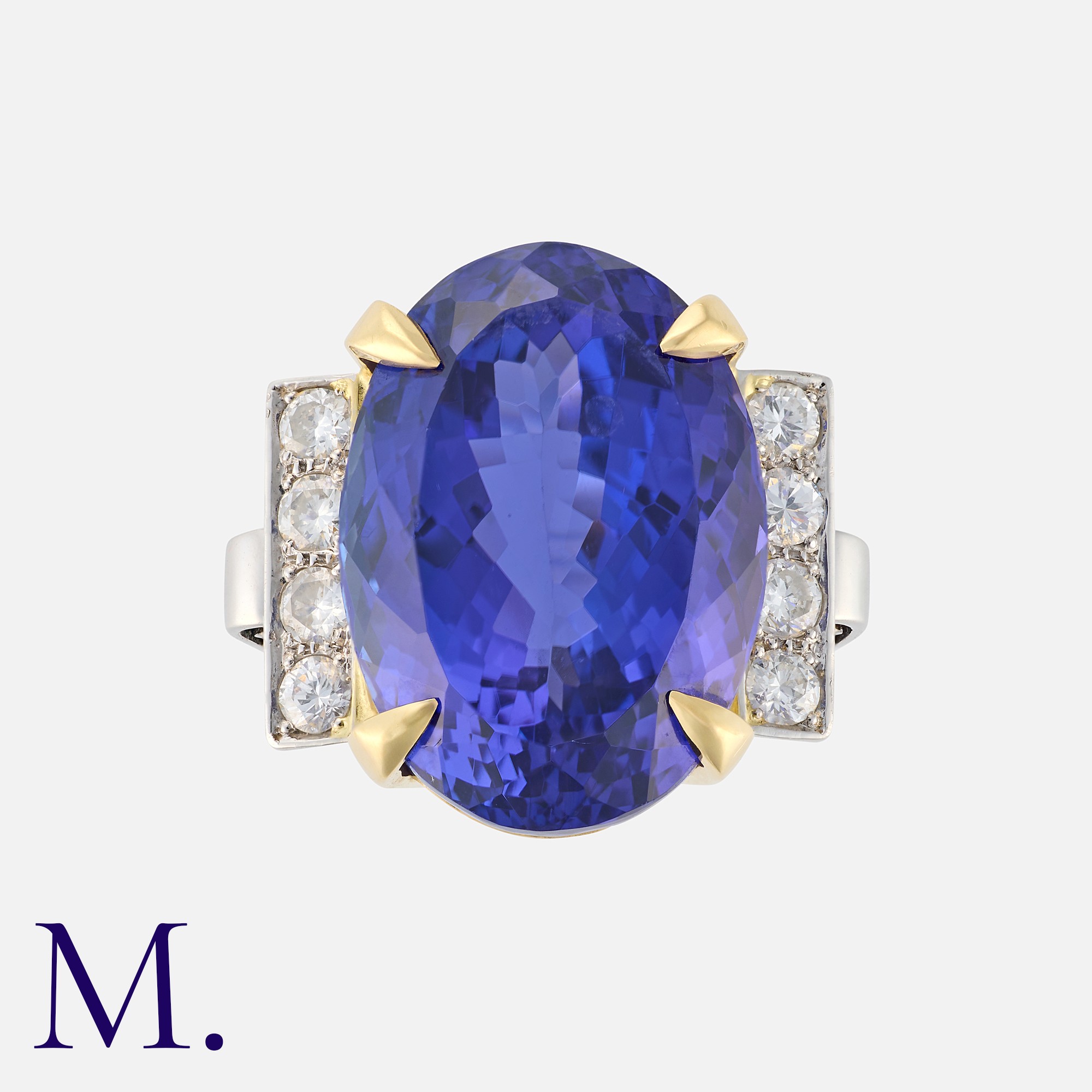 A Fine 24.90 Carat Tanzanite and Diamond Ring in yellow and white gold, set with a large Tanzanite of 24.90 carats, flanked either side by round cut diamond set shoulders. Unmarked, tests indicate 18 carat gold.