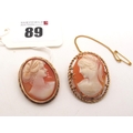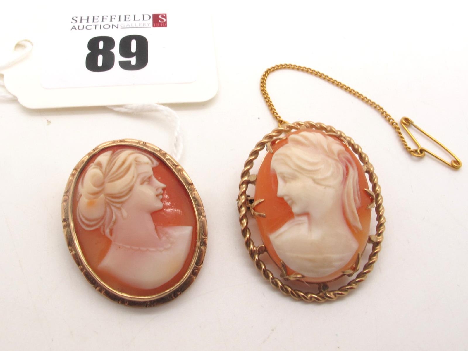 A 9ct Gold Oval Shell Carved Cameo Brooch, depicting female profile; Together with Another Oval Cameo Brooch. (2)