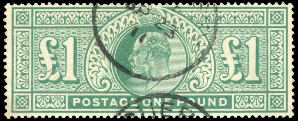 1902 £1 dull blue-green, two part Guernsey CDSs of SP 23 11.  Fine.  SG 266, Â
