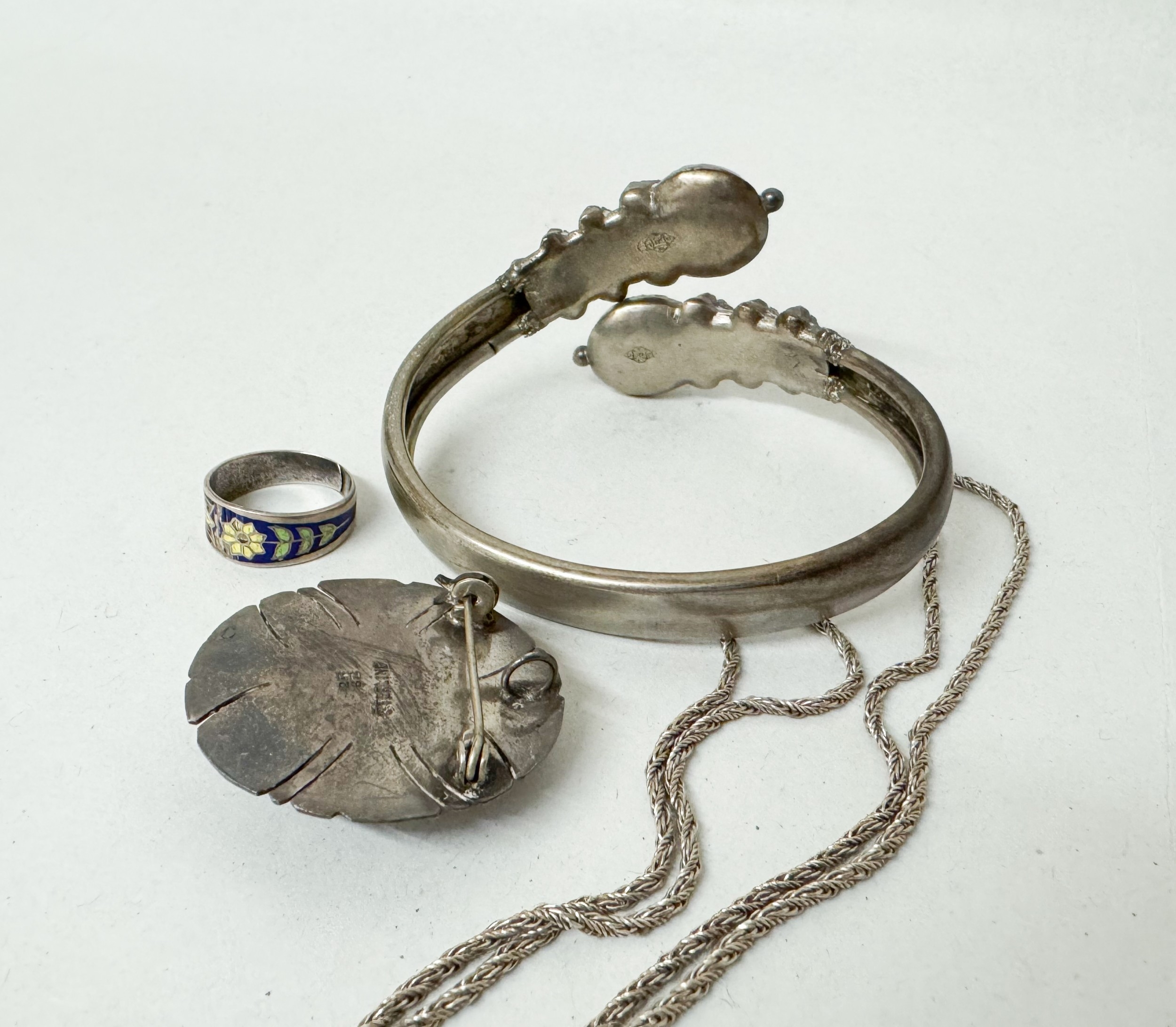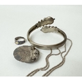 A silver and opalite brooch together with a chain necklace, a Victorian bangle and an enamel ring etc