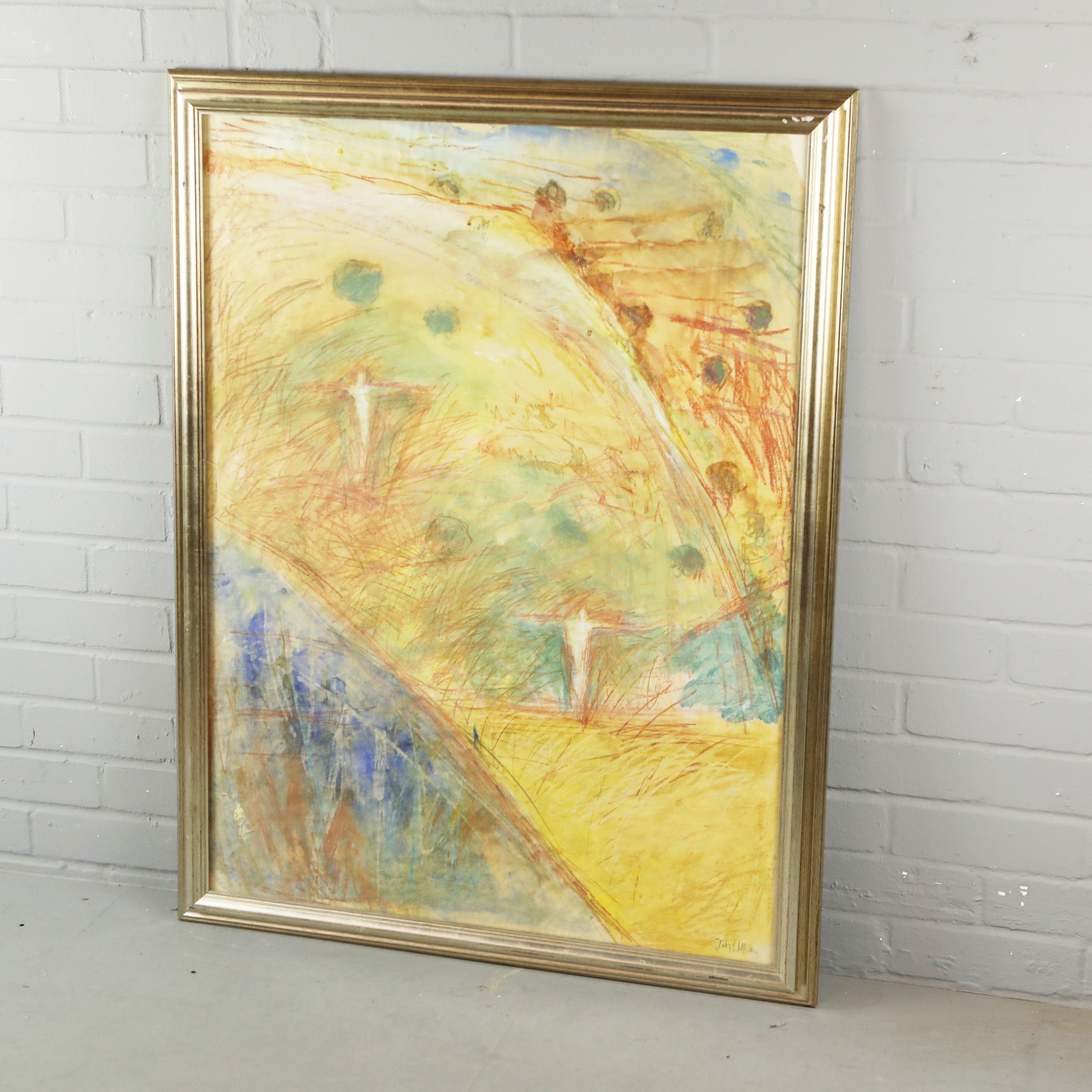 JUDY WILLOUGHBY (BRITISH B.1949). LANDSCAPE. mixed media on paper, 108cm x 84cm, framed.