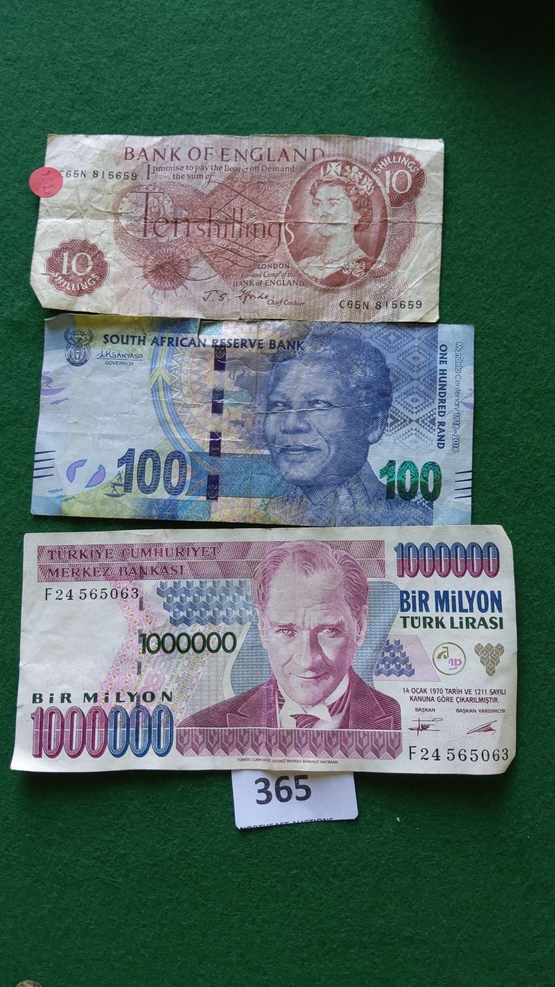 Collection of three banknotes: Bank of England ten shillings, South African Reserve Bank 100 Rand, and Turkish One Million Lira.