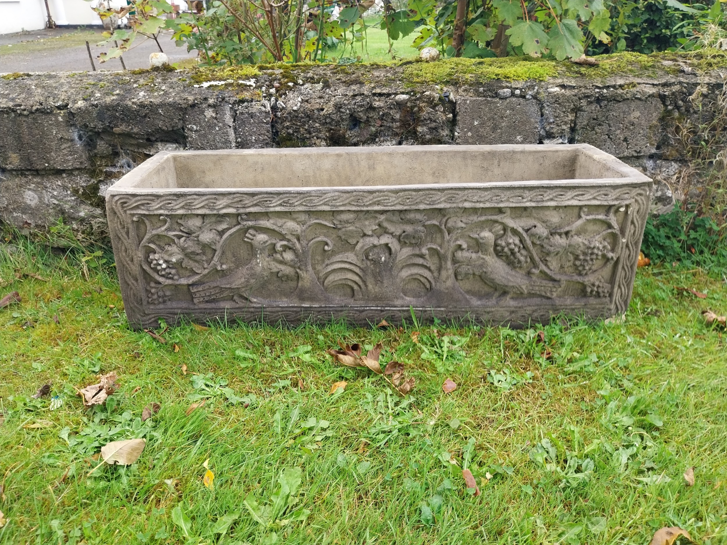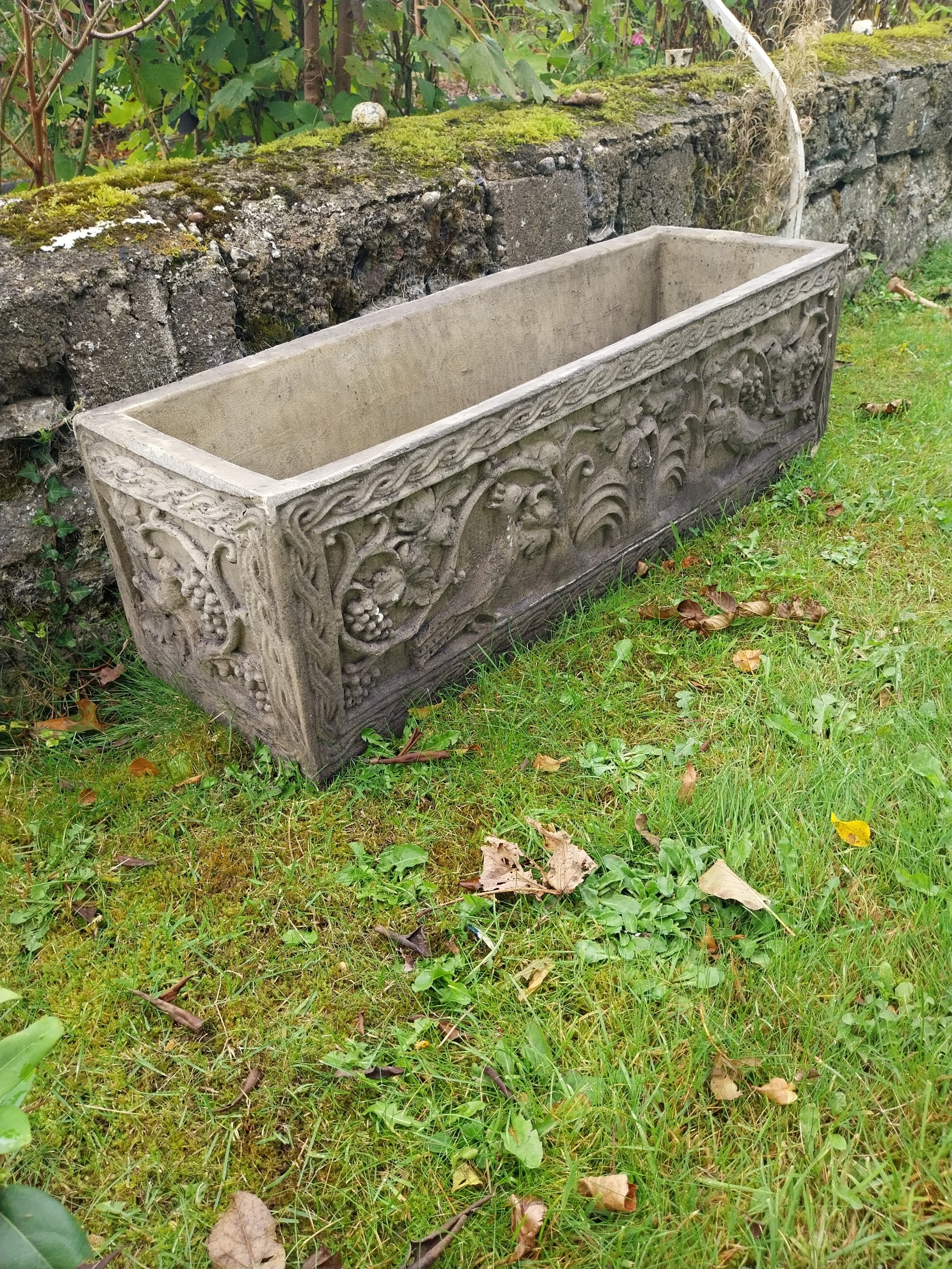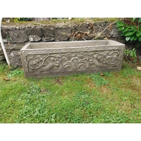Good quality decorative moulded sandstone planter. { 32cm H X 107cm W X 36cm D }.