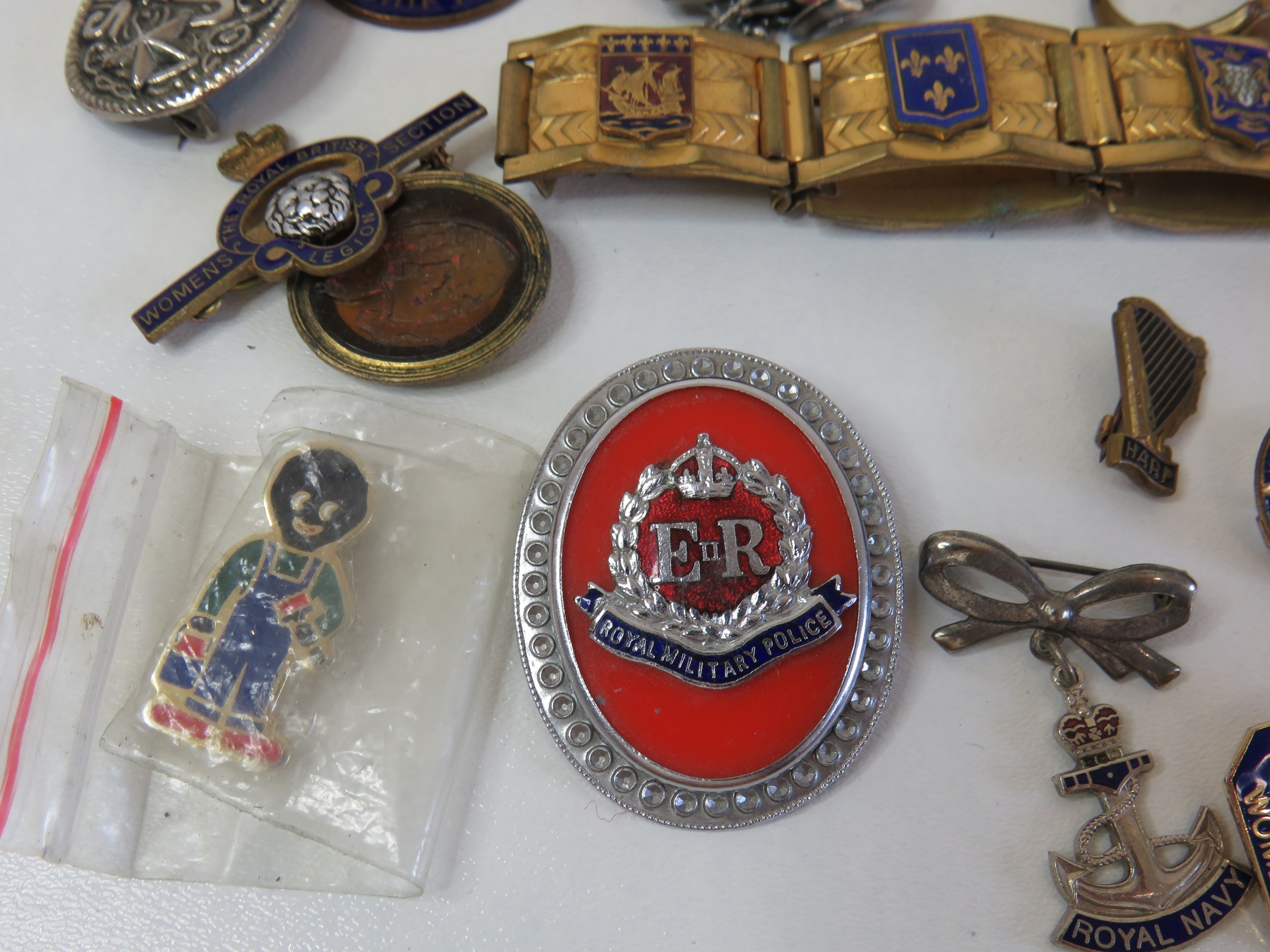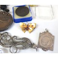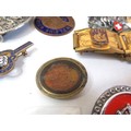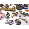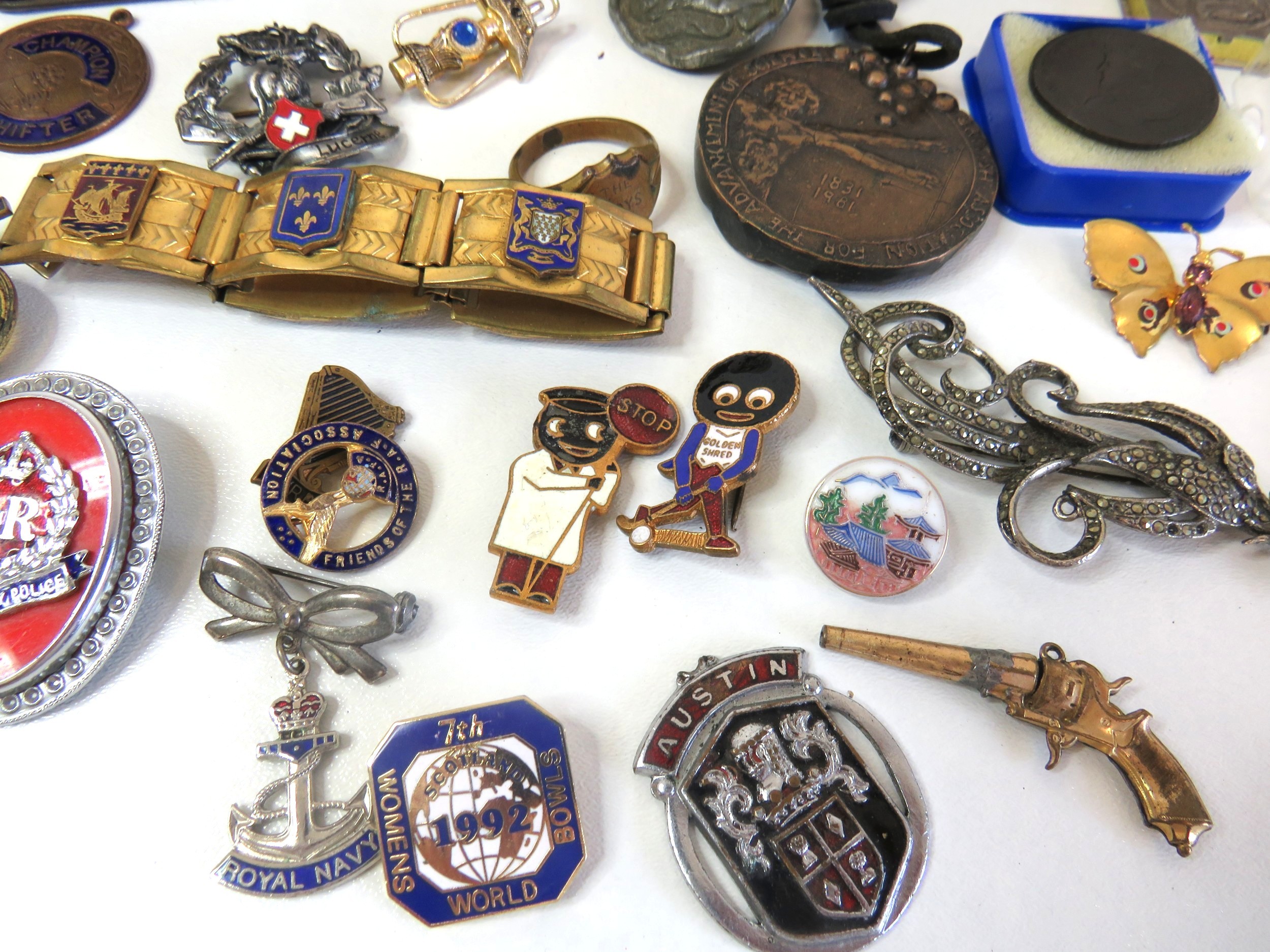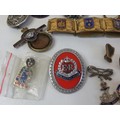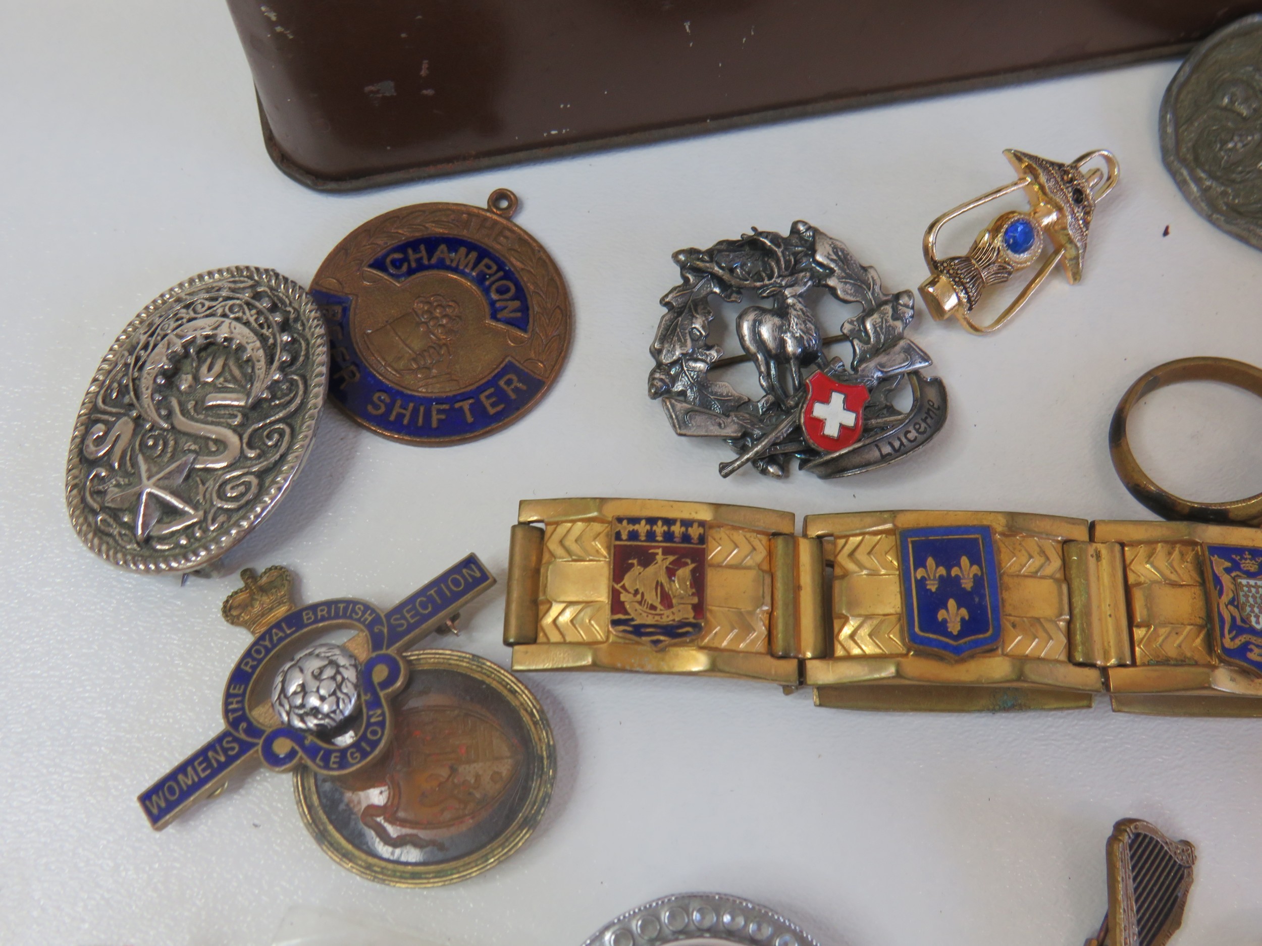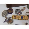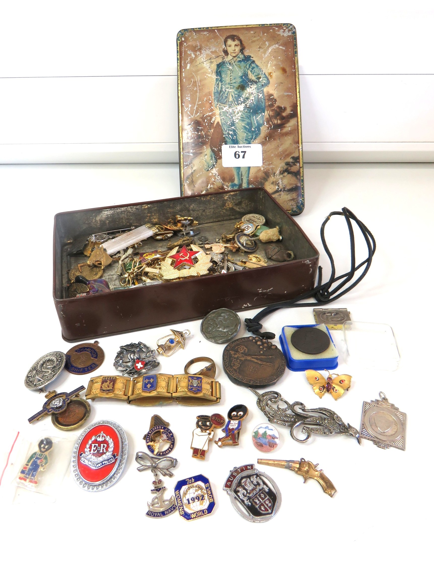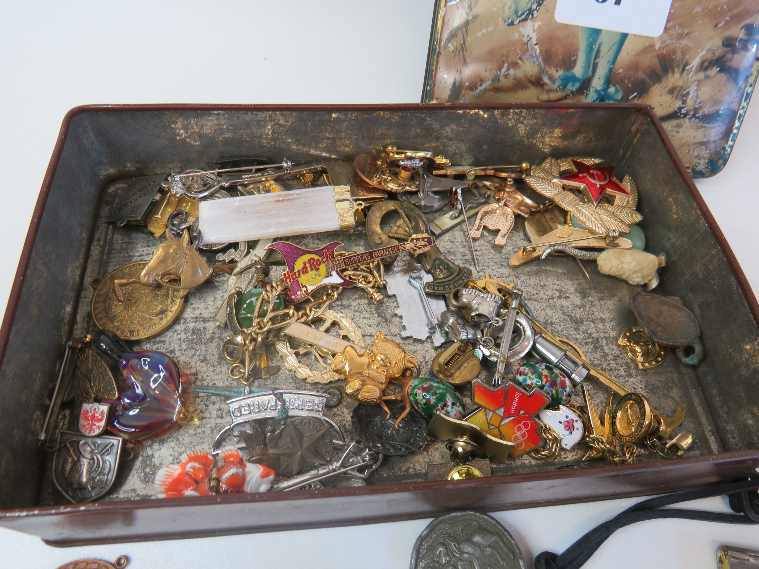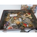 Vintage tin full of collectables, badges including Robertsons Golly, medals, jewellery etc.