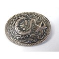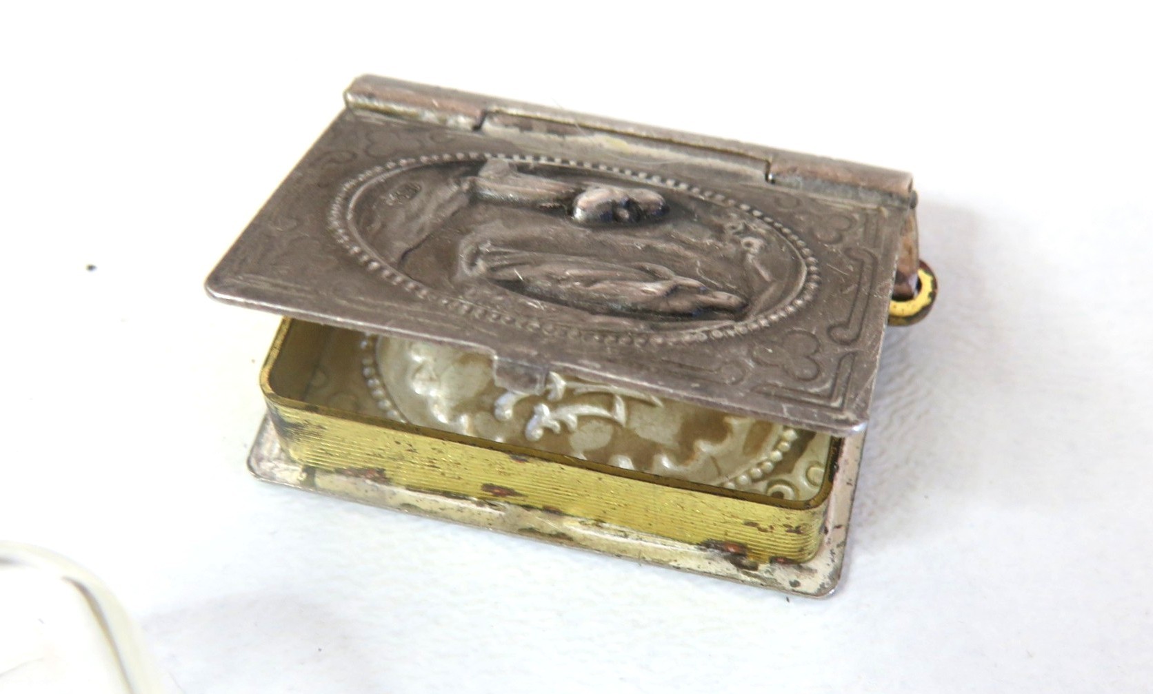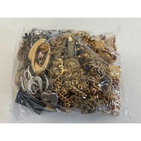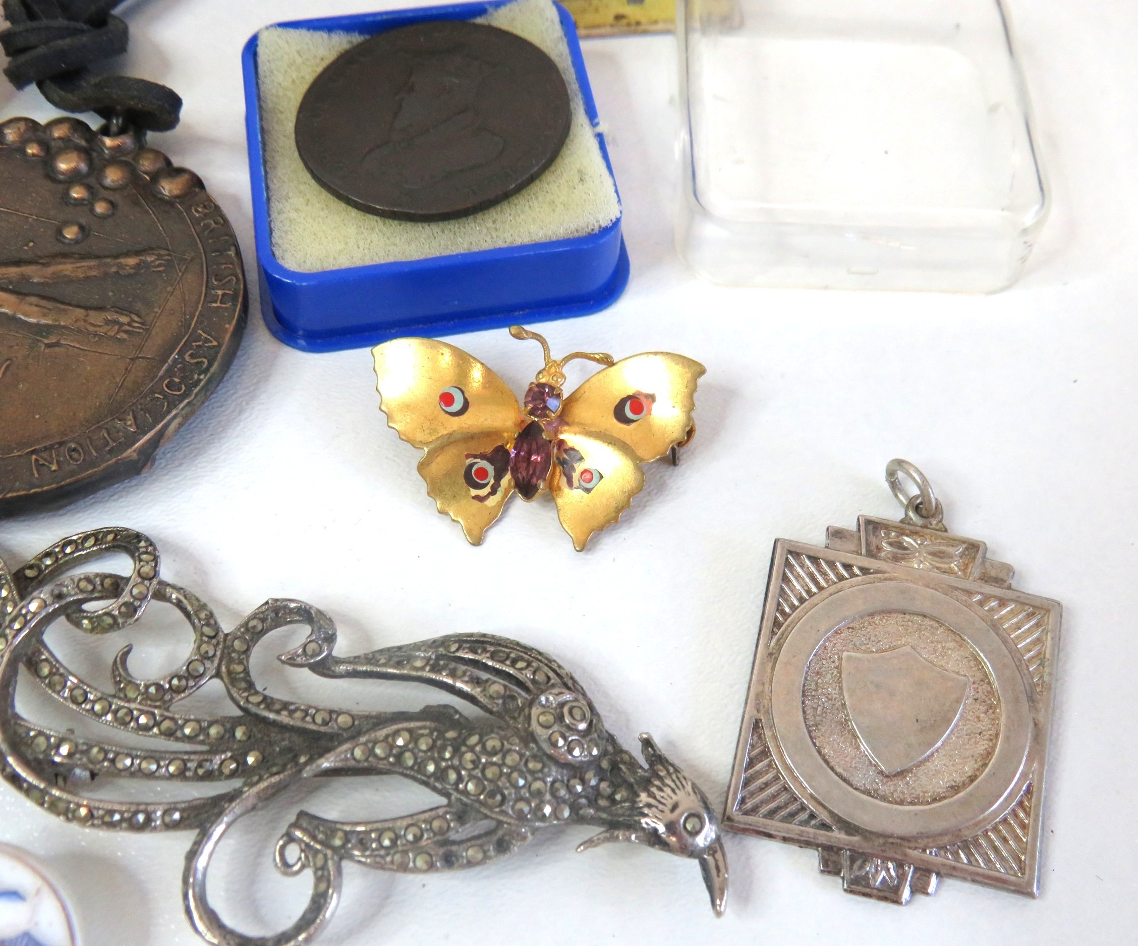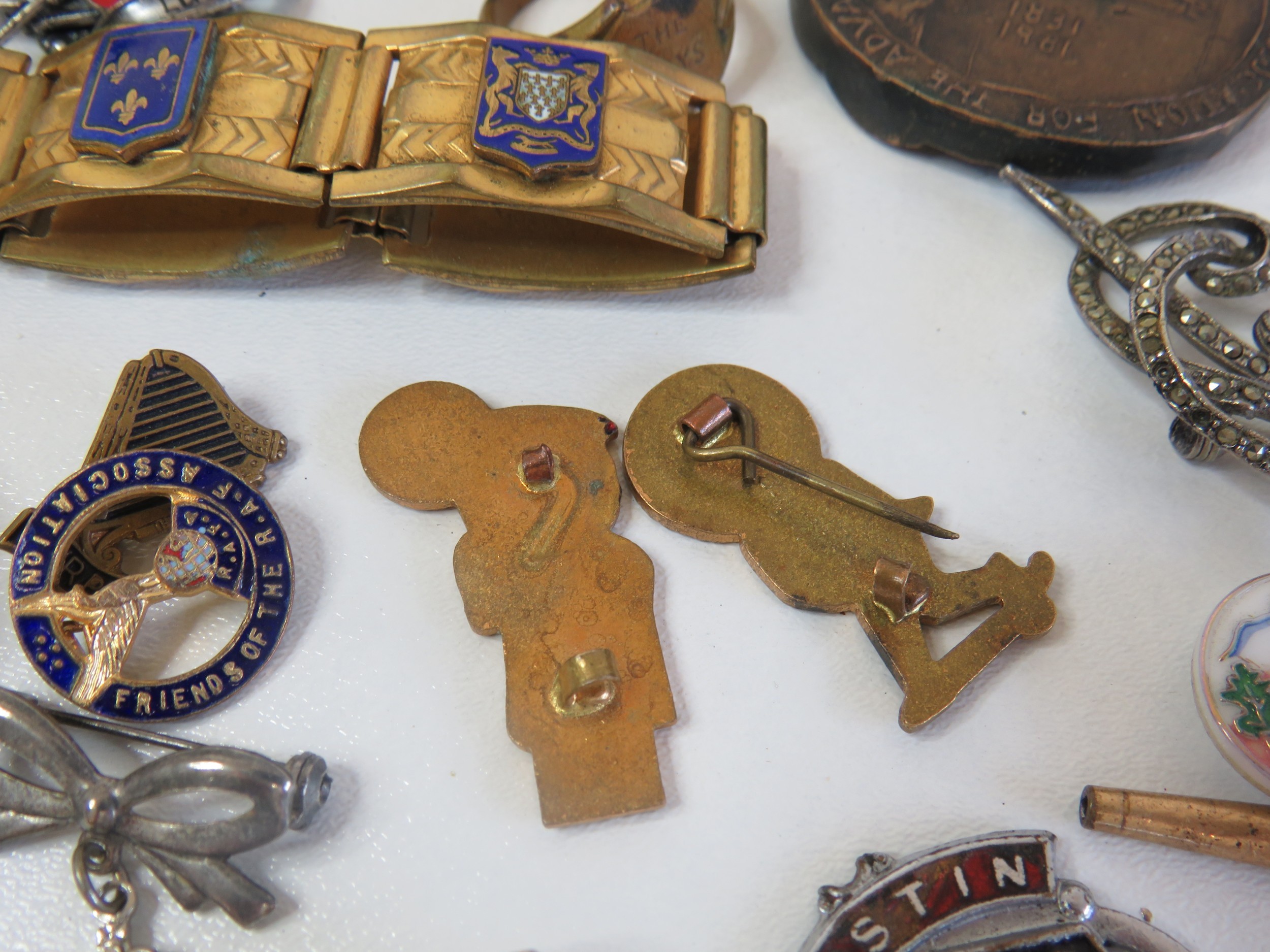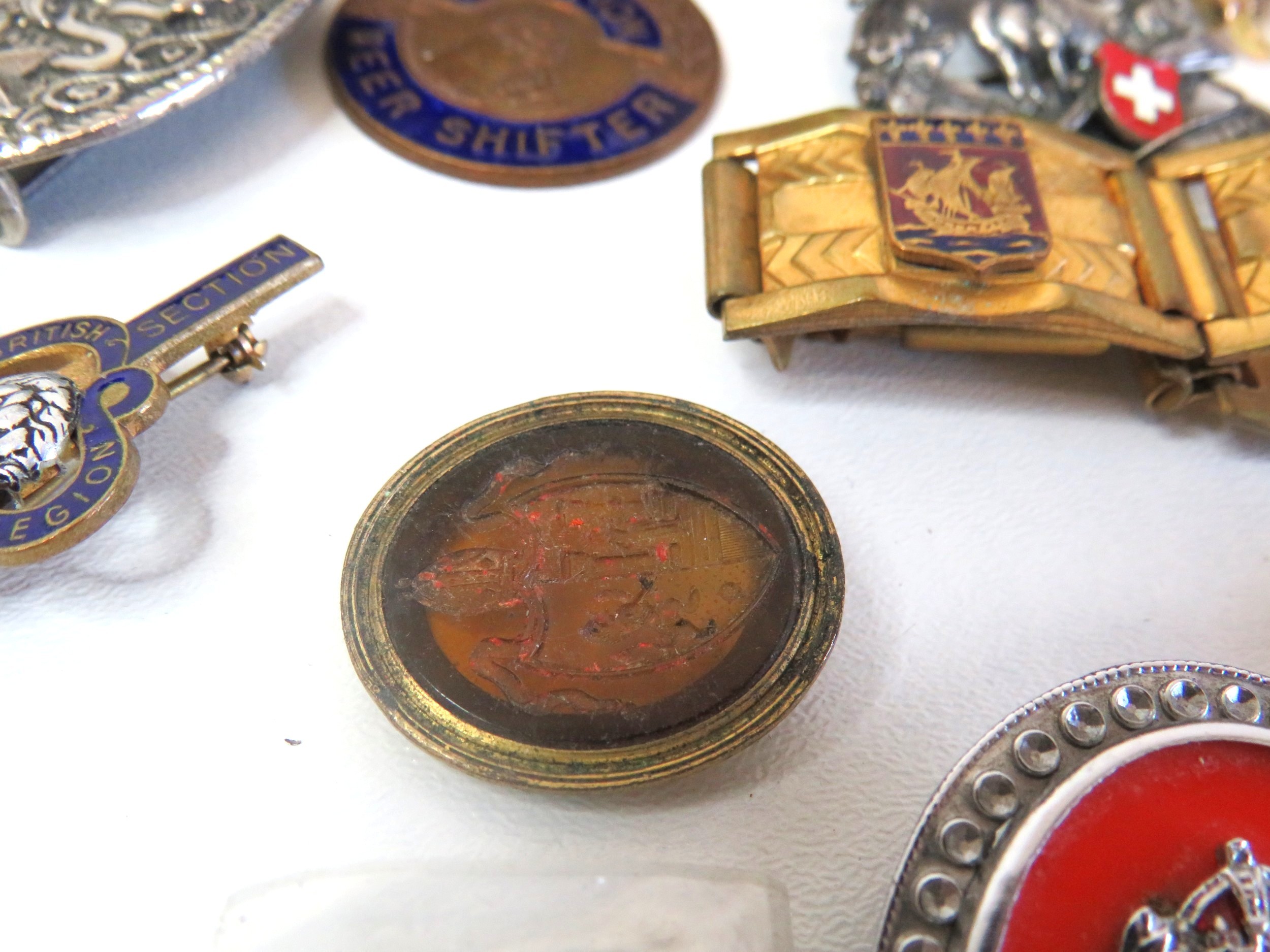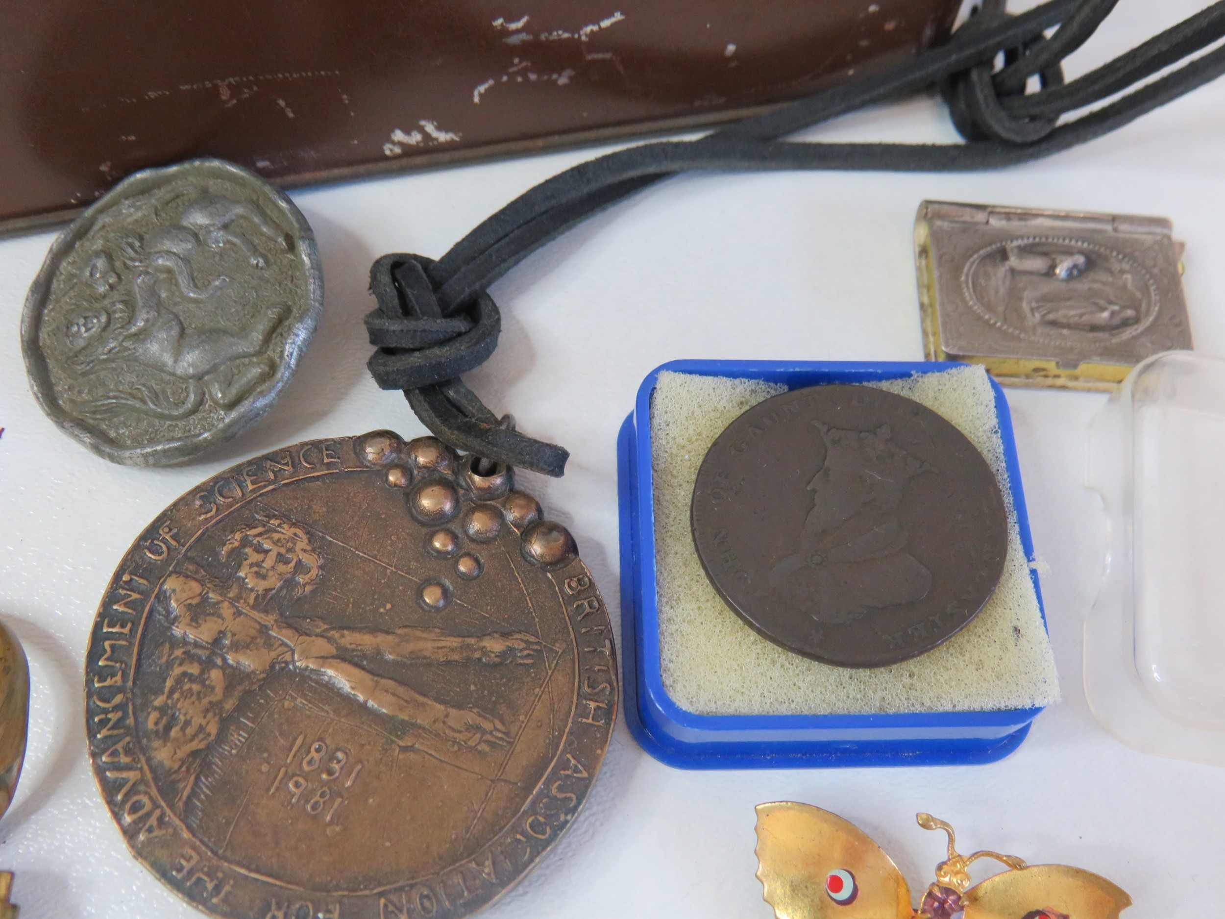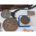Vintage tin full of collectables, badges including Robertsons Golly, medals, jewellery etc.