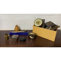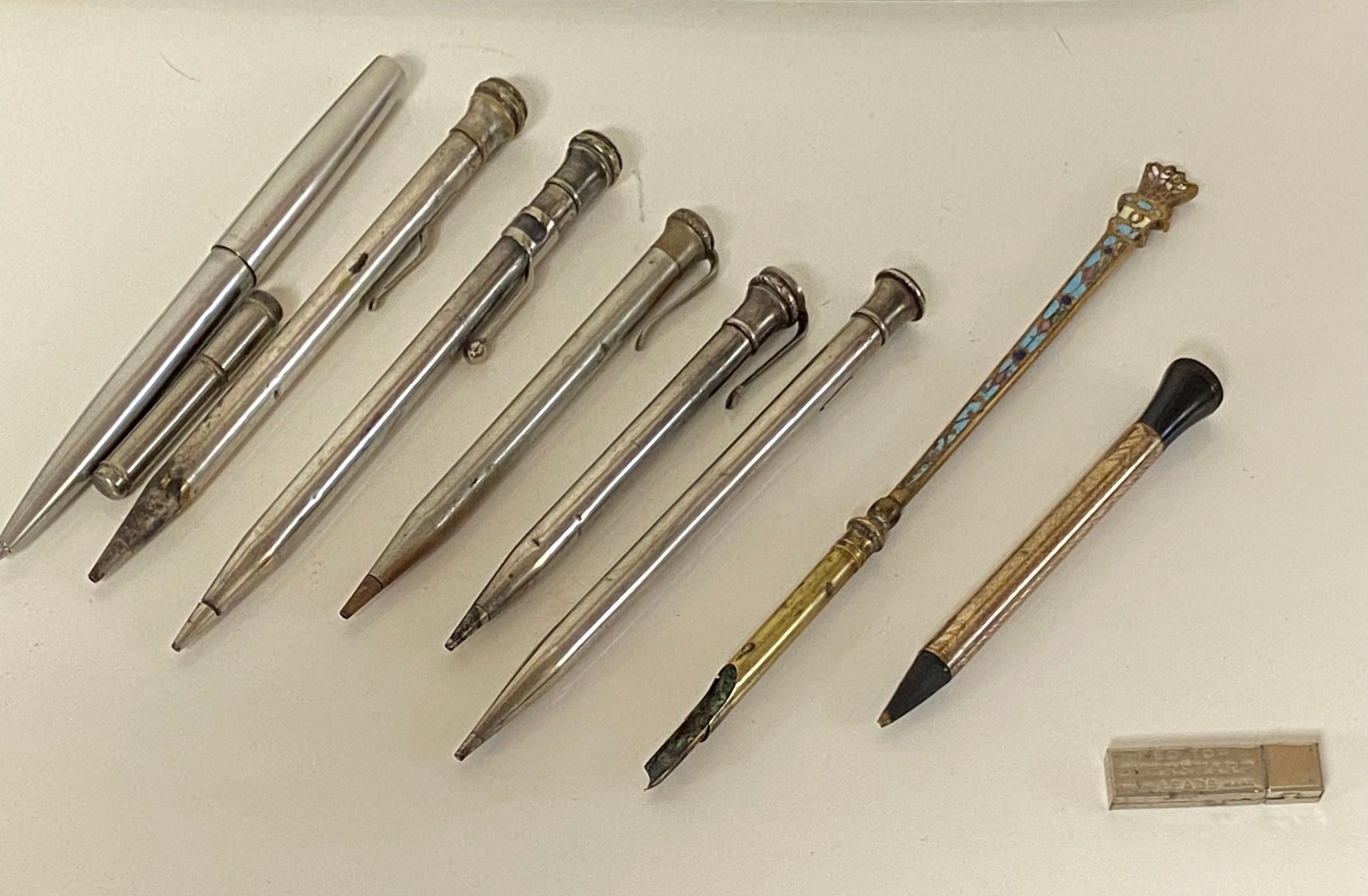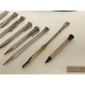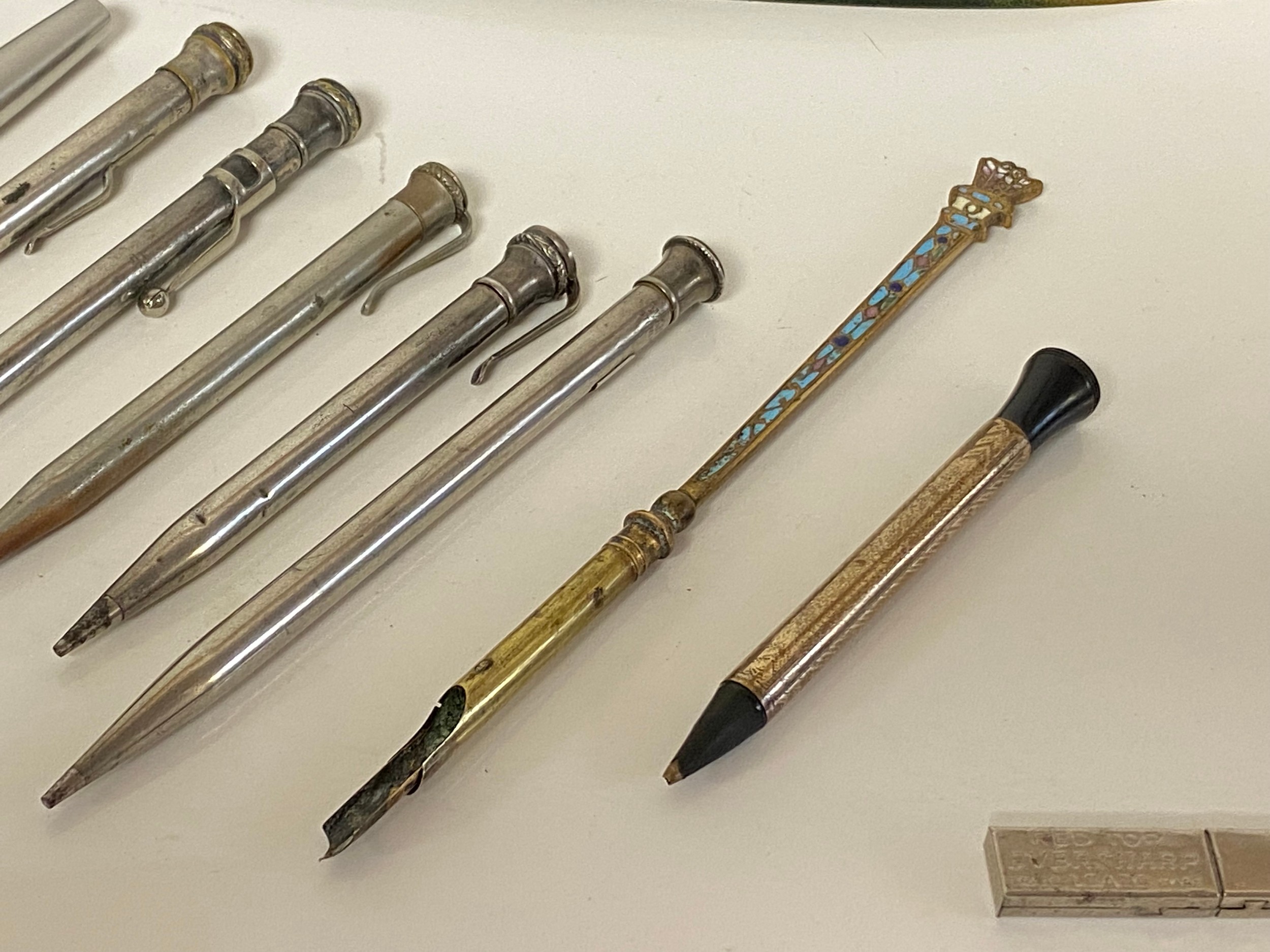 A group of pens and pencils, to include a champleve enamel dip pen and silver propelling pencil -