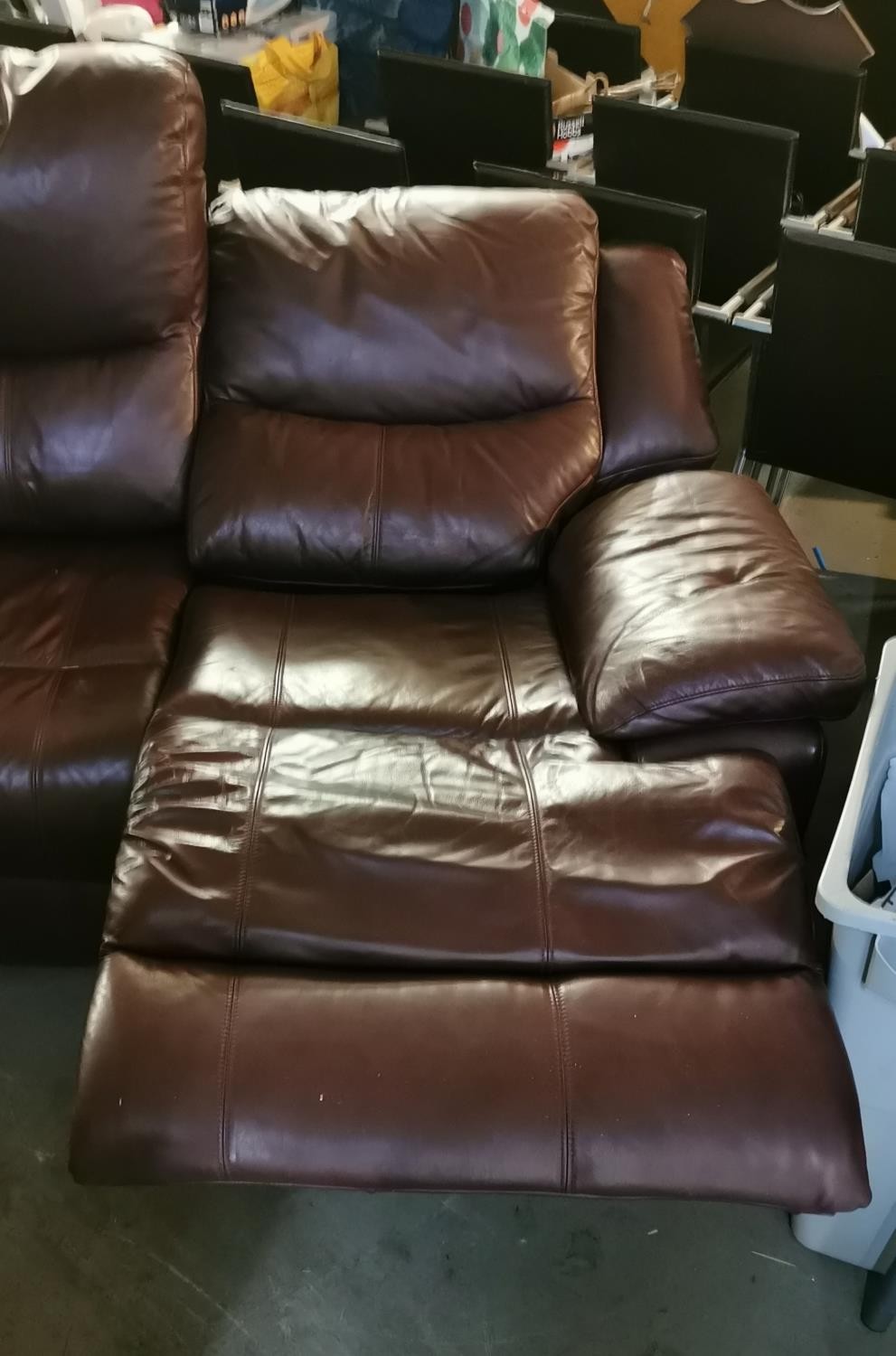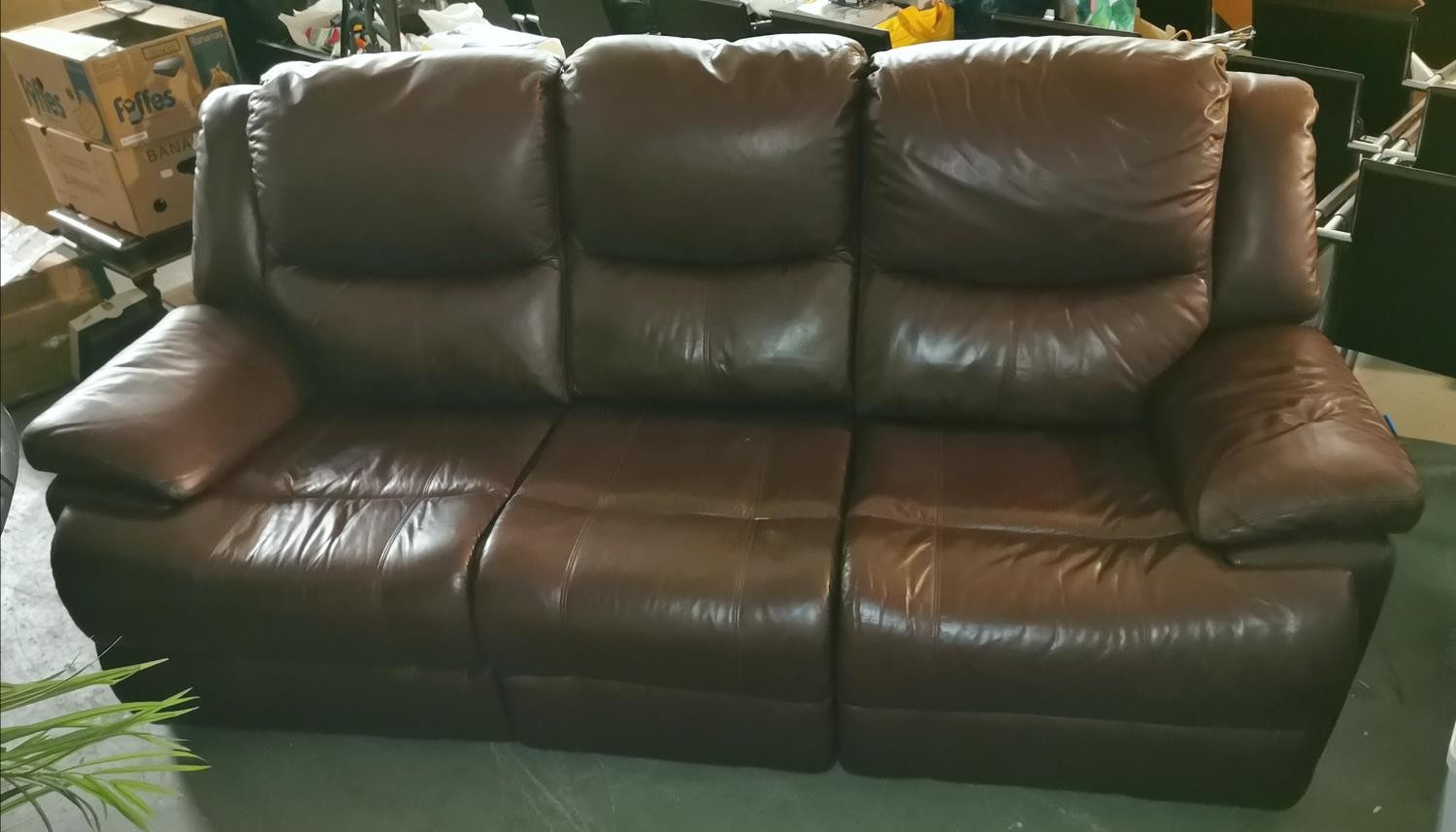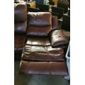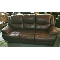 Approx 230 cm long brown leather 2 section 3 seater manual recline couch in VG condition