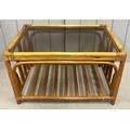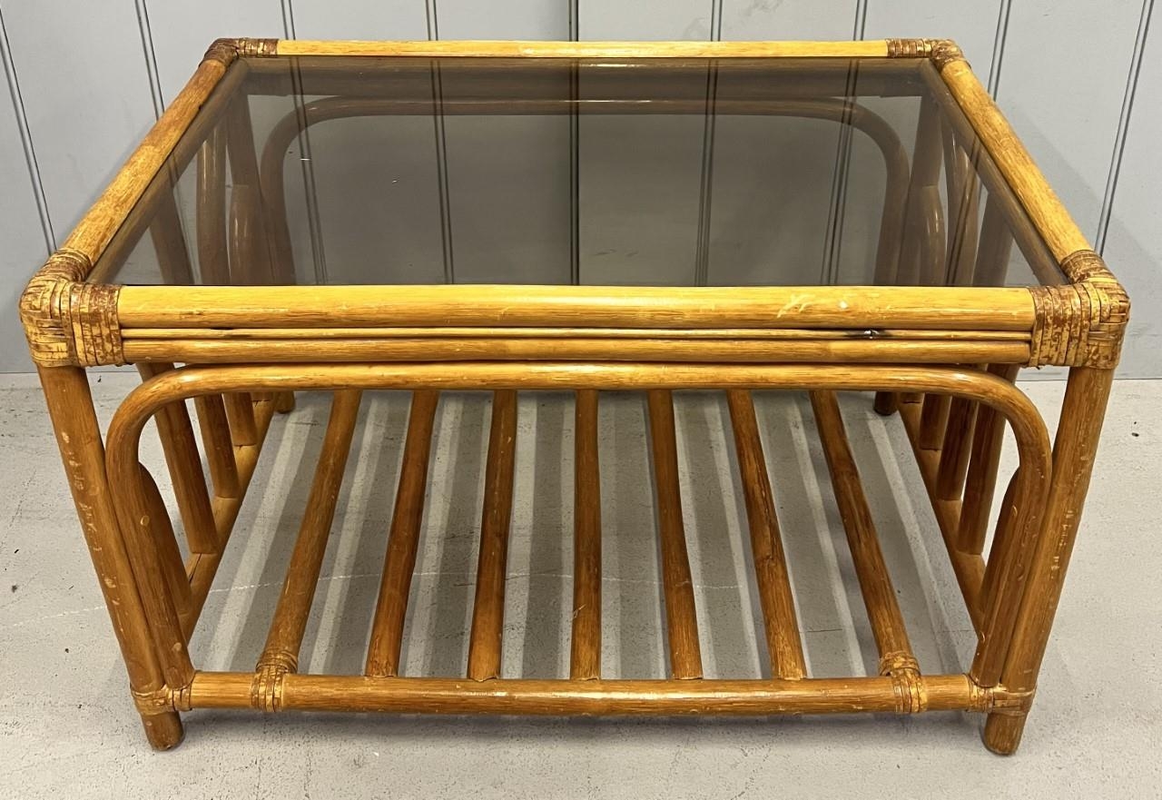 A vintage, glass-topped, bamboo coffee table. Dimensions(cm) H46, W75, D50.