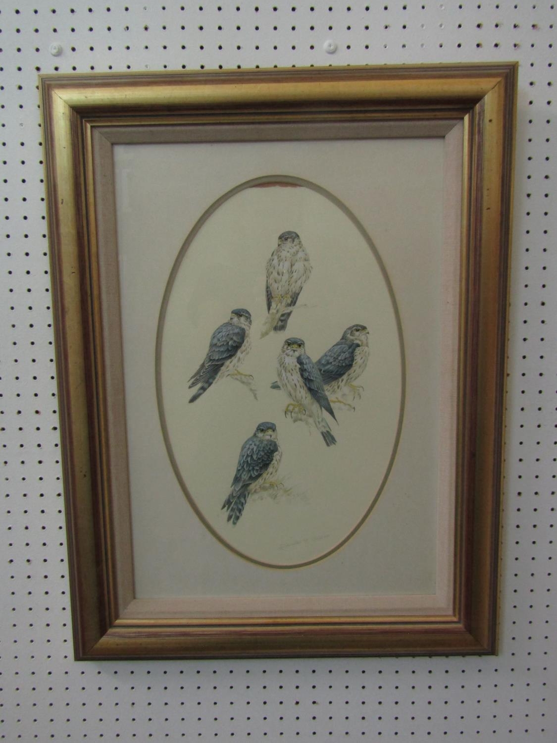 Dennis McCallum (Scottish B.1951) - Studies of a young Merlin, watercolour on paper, signed and with The Maxwelltown Gallery Dumfries label verso dated 1992, 41cm max oval frame