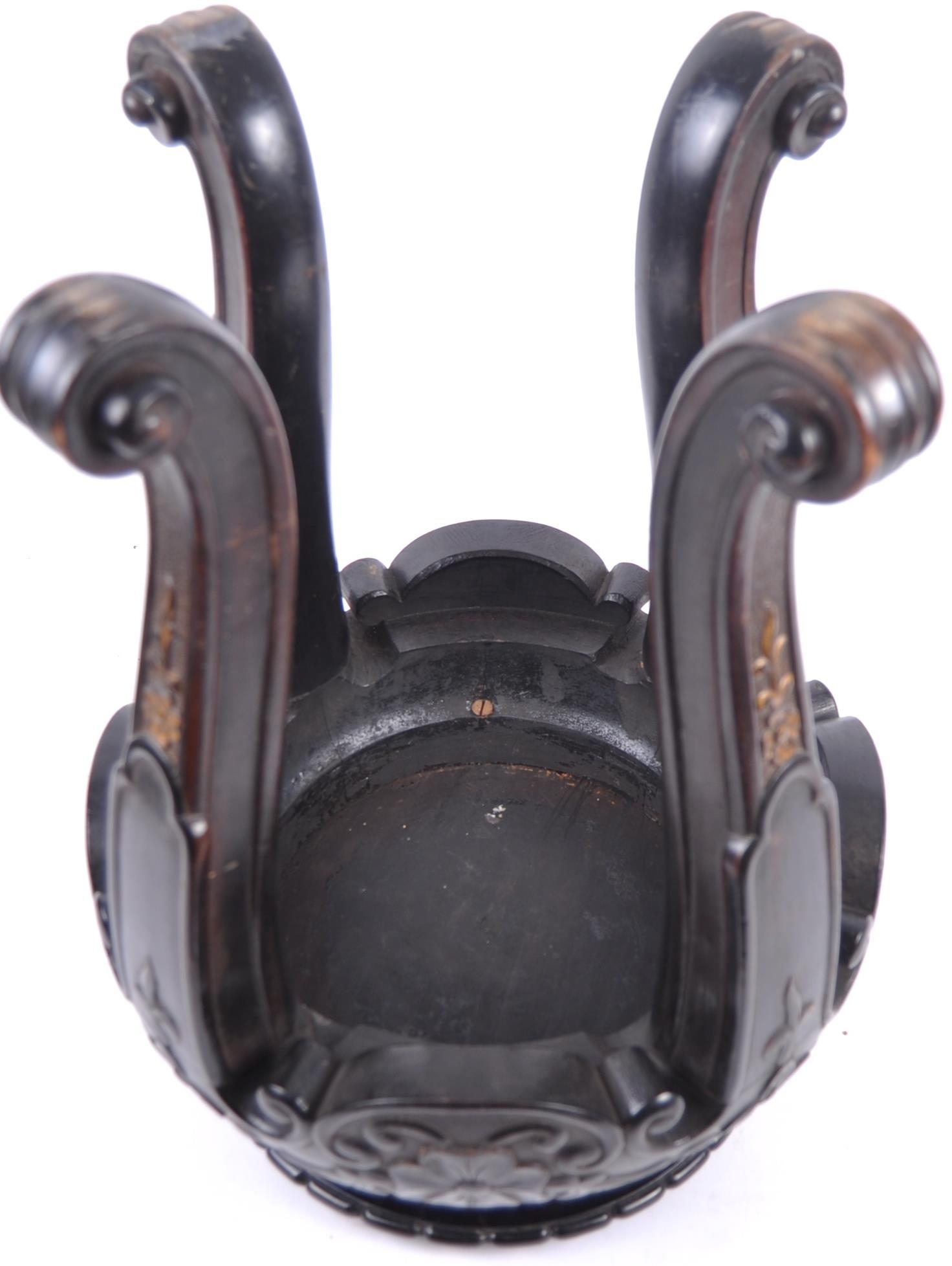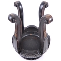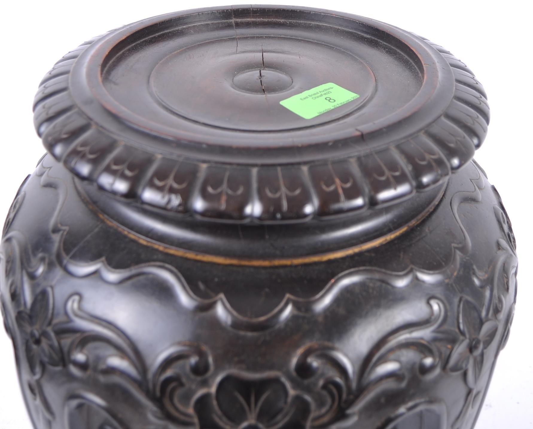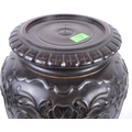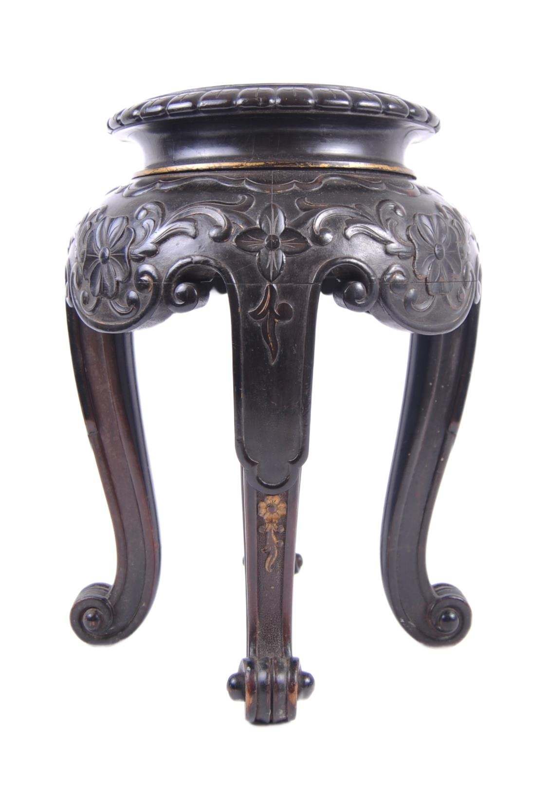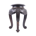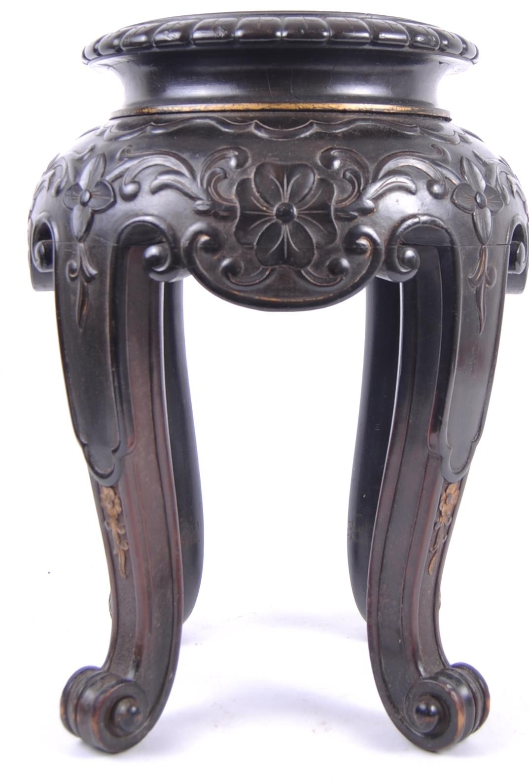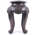 A 19th Century Chinese hand carved jardiniere planter vase stand. Circular form with hand carved details throughout depicting flowers and scrolls. All raised on four scroll legs. Measures approx; 42cm x 30cm. Actual top measures 17cm (for use)