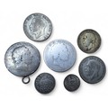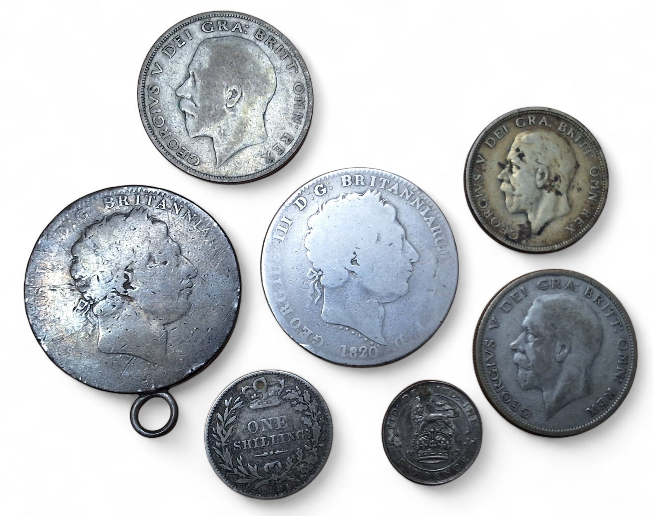 Numismatics - a George III Crown, 1820; another with soldered ring; Queen Victoria One Shilling, 1881; George V two Half Crowns, One Florin and Sixpence; 101.8g gross