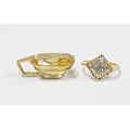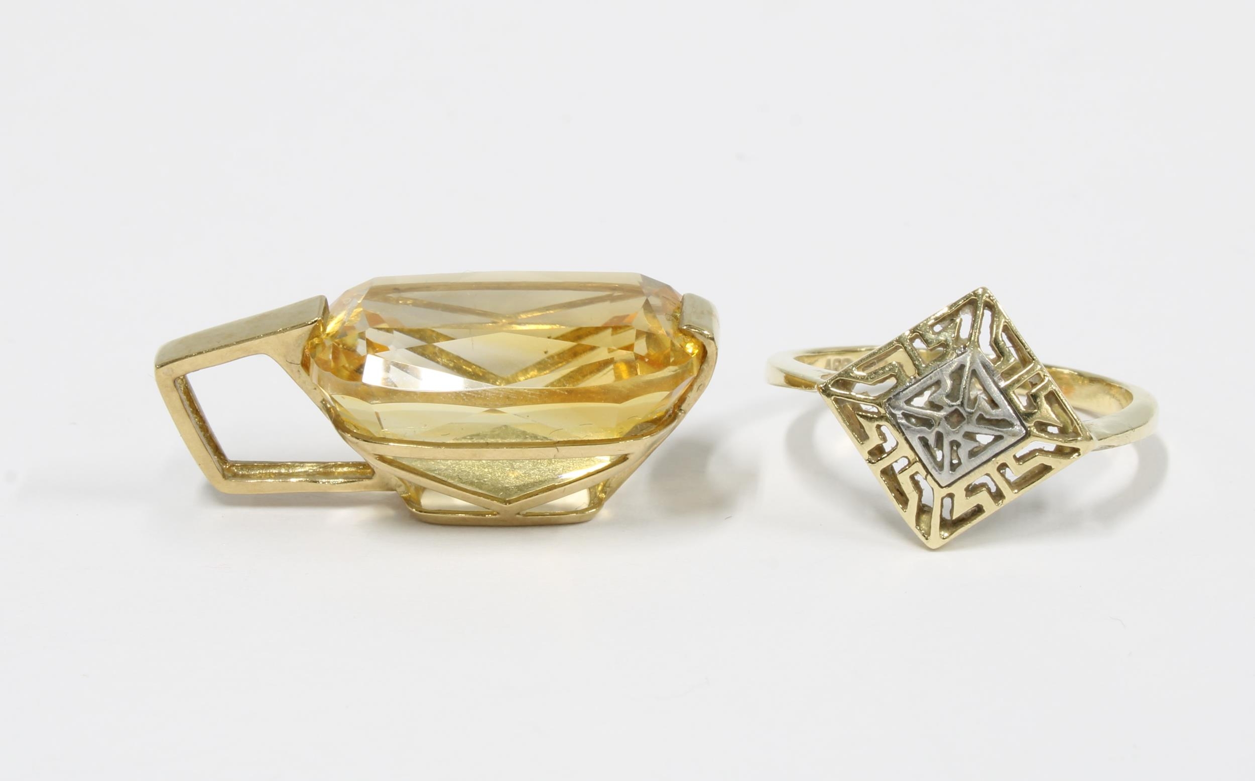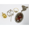 9ct gold framed citrine pendant, stamped 9K & 375, a yellow and white metal ring, with pierced panel, inner band stamped ARR 14K, together with a silver pendant necklace and a flower brooch, stamped silver (4)