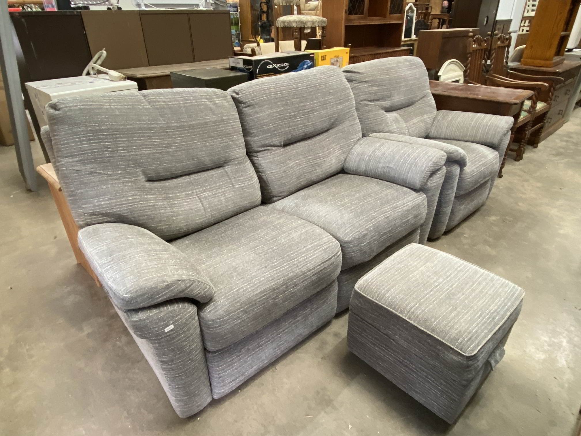3 piece grey upholstered suite (settee 170W, armchair 95W & box footstool)