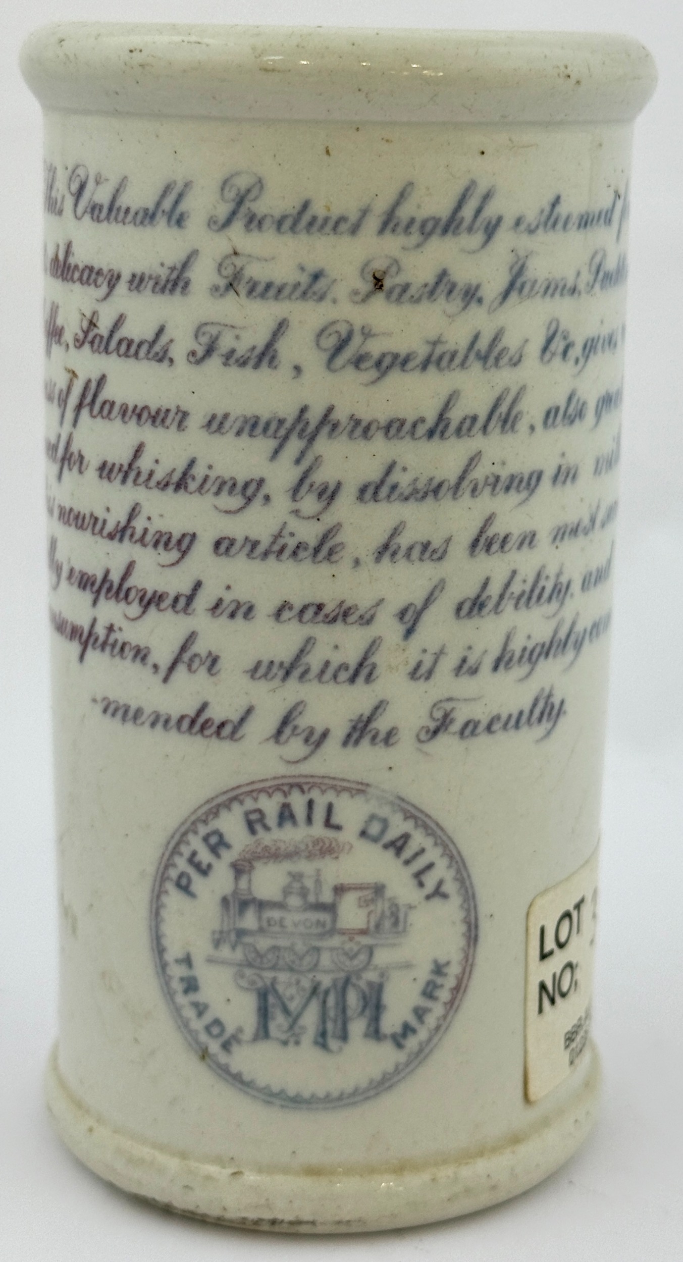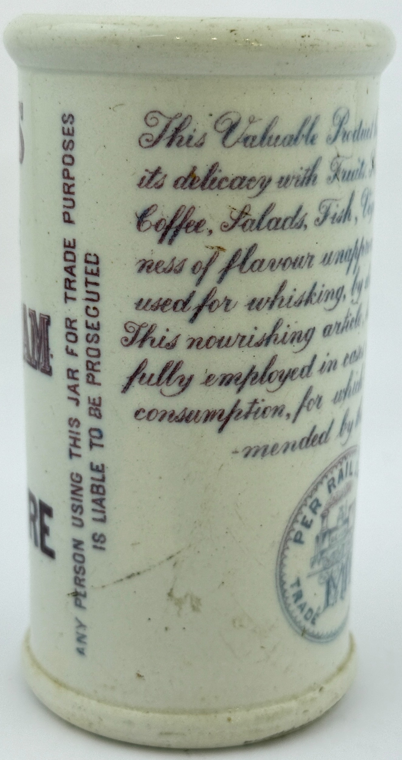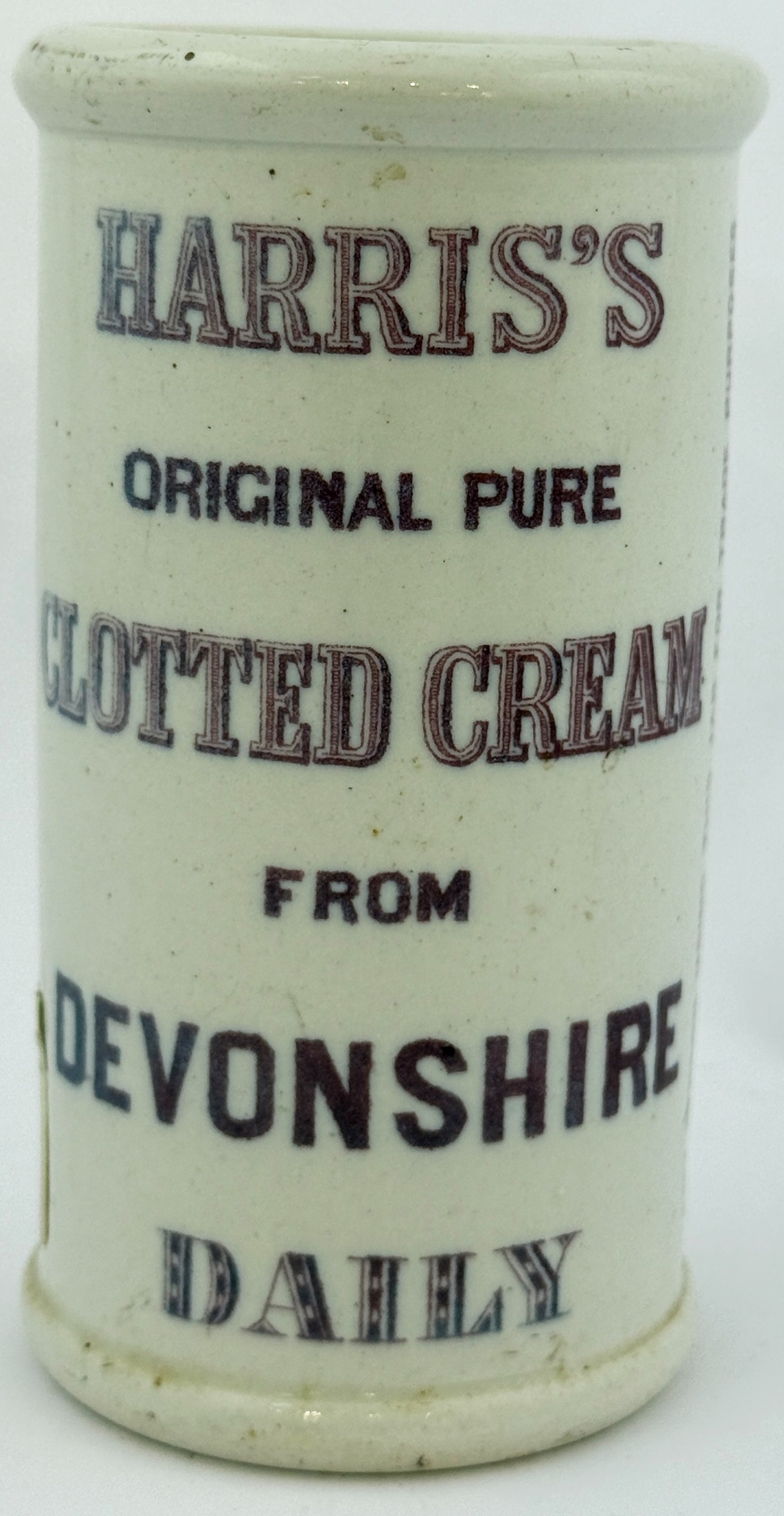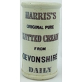 HARRIS CLOTTED CREAM CYLINDER. 4.5ins tall. Purple transfer, rear train pict.