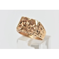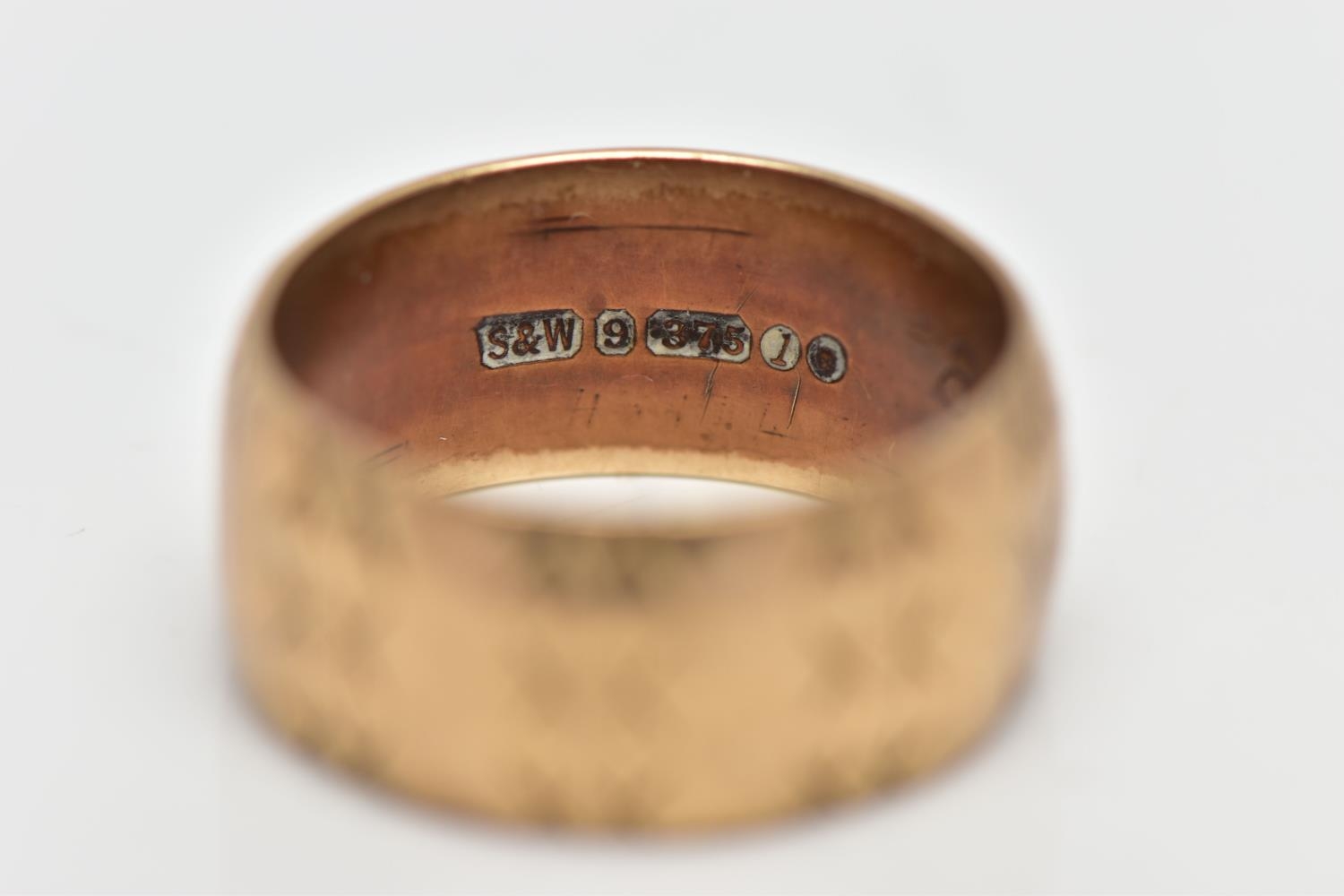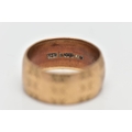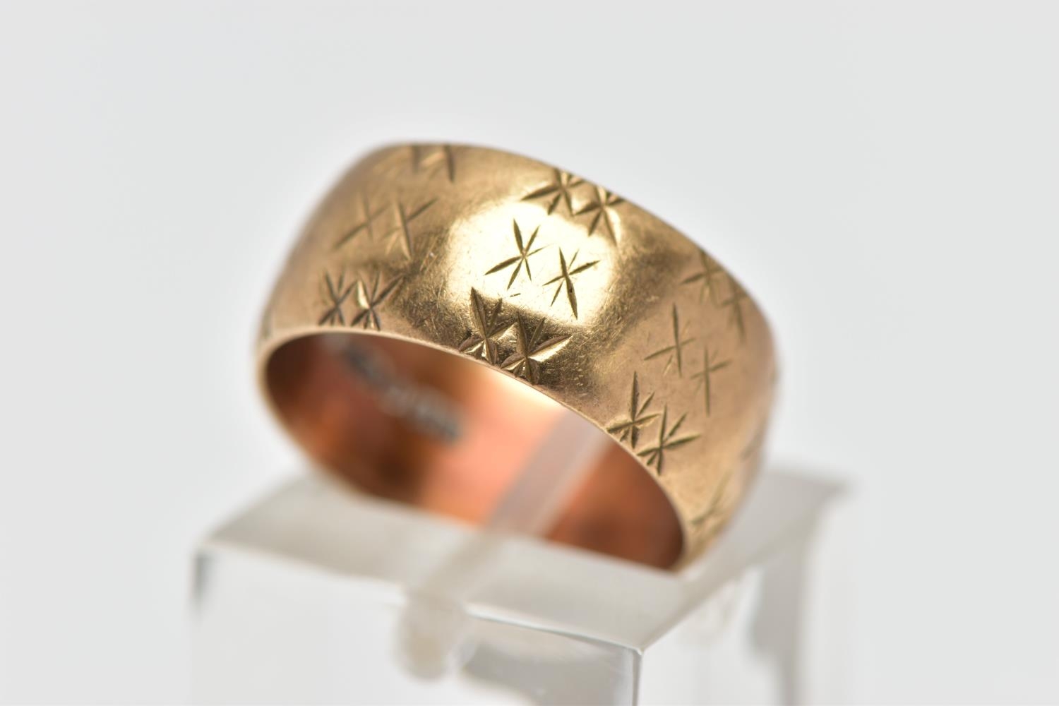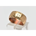 A 9CT GOLD TEXTURED BAND RING, yellow gold wide band with an engraved repetitive star pattern, approximate band width 8.0mm, hallmarked 9ct London 1966, ring size centre K, approximate gross weight 4.9 grams (condition report: general light wear, would benefit from a gentle clean, overall condition good)