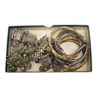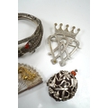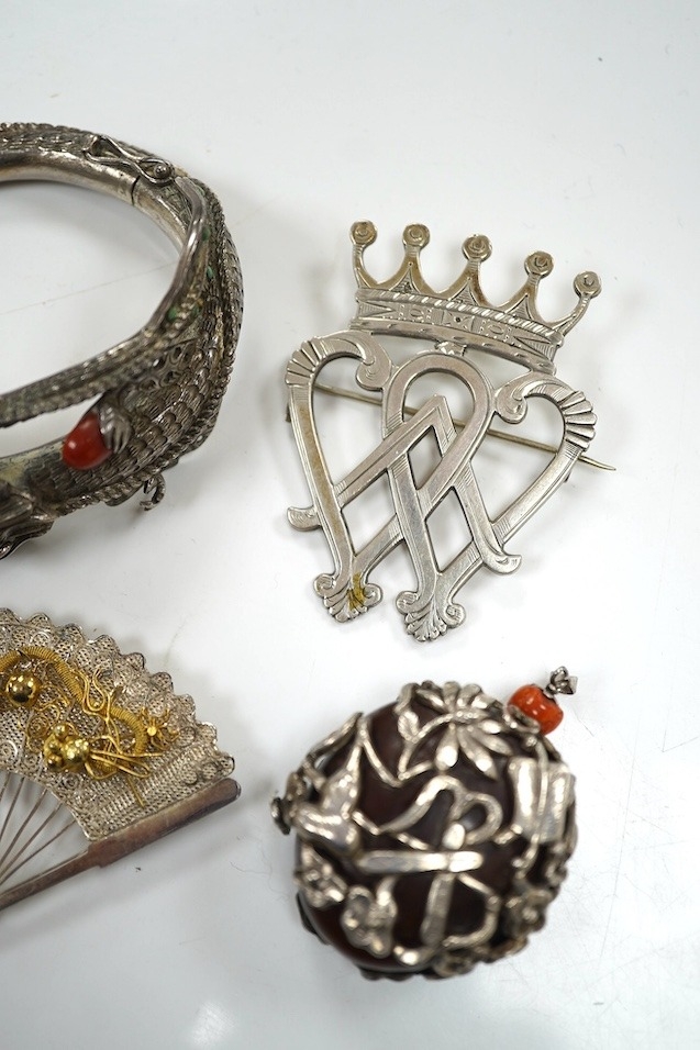 A Chinese white metal and gem set hinged bangle, a similar fan brooch and three other items.