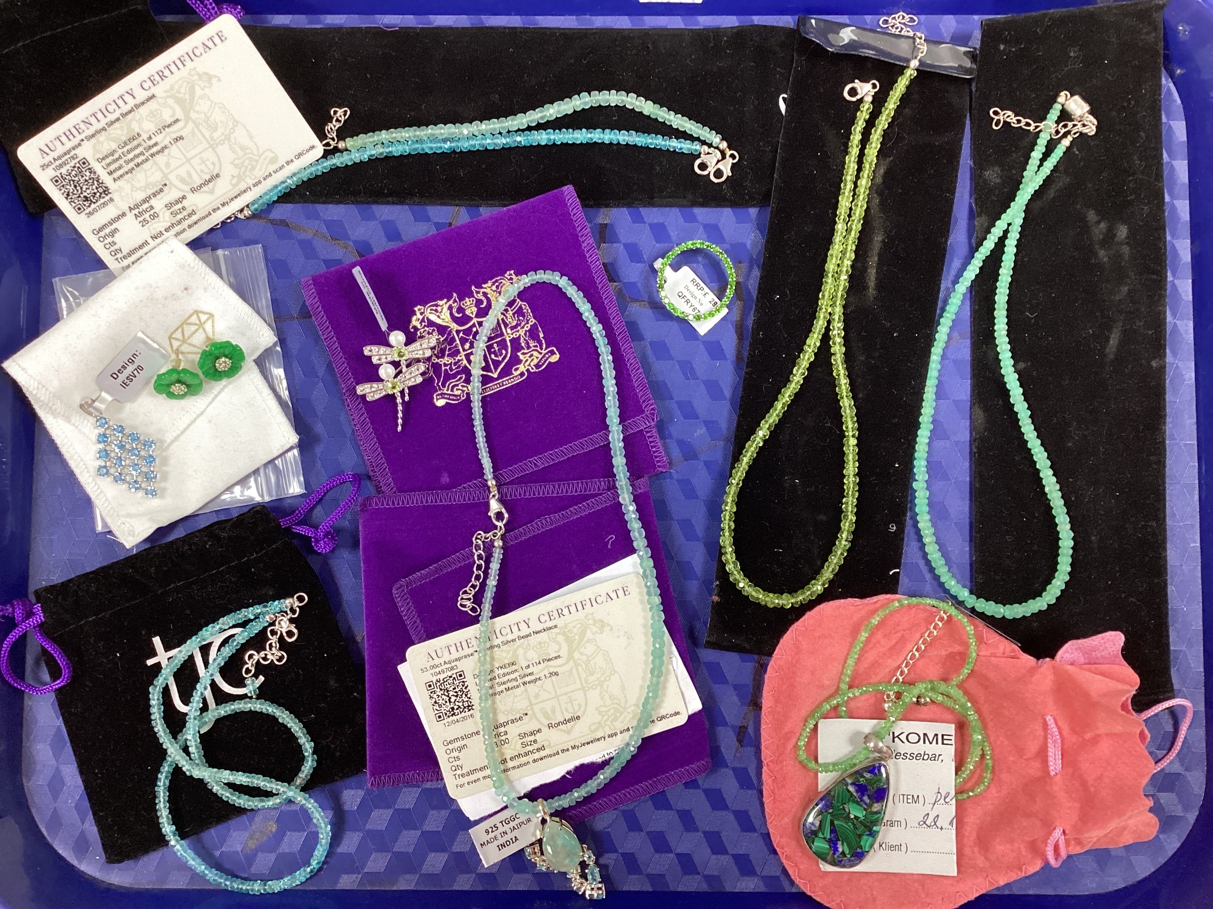 A Collection of Stone Set "925" Jewellery, including Gemporia faceted Aquaprase bead necklace, of drop design, TGGC stone set pendant brooch, of dragonfly design, chrome diopside set pendant of open circle form etc :- One Tray