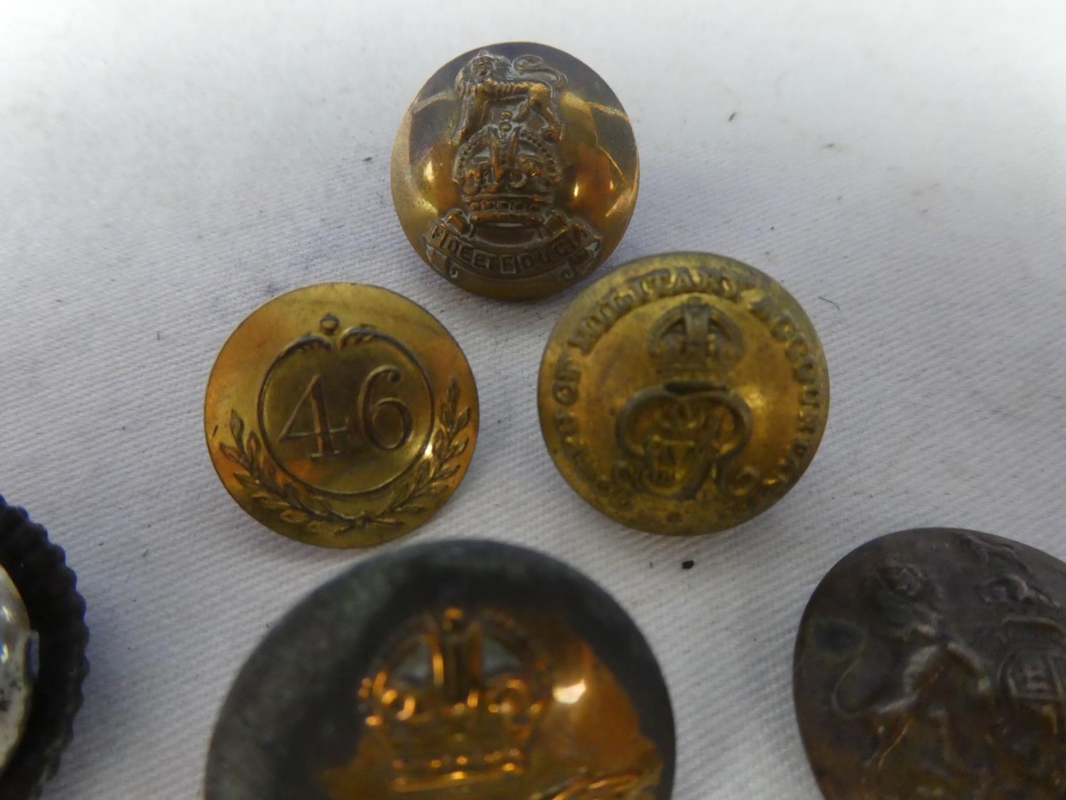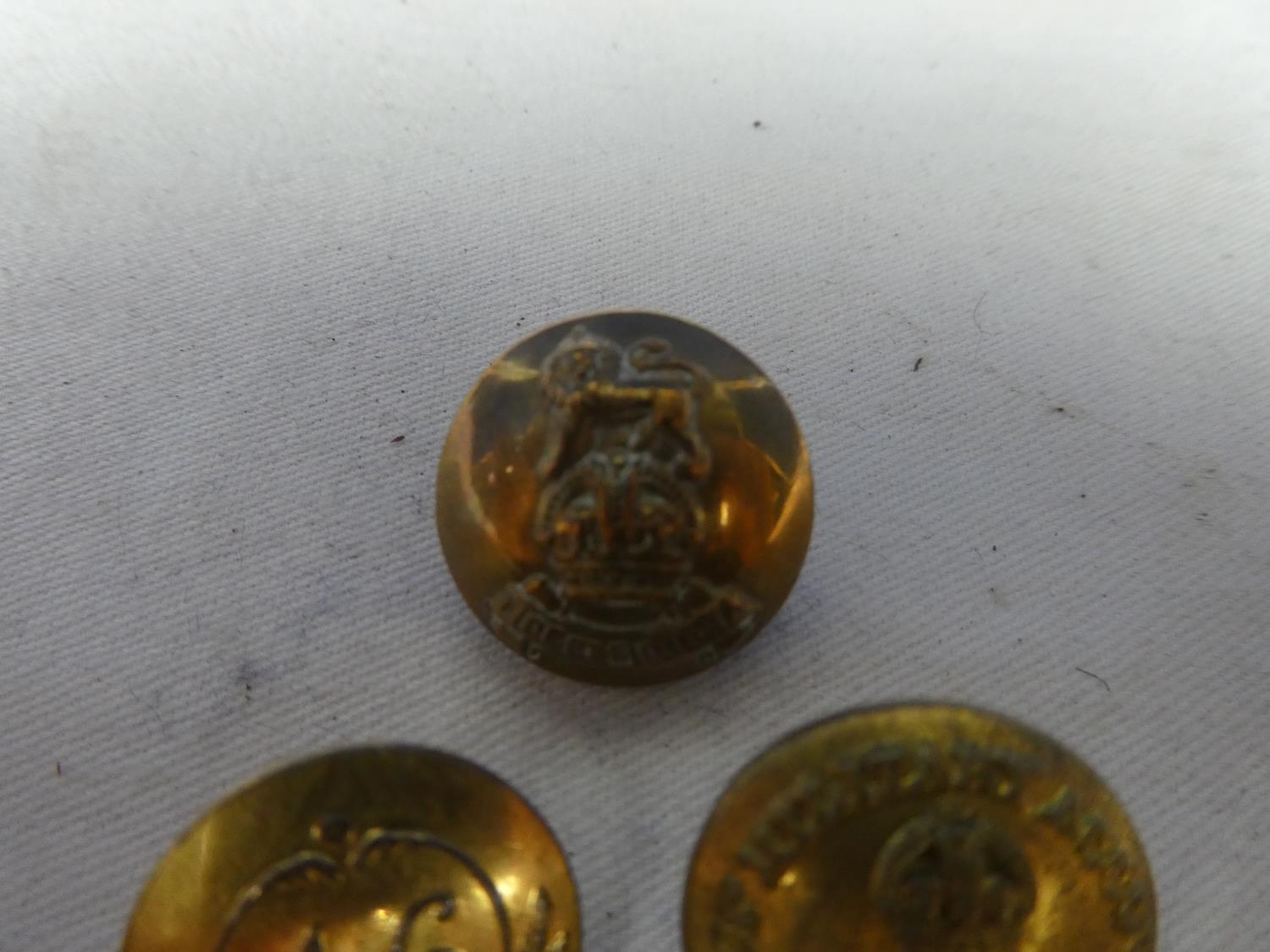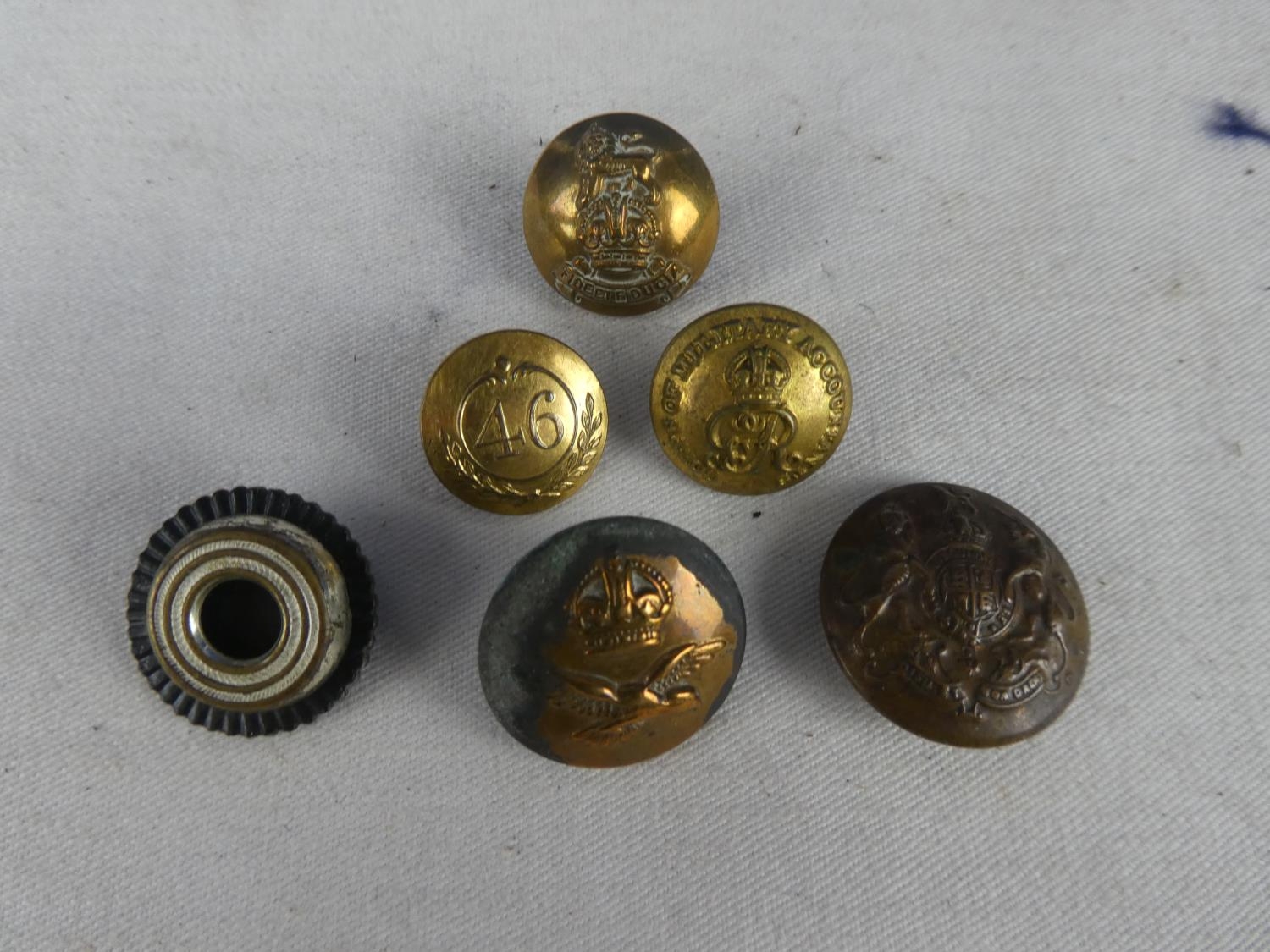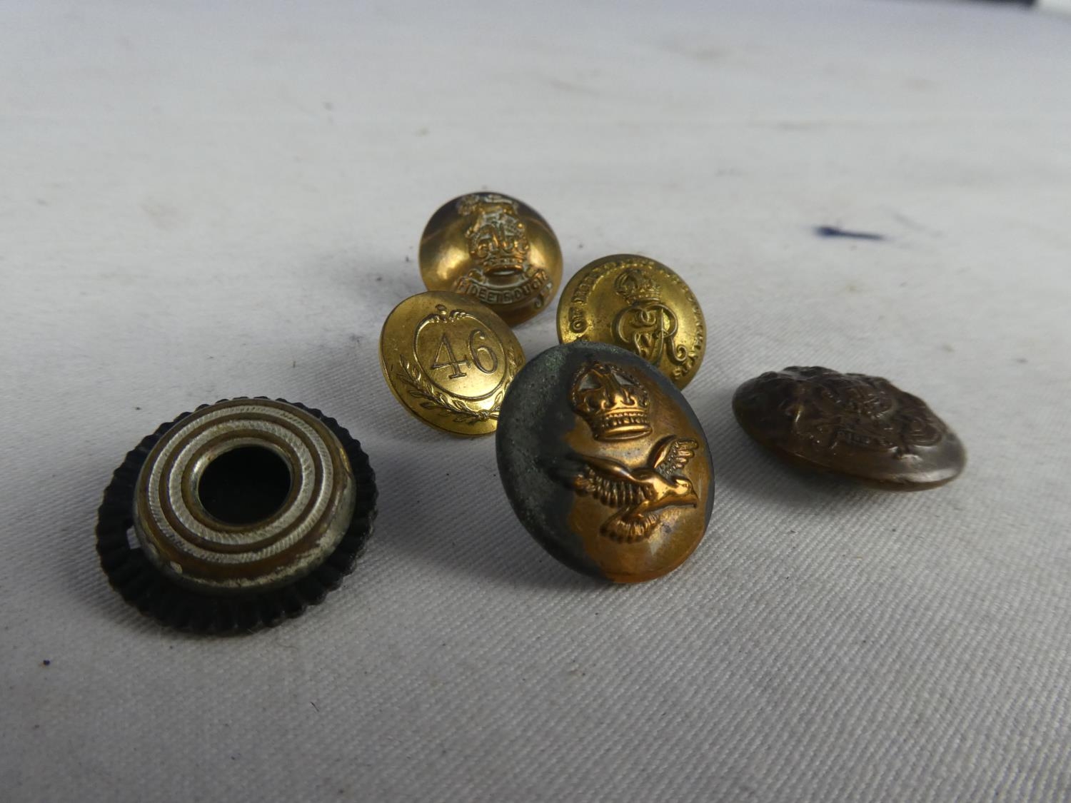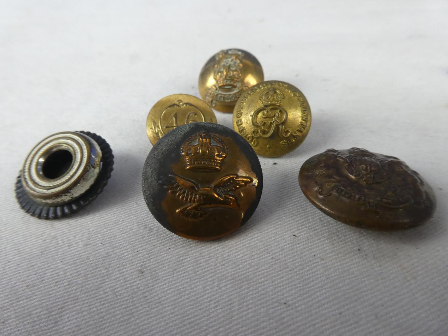 An assortment of six British Military buttons to include a Crown and a Eagle RAF button and a British Army General button and more.