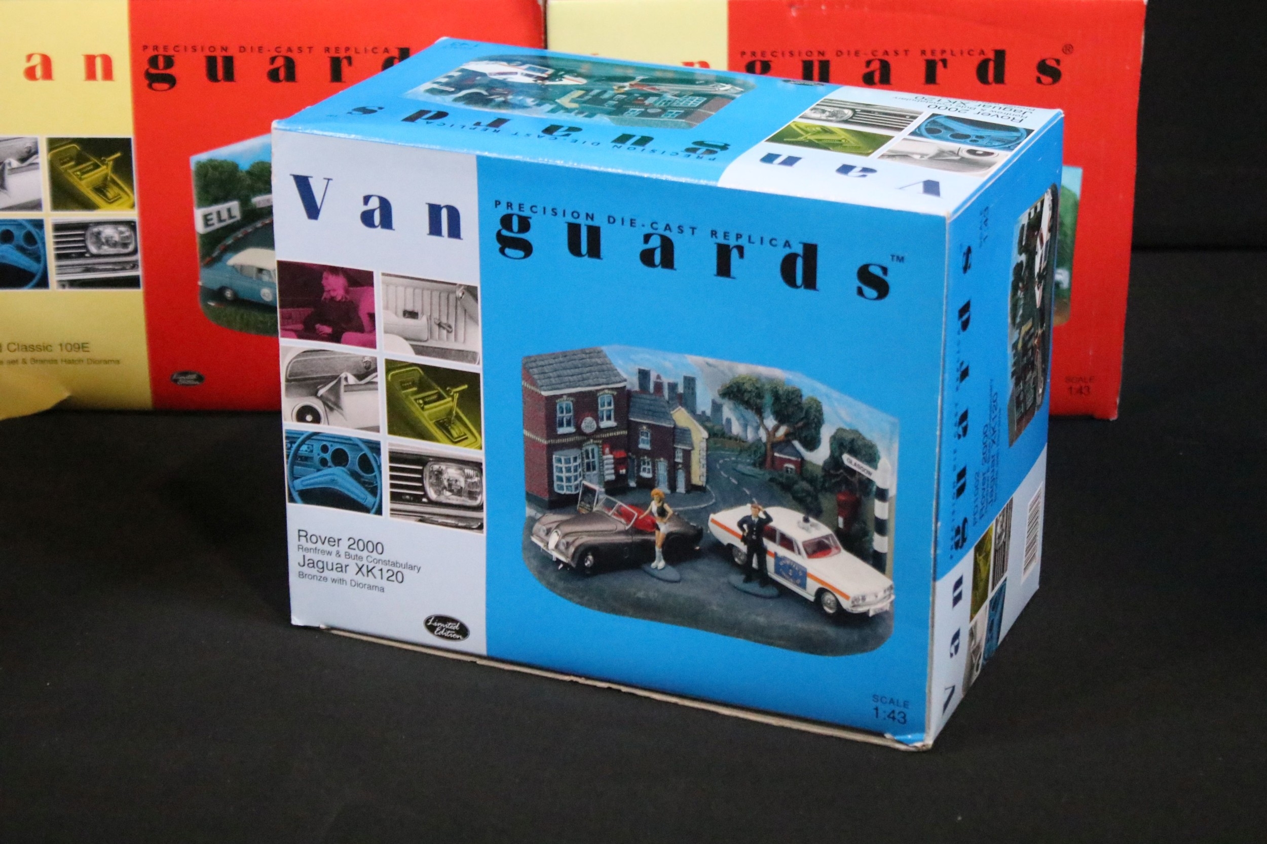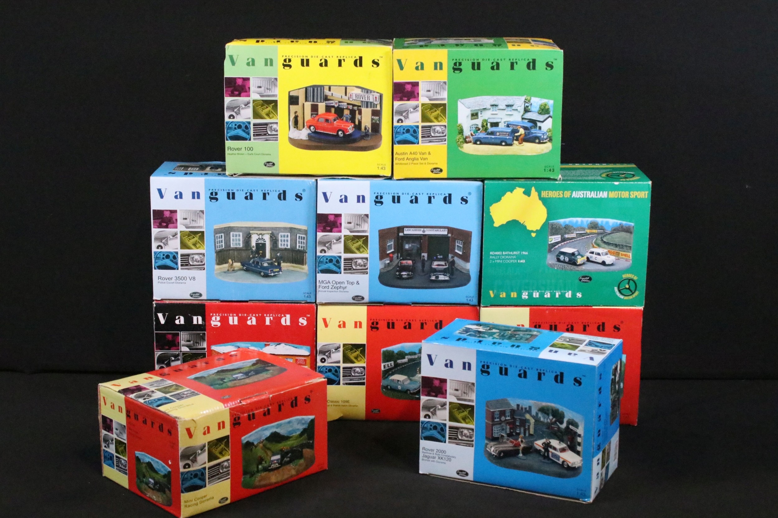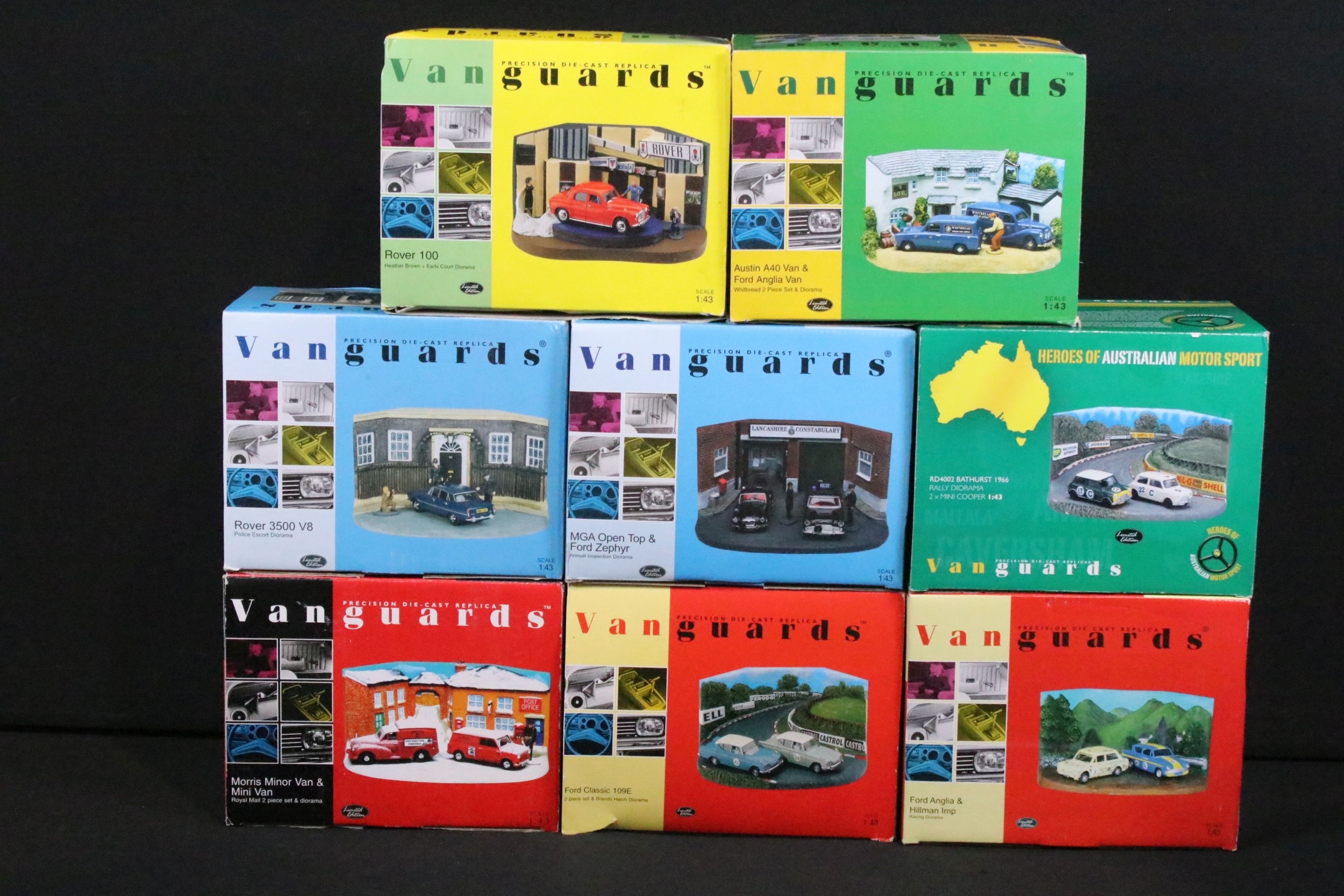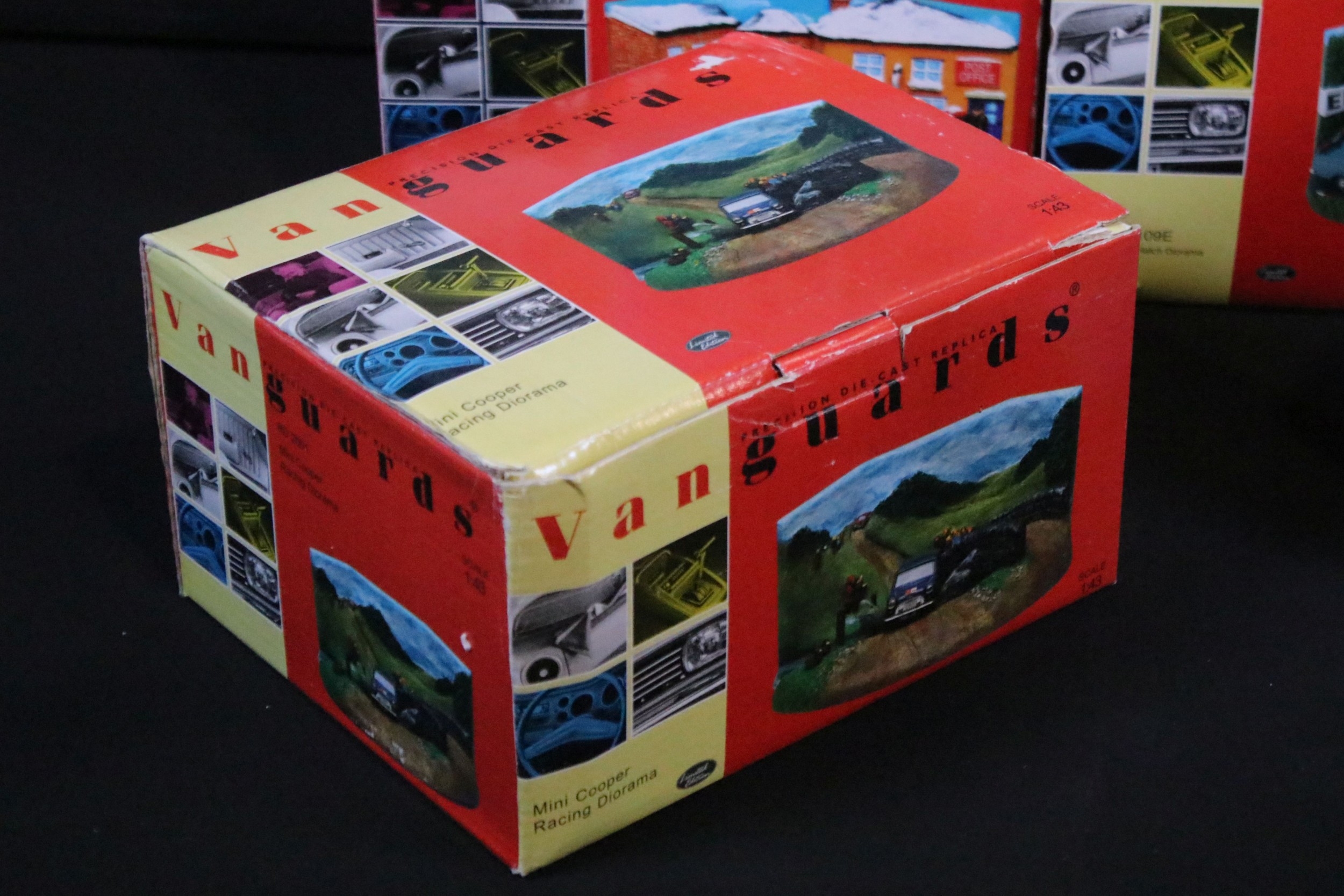 Ten boxed Vanguards diecast model diorama sets to include GD1002 Morris Minor Van & Mini Van Royal Mail 2 Piece Set & Diorama, PD3002 Rover 3500 V8 Police Escort Diorama, RD4002 Heroes Of Australian Motor Sport Bathurst 1966 Rally Diorama 2 x Mini Cooper, RD2001 Mini Cooper Racing Diorama, RD3002 Ford Anglia & Hillman Imp Racing Diorama, etc, all ex overall