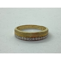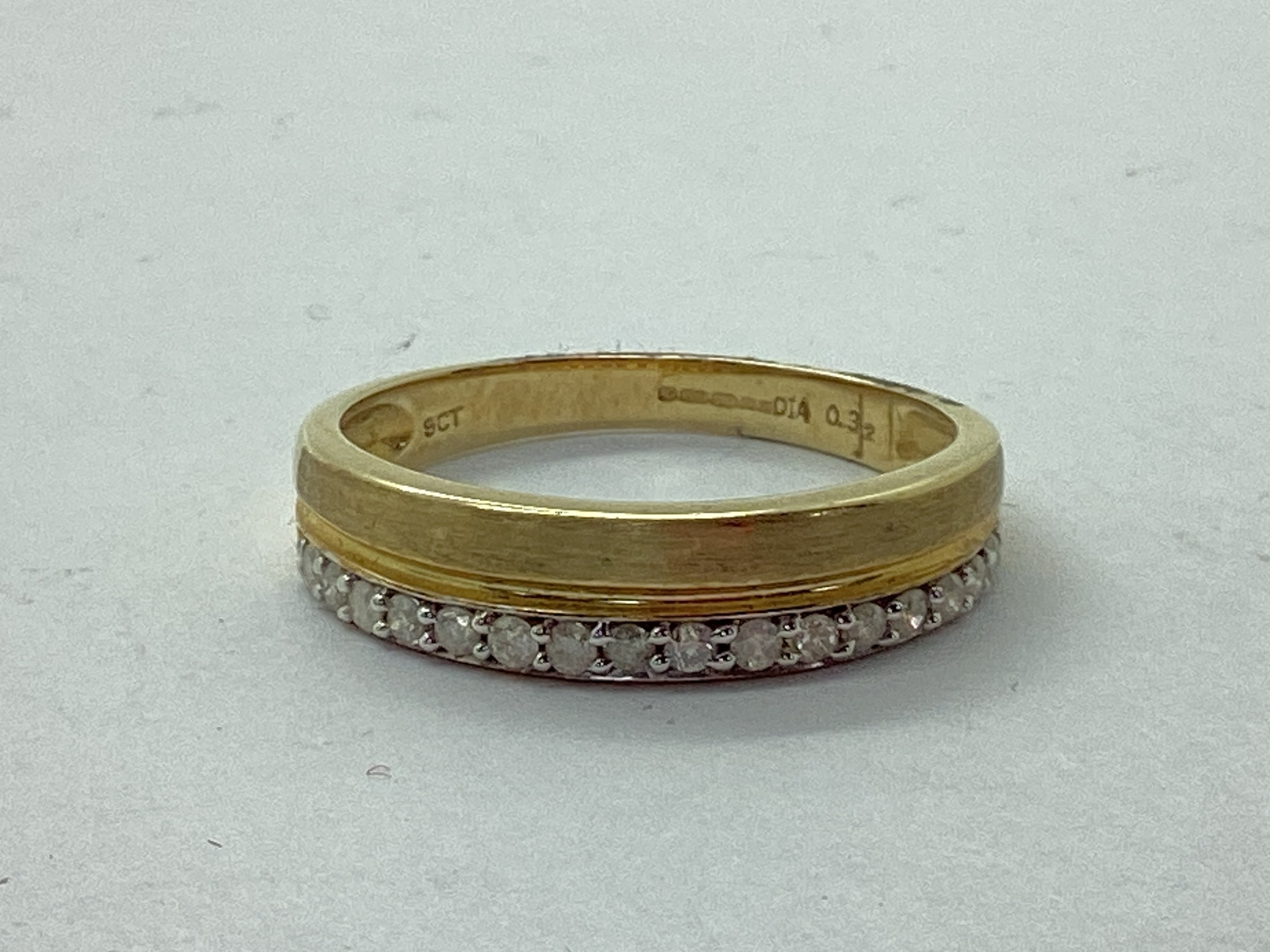 A Modern Gent's 9ct Gold Diamond Set Ring, the brilliant cut stones claw set, with part brushed finished, to tapered shoulders, stamped "DIA 0.32" (finger size V).