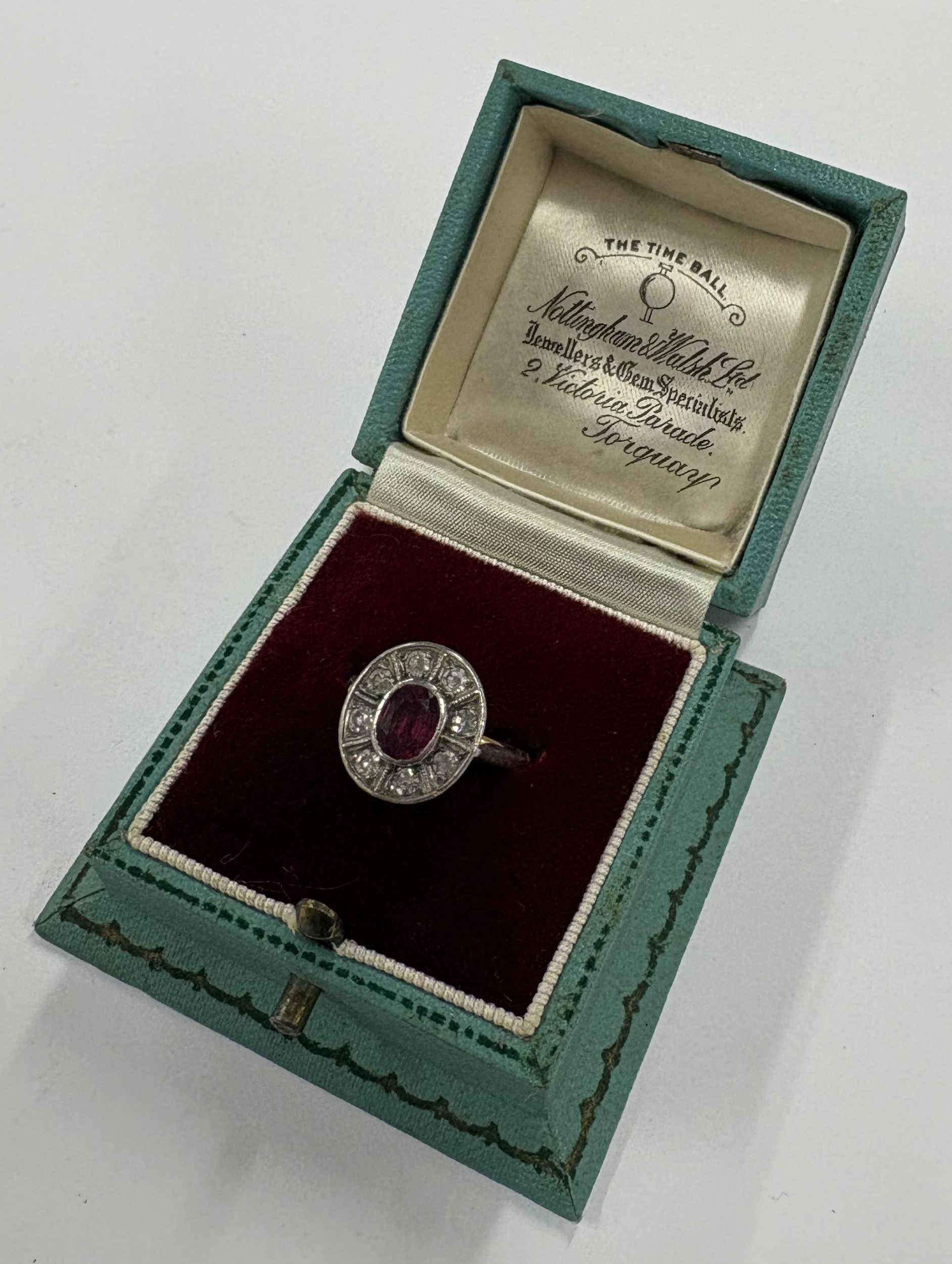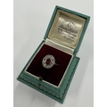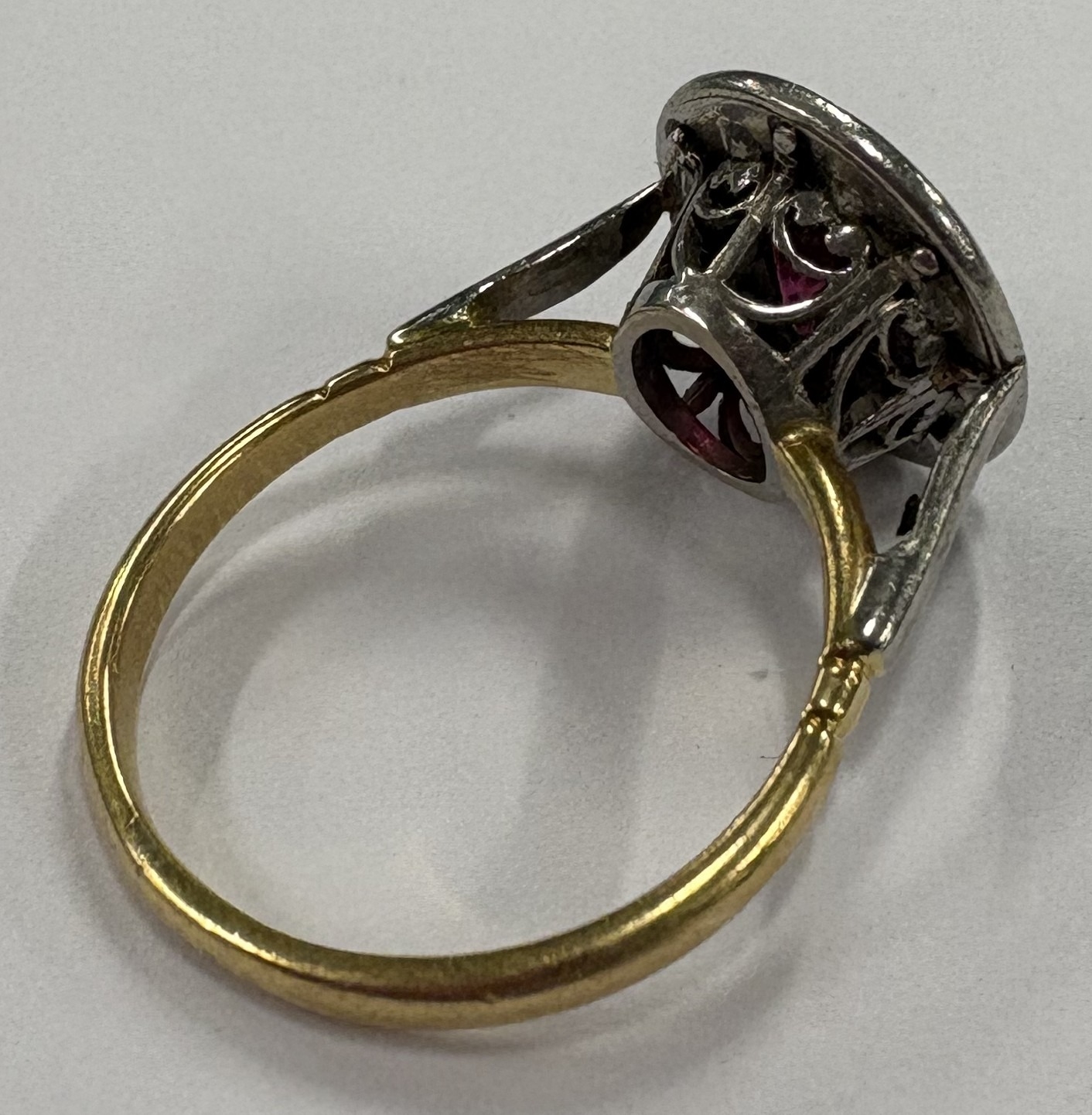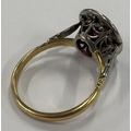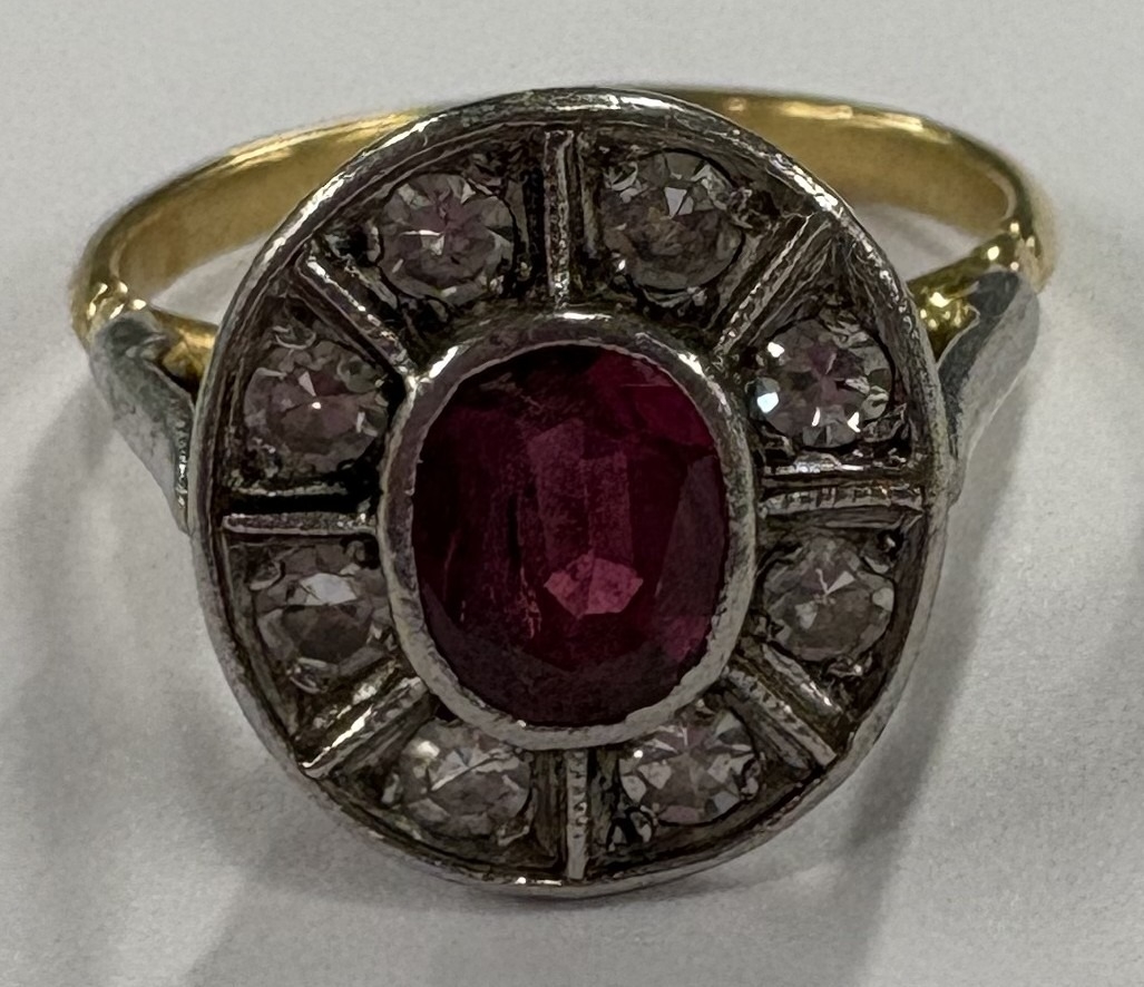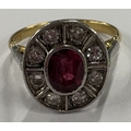 A heavy ruby and diamond oval cluster ring in carved 18 carat and platinum setting. Approx. size O. Approx. 5.3 grams. Est. £300 - £500.