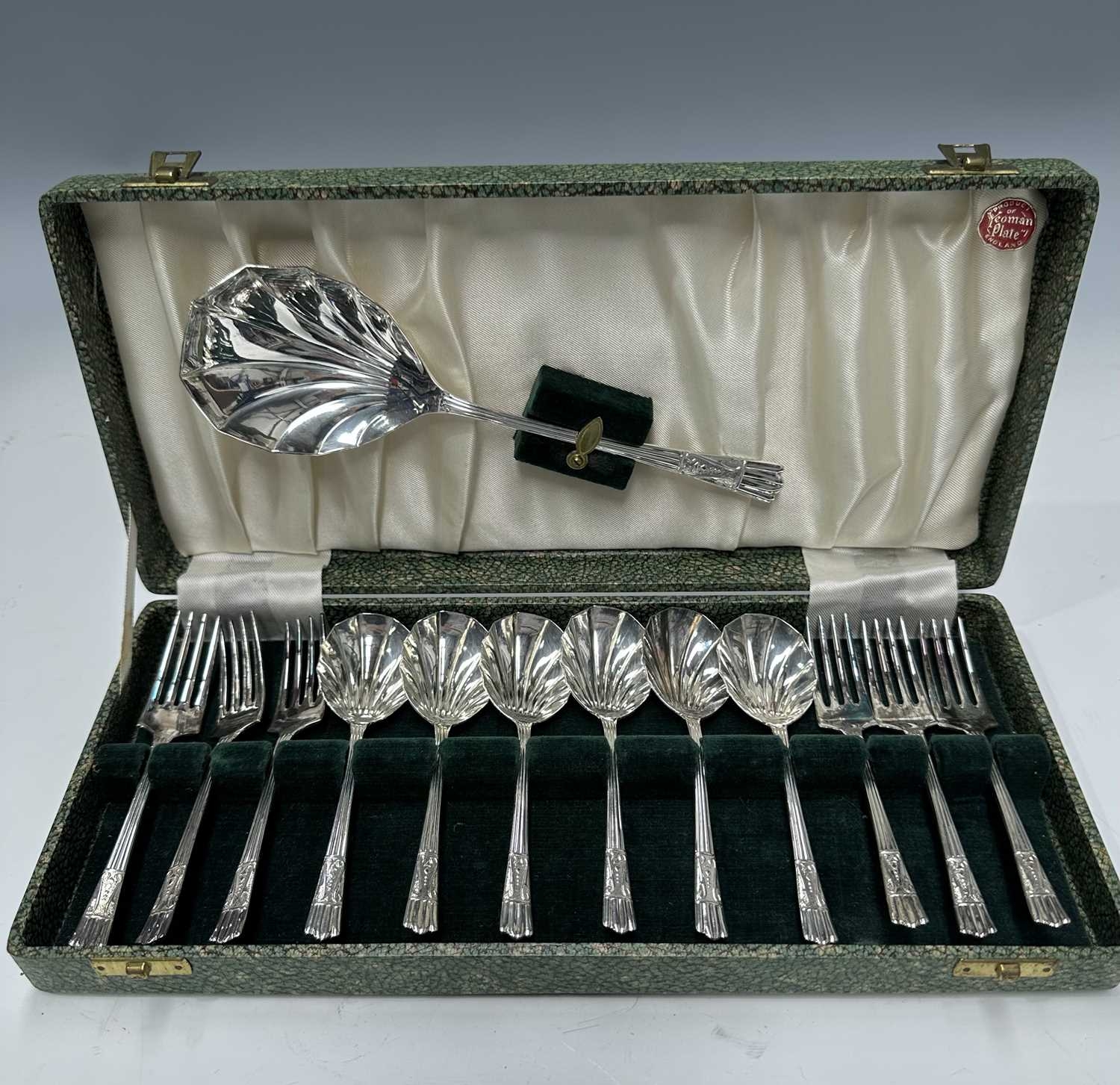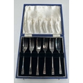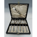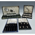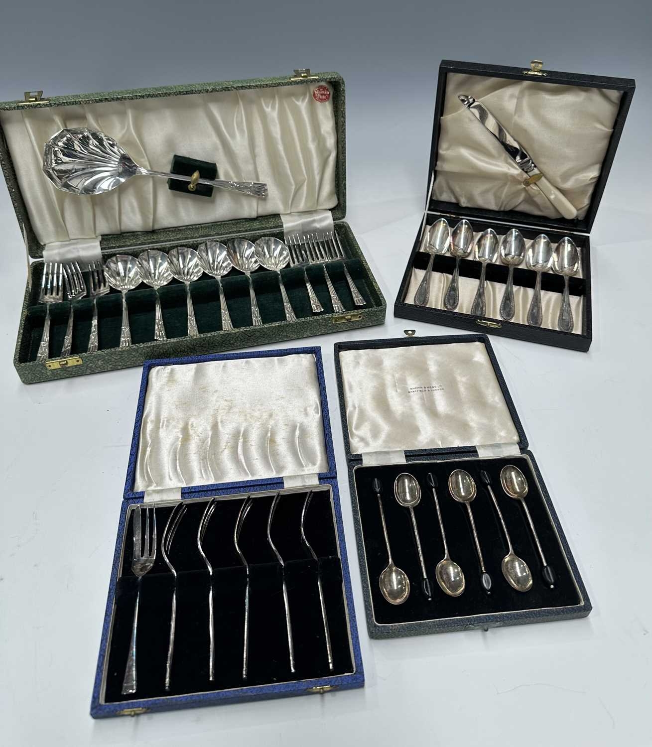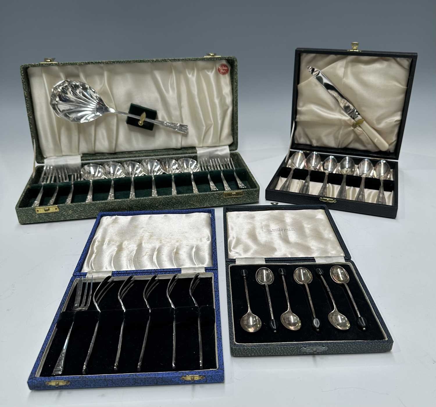 A collection of silver and plated flatware to include: six silver Mappin and Webb cased coffee spoons with coffee bean finials, six plated, cased, grapefruit spoons; salad forks, and a set of fruit spoons and forks, (4)
