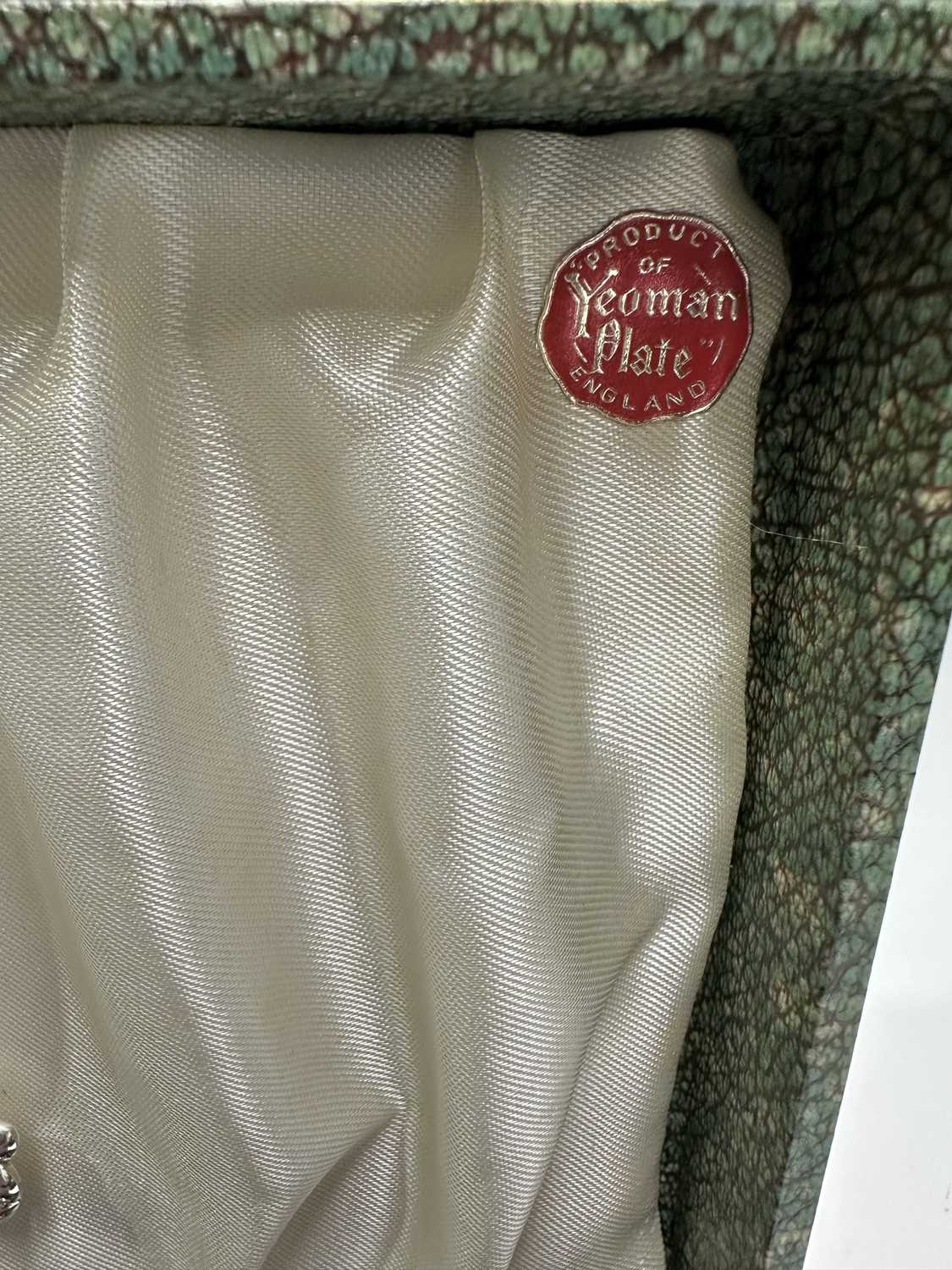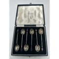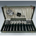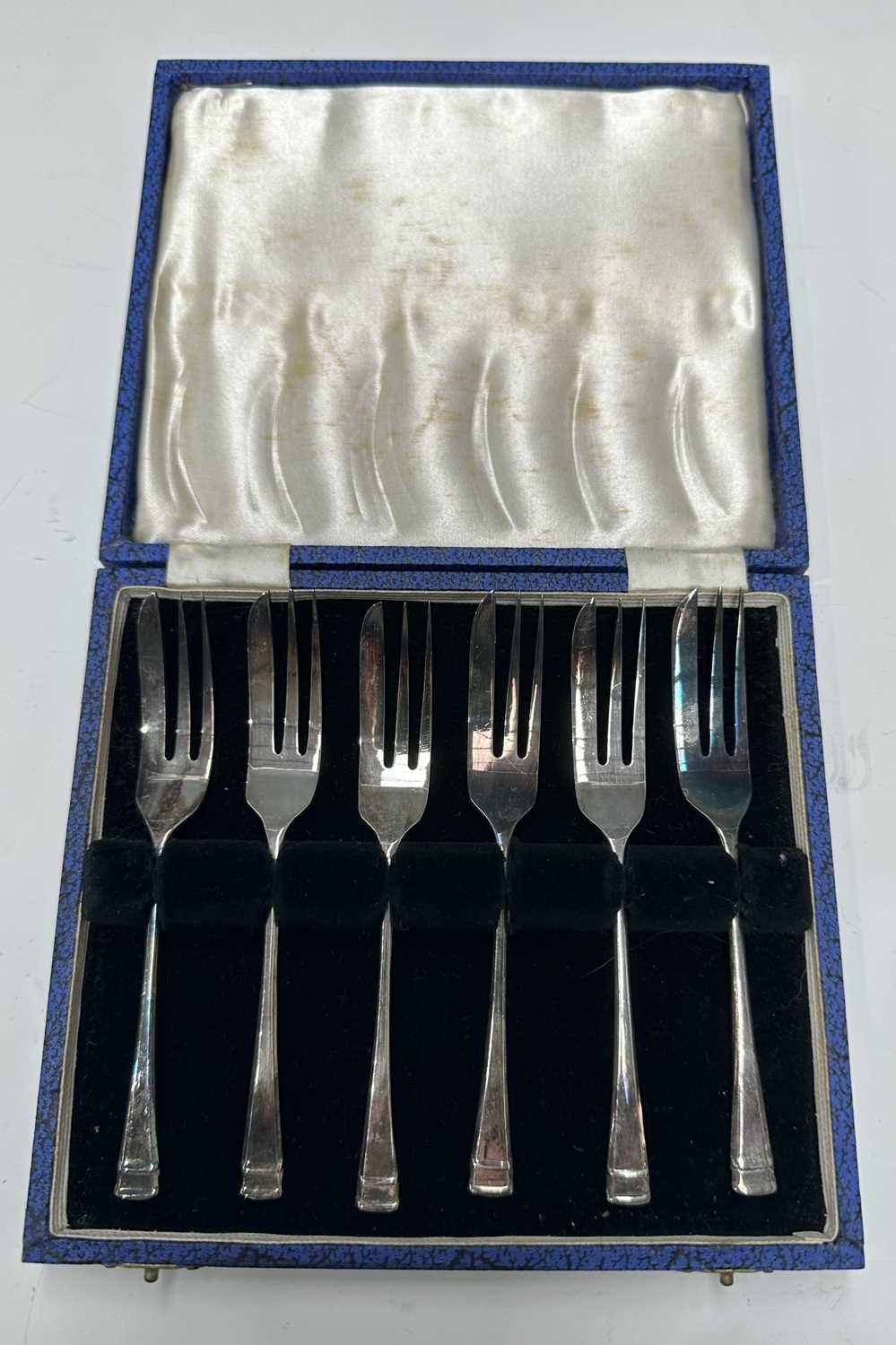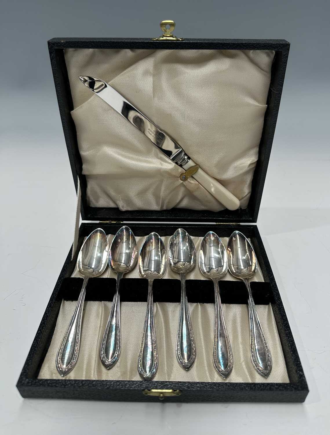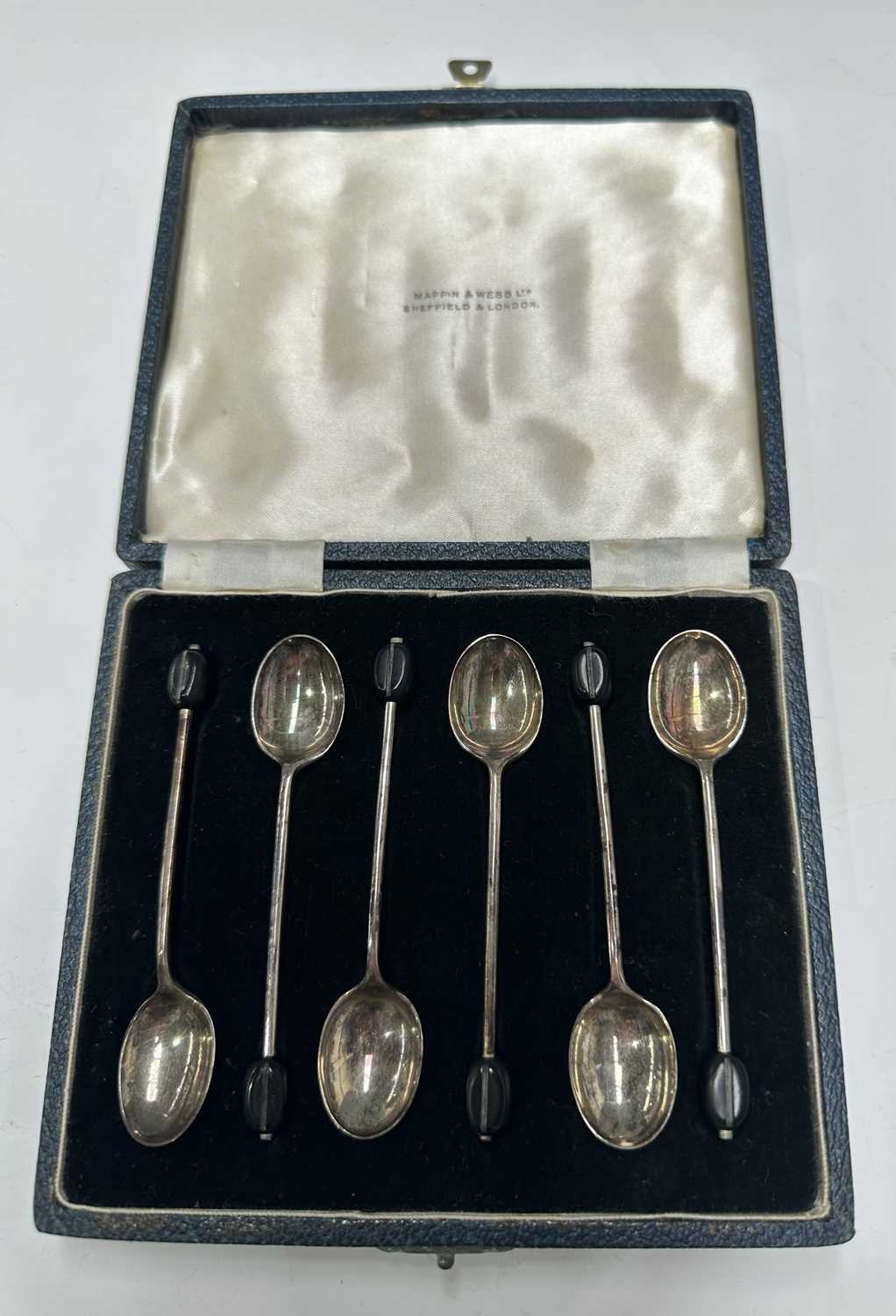 A collection of silver and plated flatware to include: six silver Mappin and Webb cased coffee spoons with coffee bean finials, six plated, cased, grapefruit spoons; salad forks, and a set of fruit spoons and forks, (4)