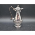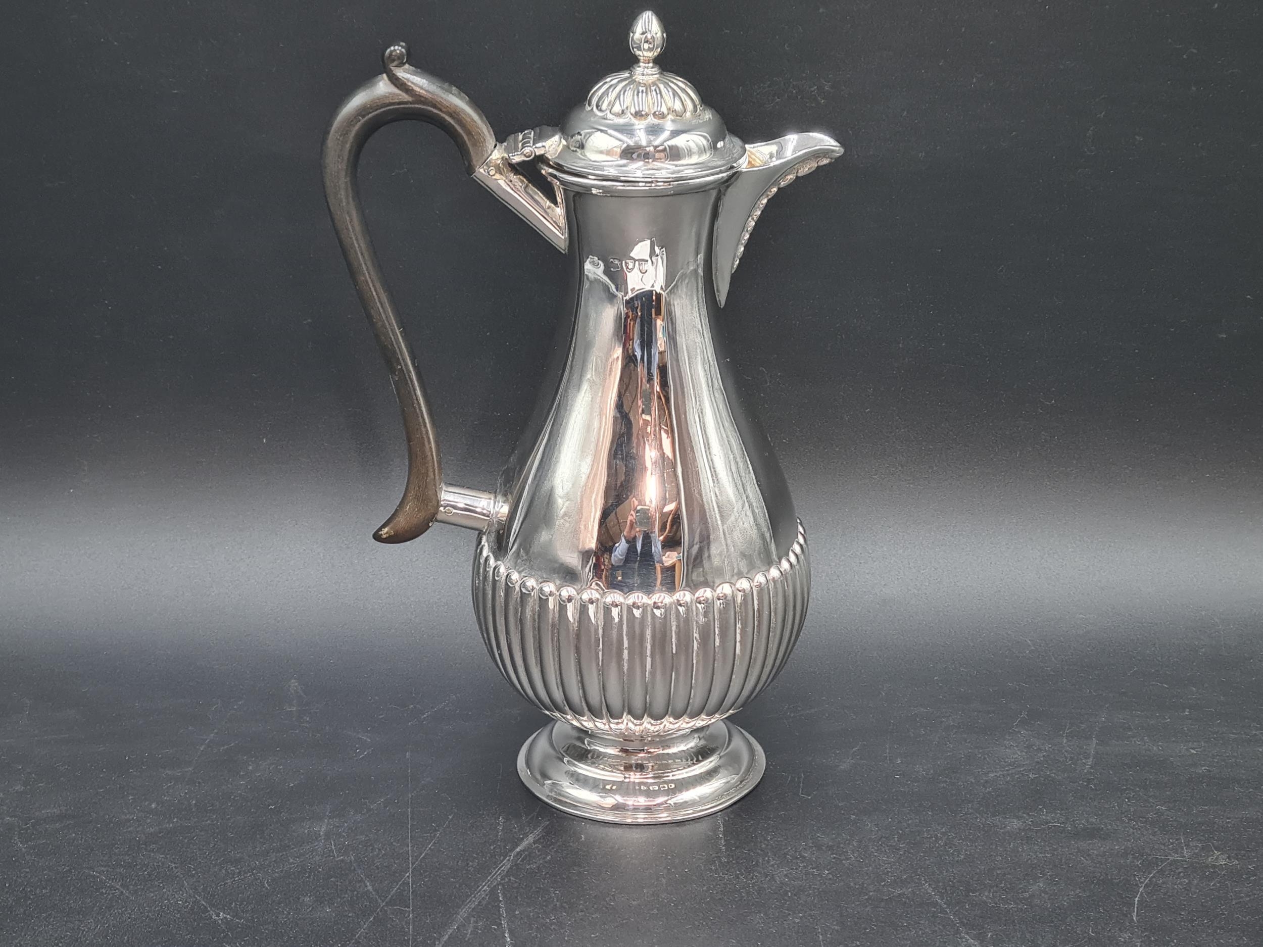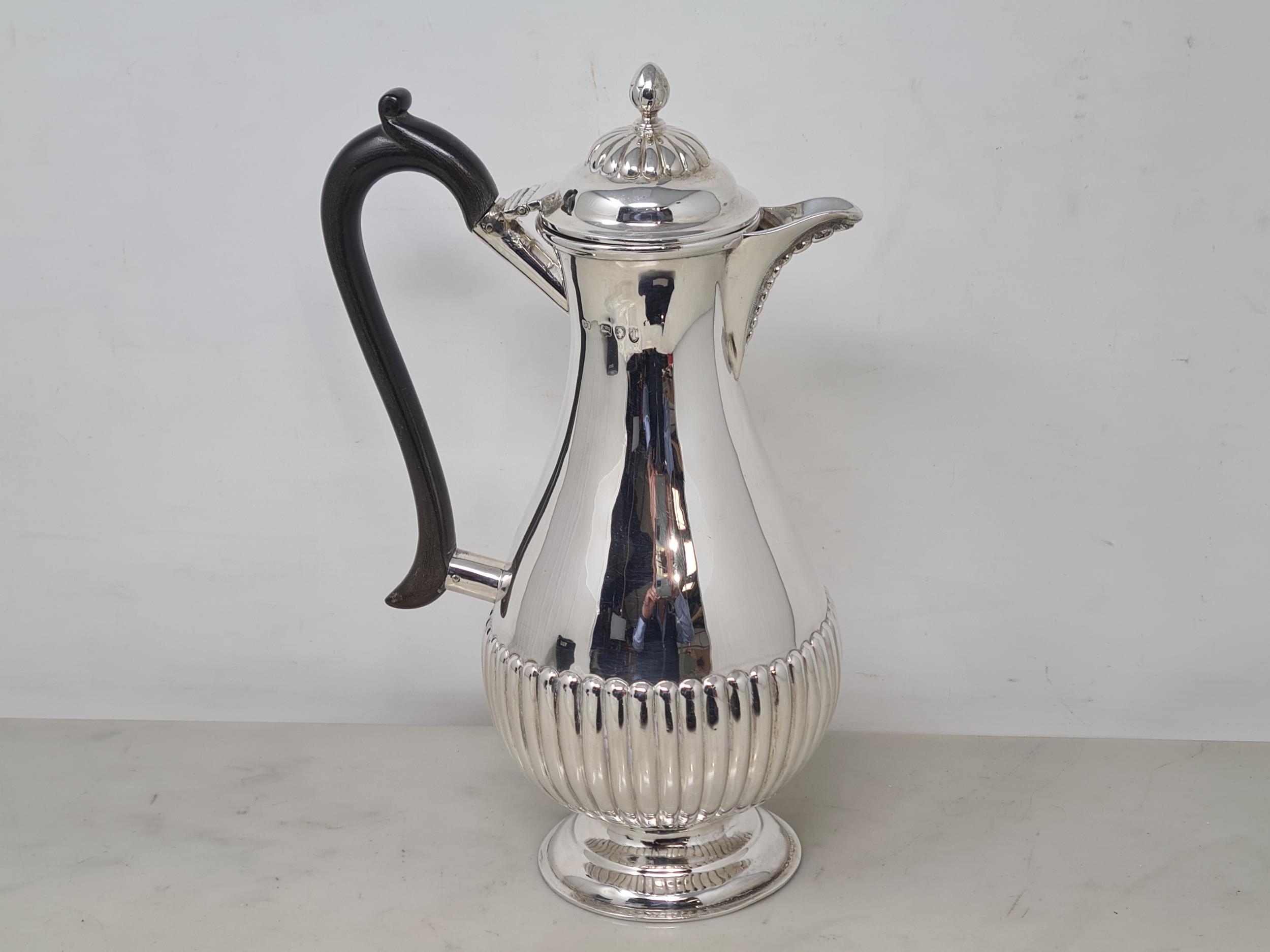 A Victorian silver Hot Water Jug of baluster semi-fluted form with acorn finial and ebonised scroll handle, London 1894, 356gms all in