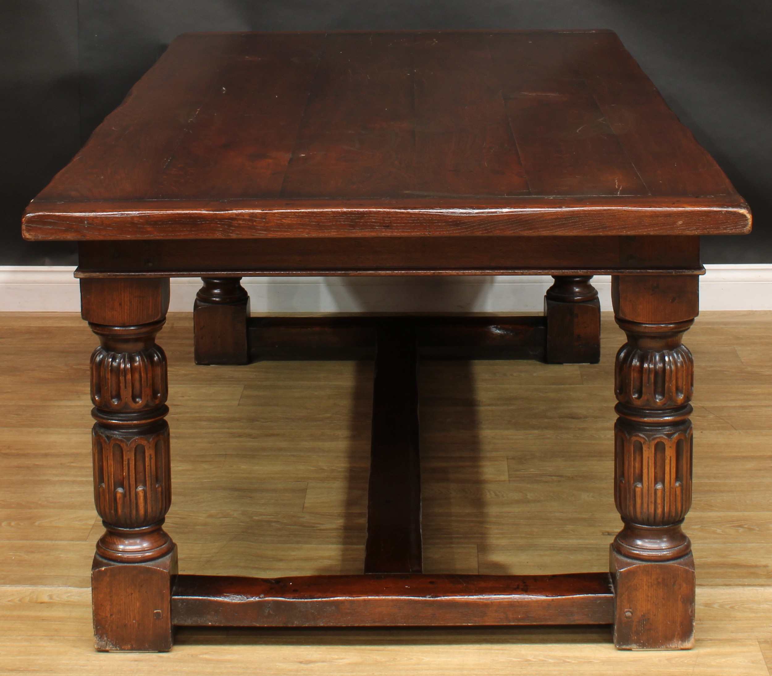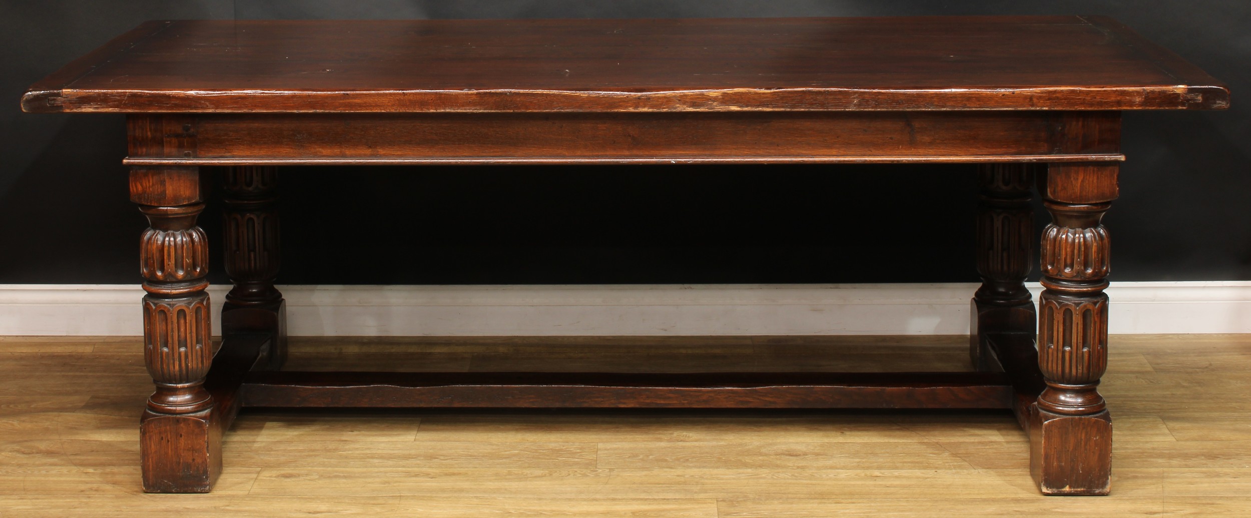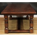 A 17th century style oak refectory type dining table, 77cm high, 213.5cm long, 106.5cm wide