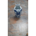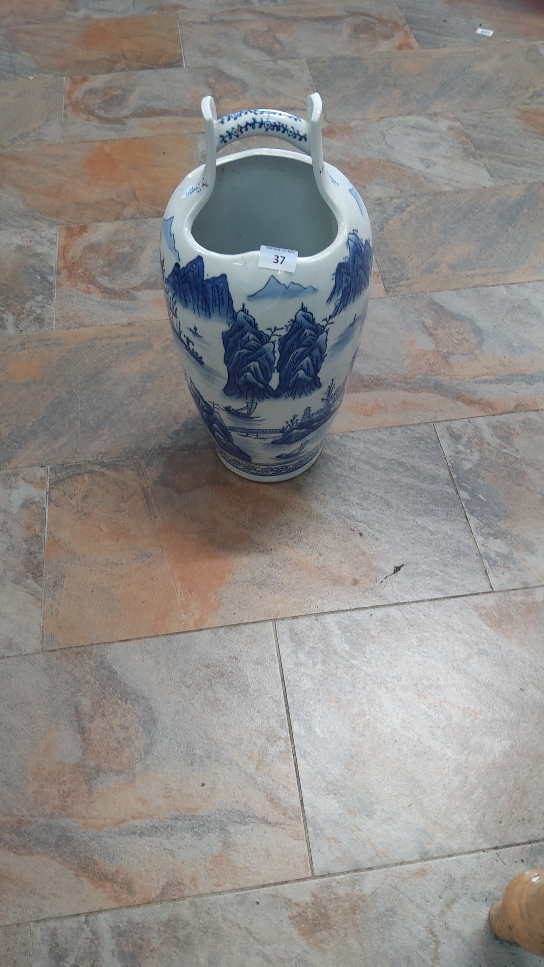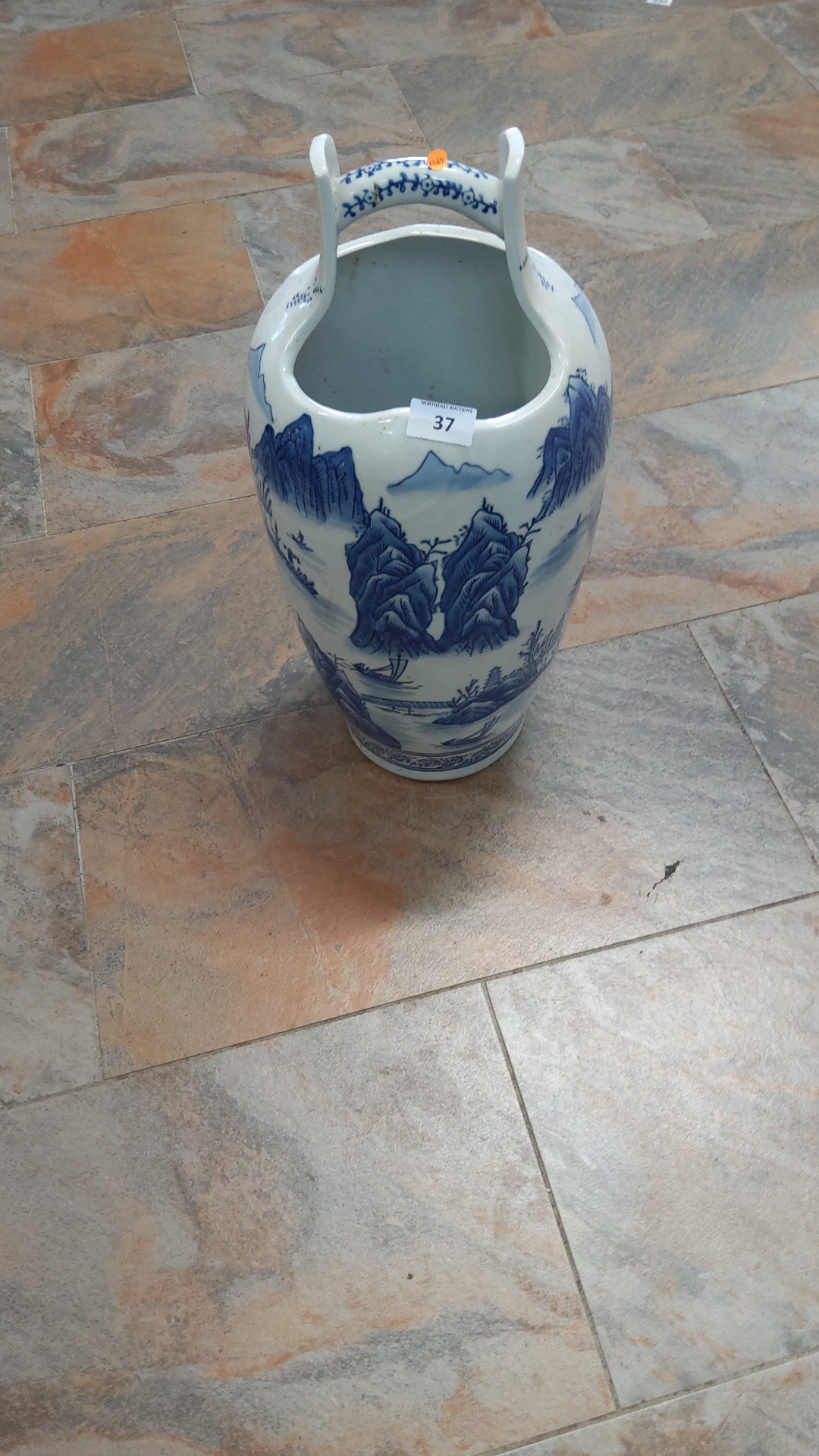 Tall porcelain stick/umbrella stand with yoke-form overhead handle, hand-painted in cobalt landscape scenes of mountains, pines and riverboats, unmarked, modern Chinese style.