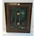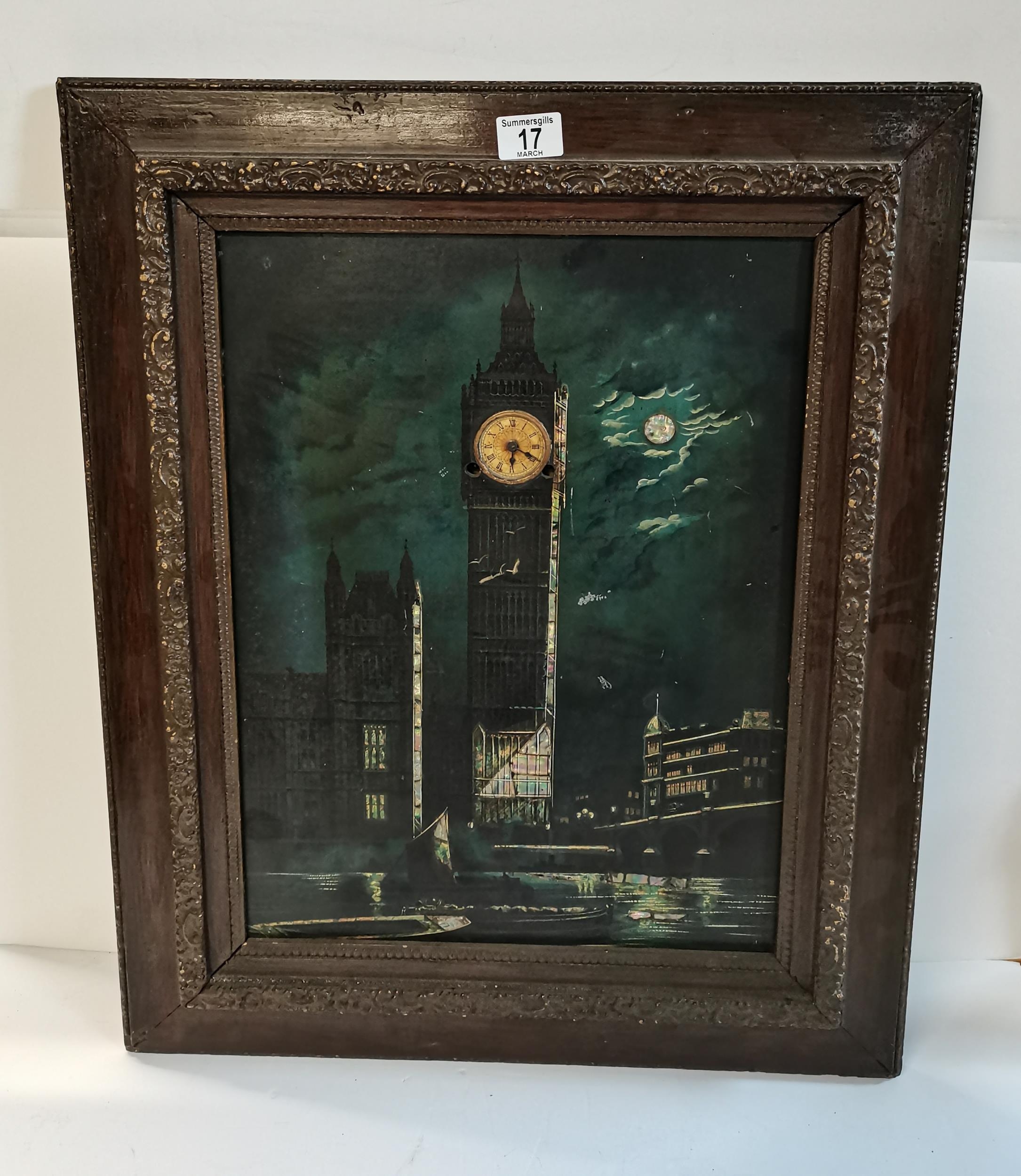 Edwardian Big Ben Picture clock with mother of pearl moon and boats on river in carved wooden frame 66cm x 55cm (incl frame)