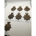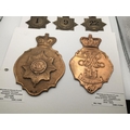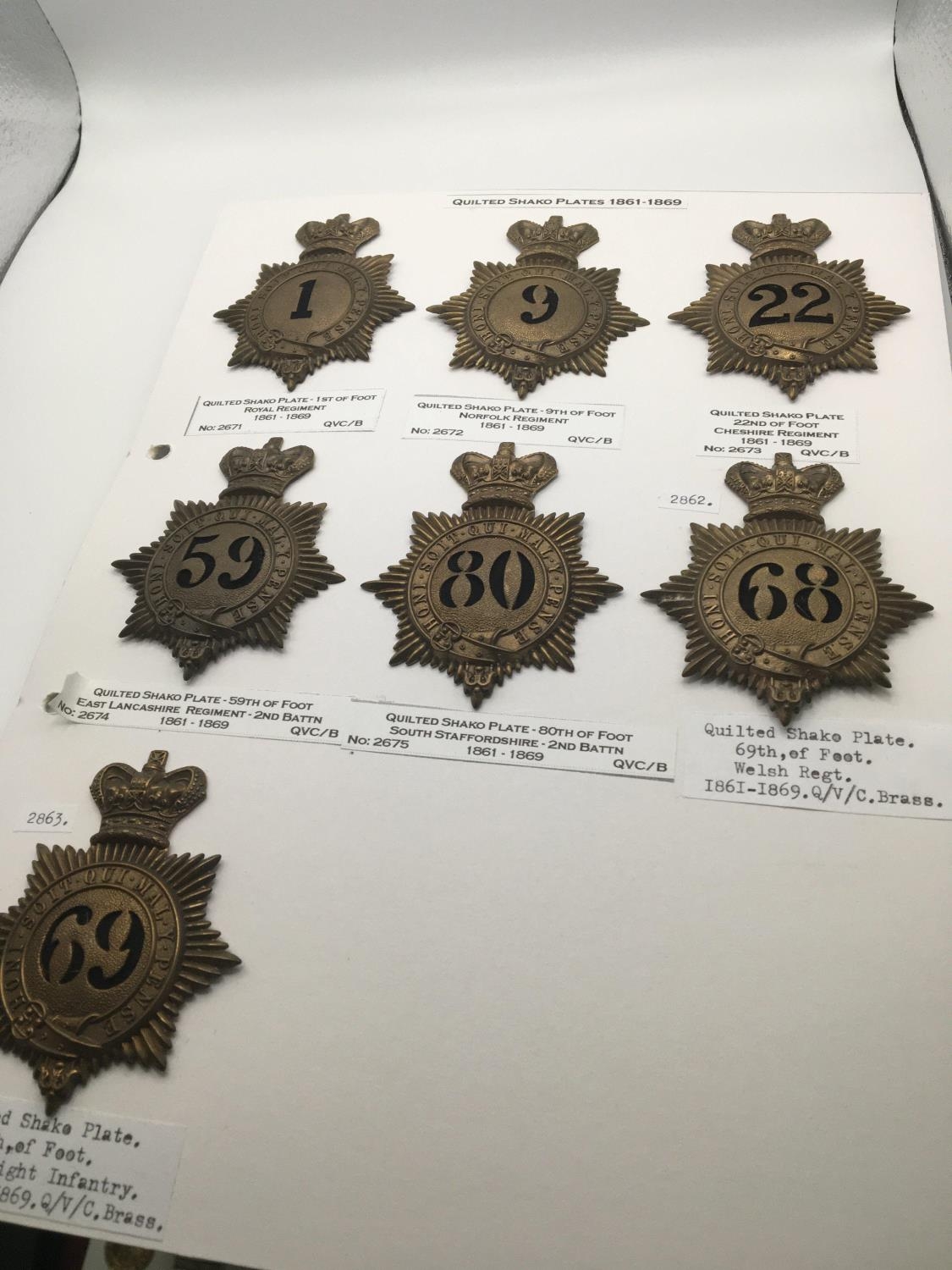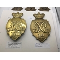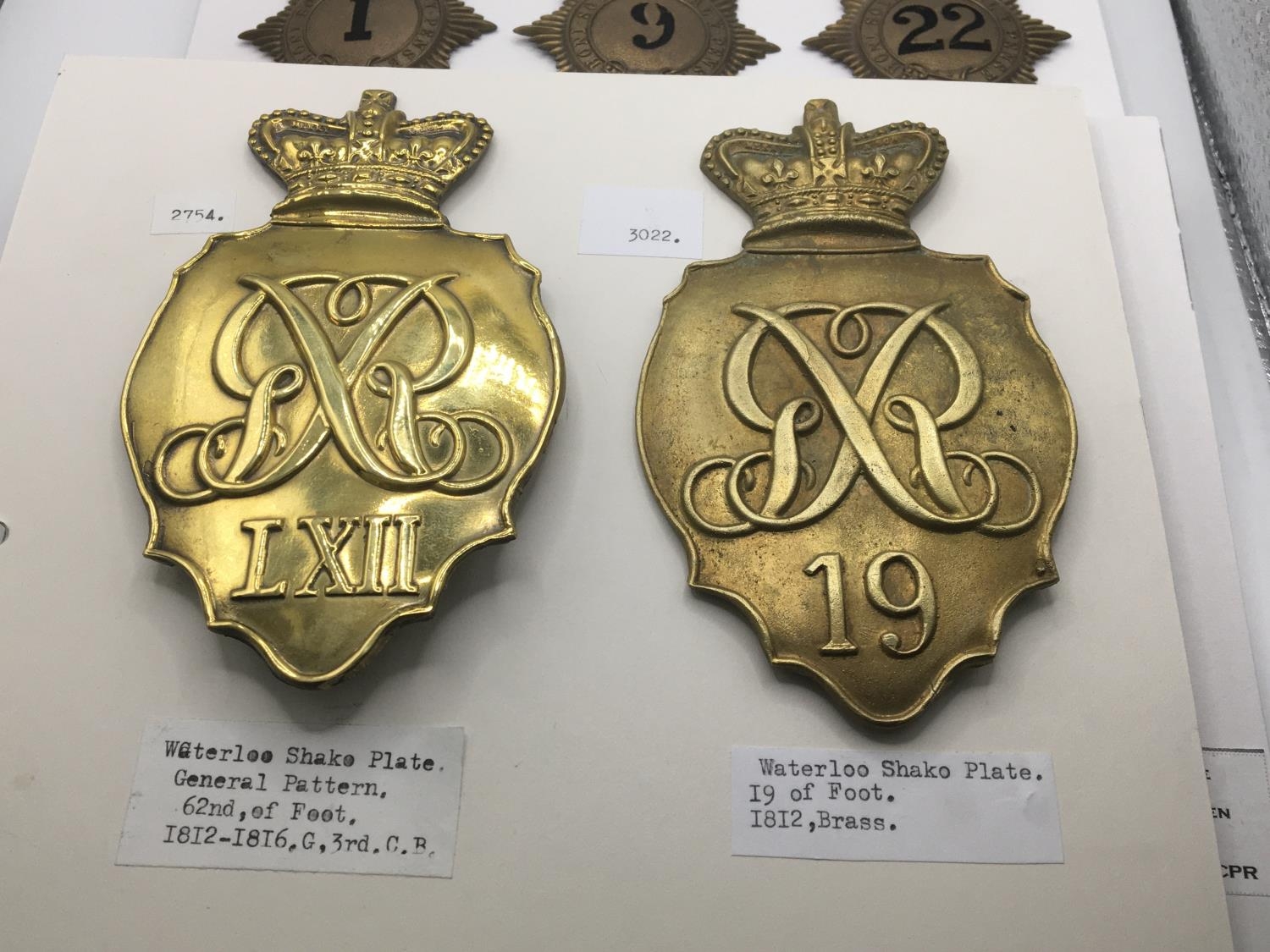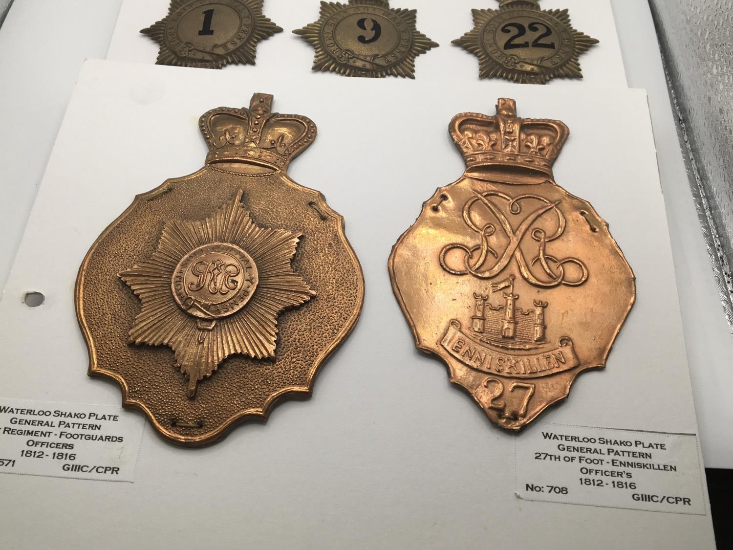 A collection of military shako plates retrospective copyâs of brass Waterloo plates and quilted Shako plates on three cards.
