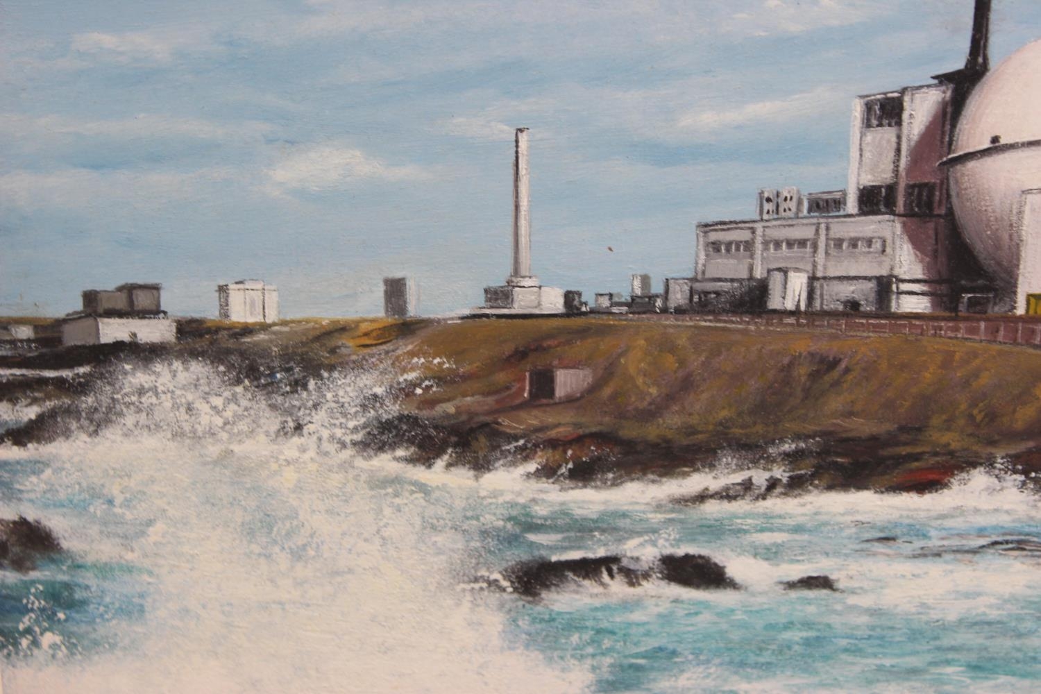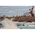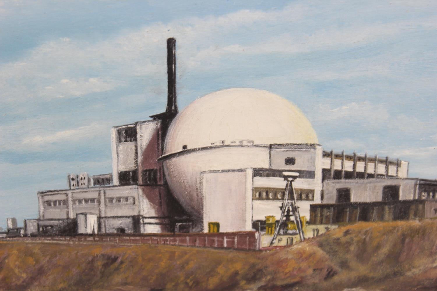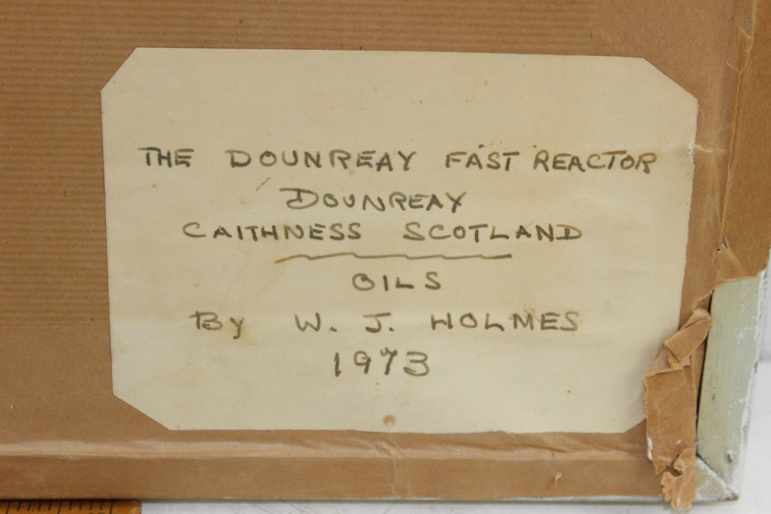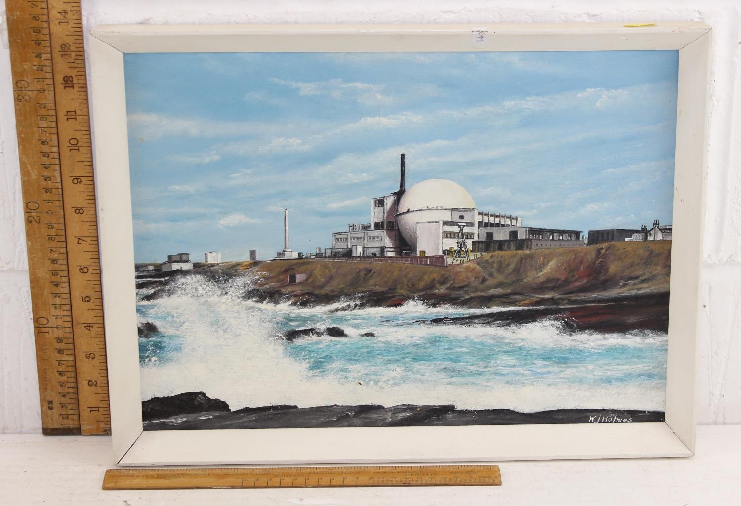 Detailed oil on board of the Dounreay Fast Reactor, Caithness Scotland, signed W.J. Holmes