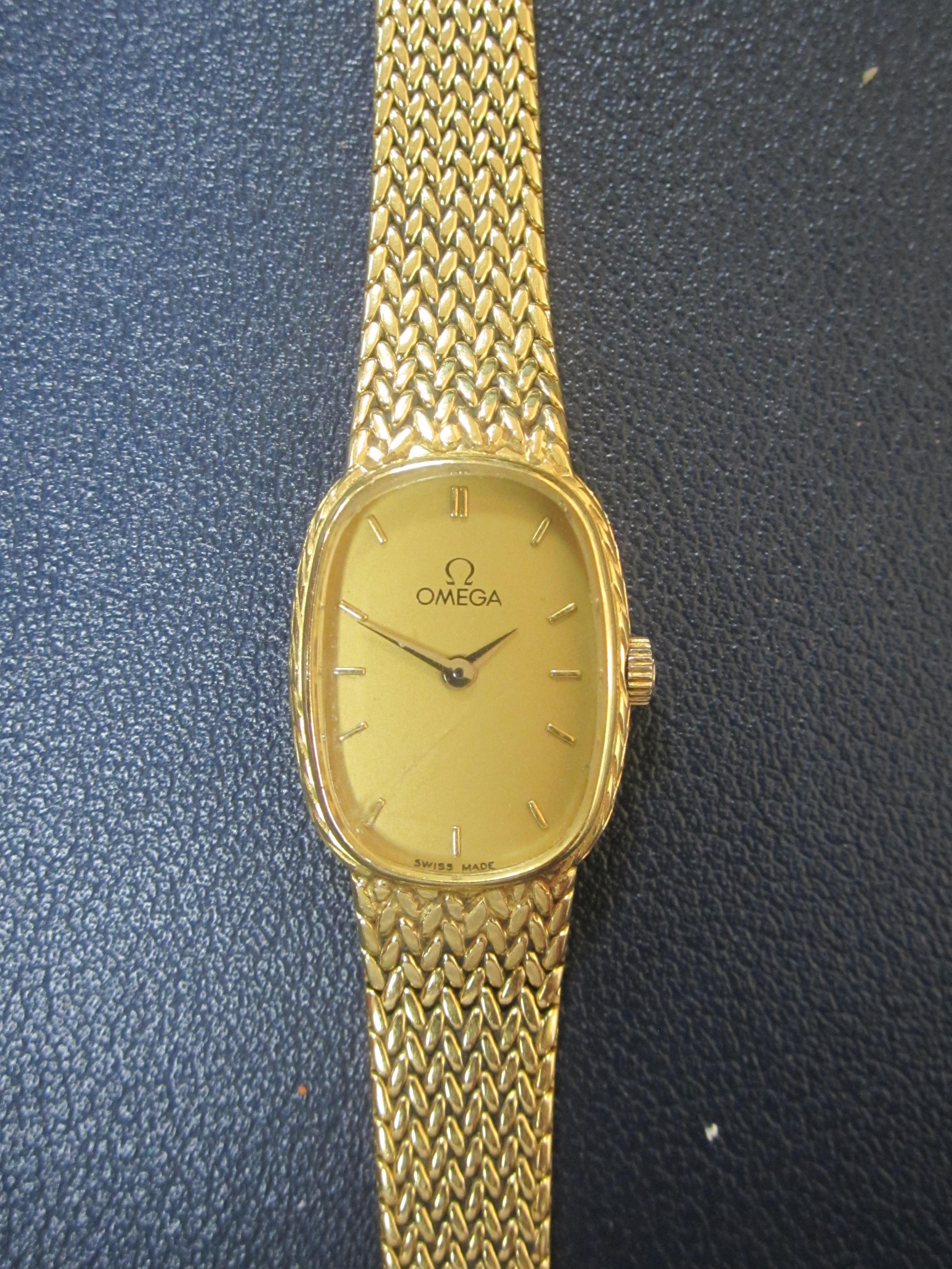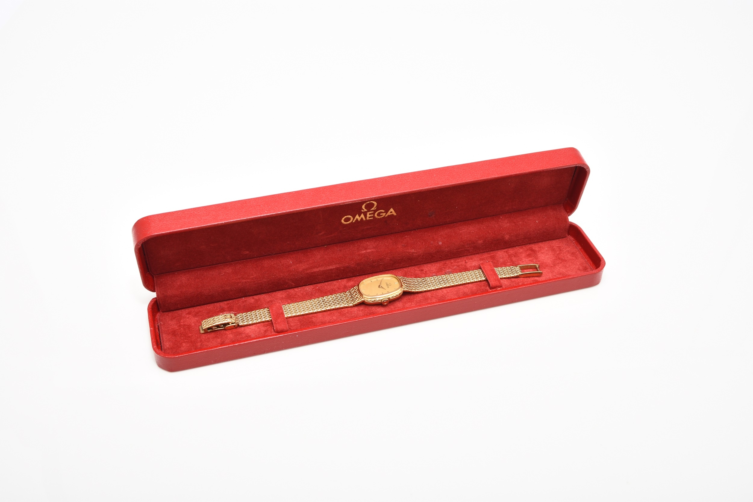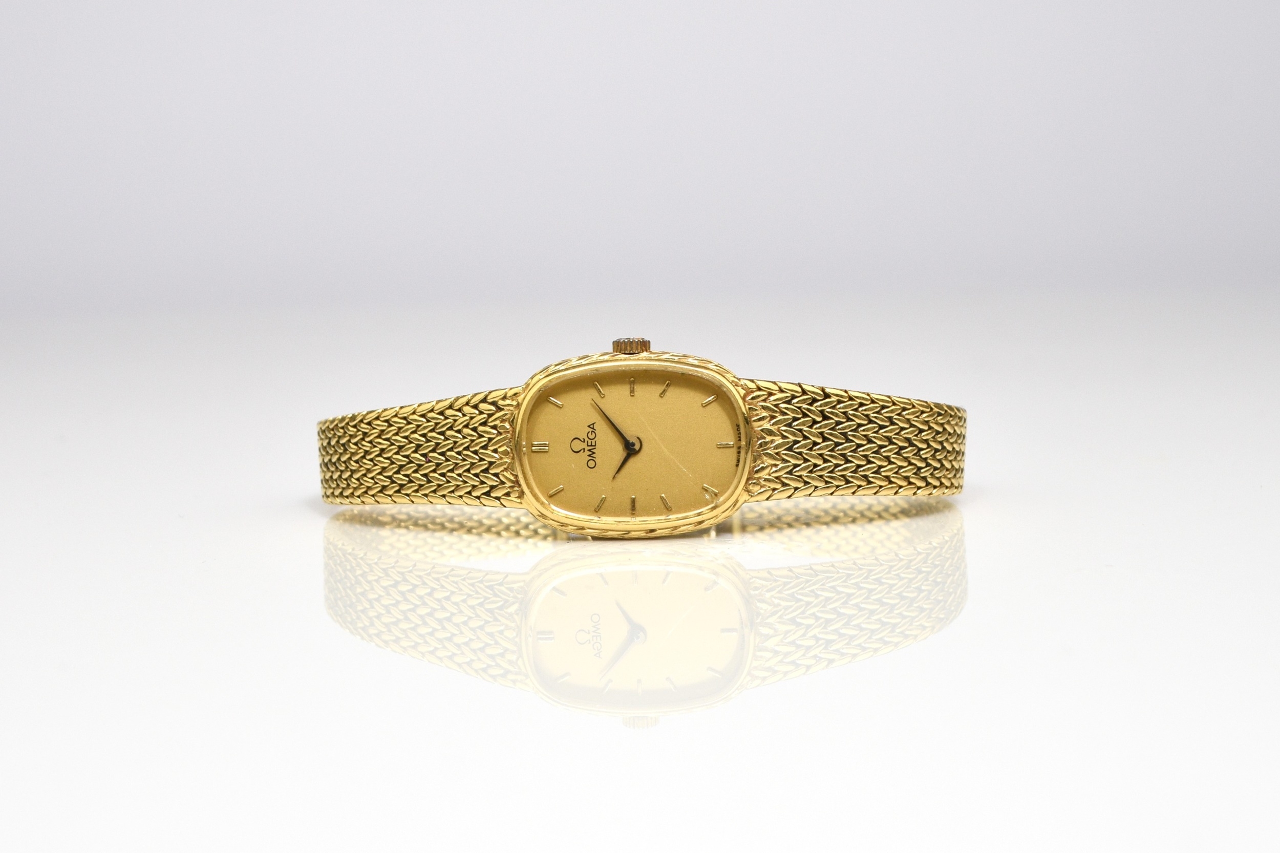 Omega: A lady's 18ct gold bracelet watch Reference: 791.338 Date: Circa 1982 Movement: Omega Cal.1455, 6 jewel, quartz Dial: Gold matt, applied baton hour markers, faceted gold hands Case: Textured and polished oval form, snap-on back, pull-out logo crown, stamped 18ct inside case back Strap/Bracelet: Integral mesh bracelet Buckle/Clasp: Textured logo jewellery clasp, stamped 18ct Size: 17mm Weight: 31g gross Accompaniments: Omega box Condition:• Case and back: Minor abrasions consistent with age and use. Some wear to plating on crown. • Crystal: Some visible scratches at 7 and a tiny chip to the edge also at 7. • Dial: Good. • Hands: Good. • Strap: Good. • Movement: Requires new battery. Not tested. Unless otherwise stated, all watches are likely to have been serviced and/or repaired in their lifetime and may have had parts replaced. While a watch may be described as 'working' at the time of the report, they are not guaranteed for timekeeping - it is advised that all watches are inspected and serviced by a qualified jeweller or horologist before full use.